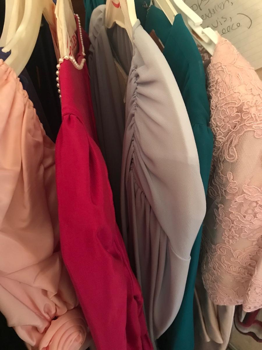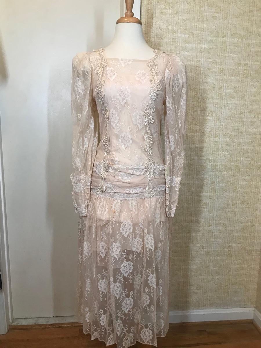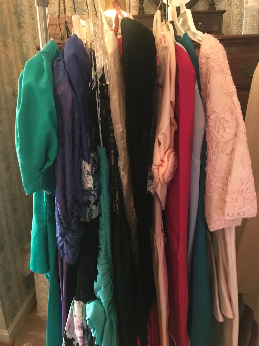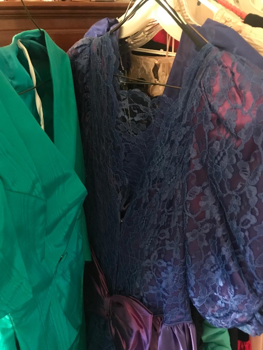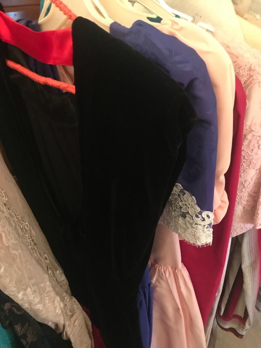 14 vintage dresses most in good vintage condition (some have slight discoloration or in need of small repairs). Lace, satin, cotton, velvet. Sizes and lengths vary small medium and large. Long, A-line and mini.