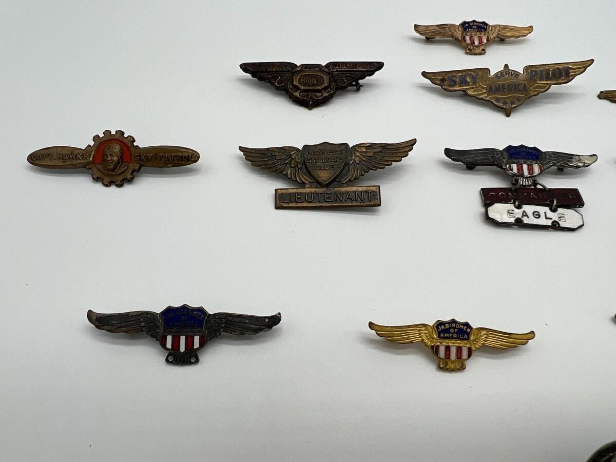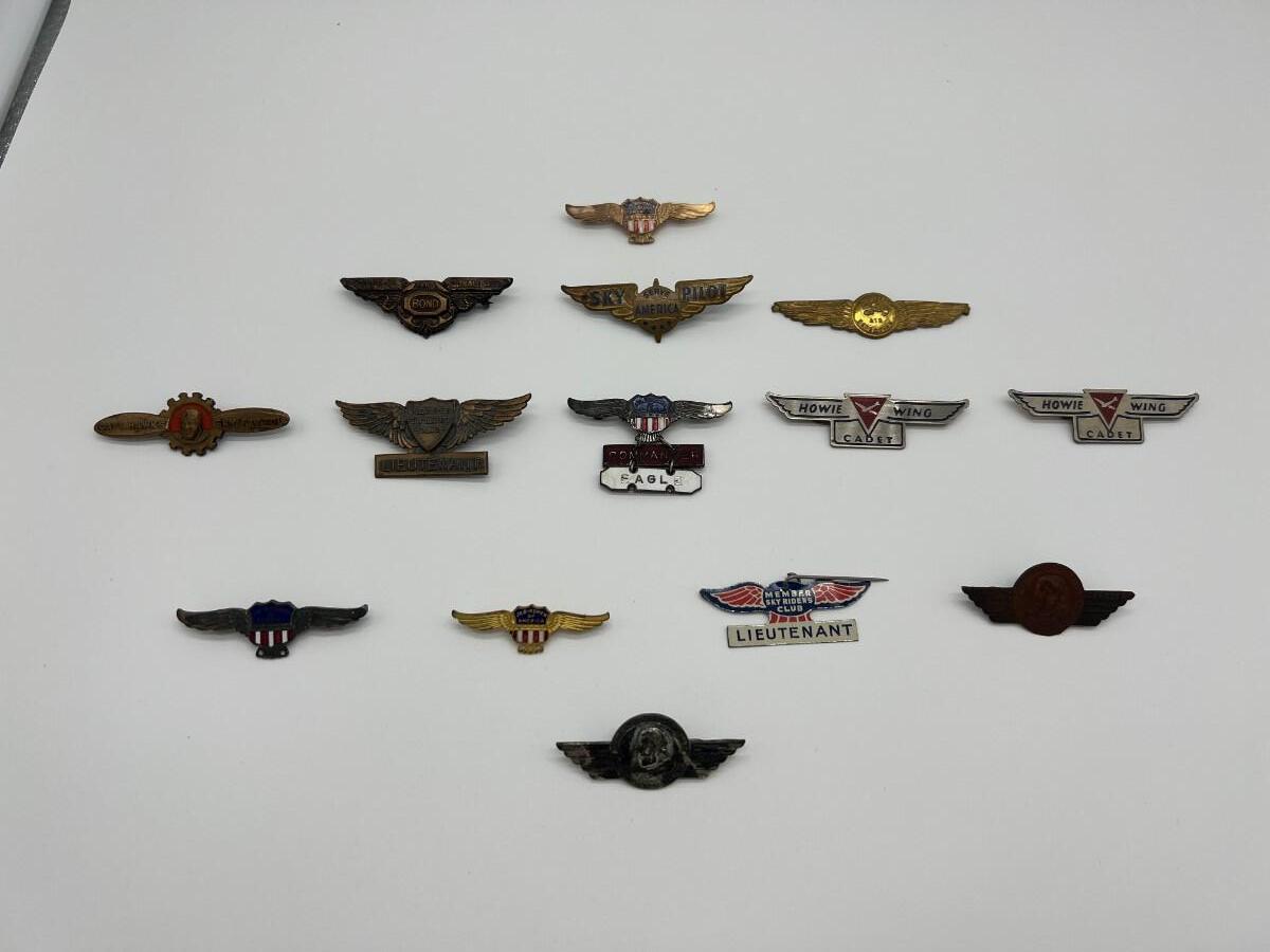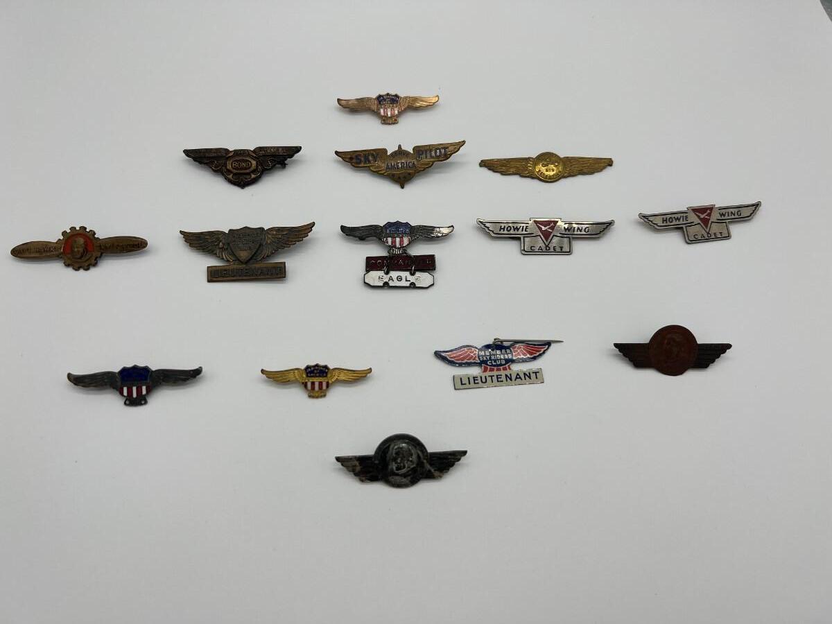 Lot of 14 Vintage Air Pins Wings Pins with Pin Backs. Includes 1930s Sky Pilot, Howie Wing Cadet, Sky Riders Club, Dick Tracy Air Detective, 1930s Donald Ayer Bond, and World War Two WW2 Jr. Birdmen.
