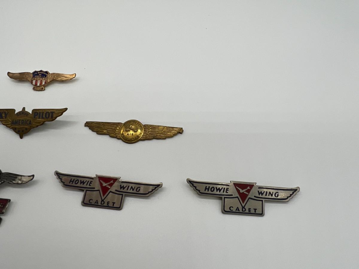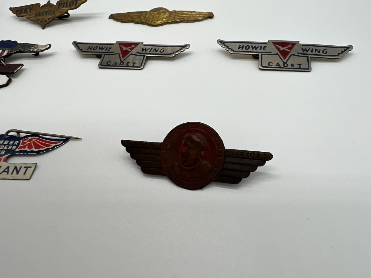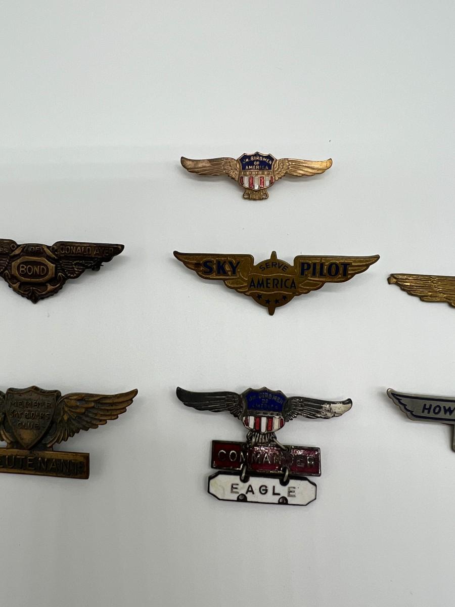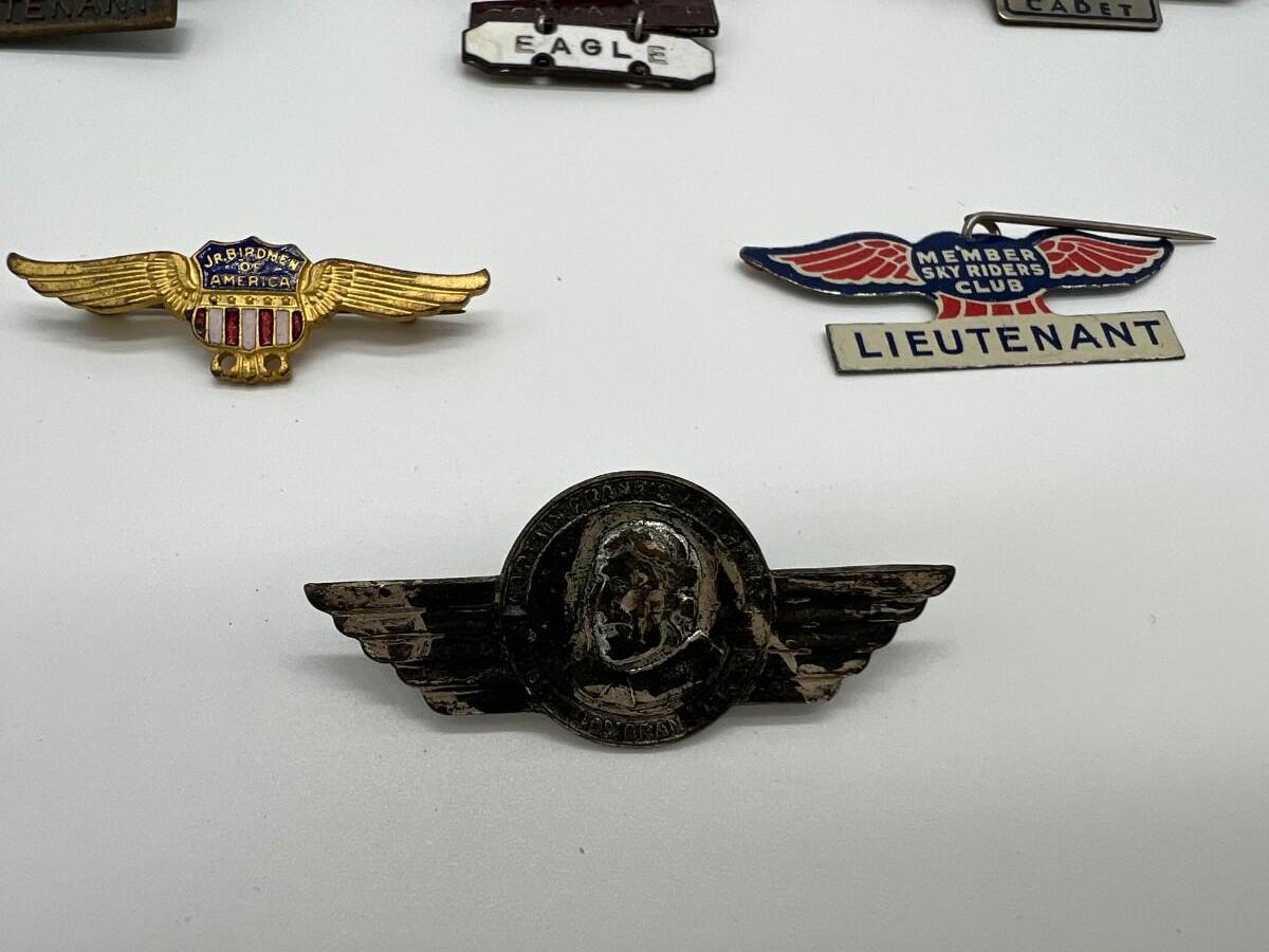 Lot of 14 Vintage Air Pins Wings Pins with Pin Backs. Includes 1930s Sky Pilot, Howie Wing Cadet, Sky Riders Club, Dick Tracy Air Detective, 1930s Donald Ayer Bond, and World War Two WW2 Jr. Birdmen.