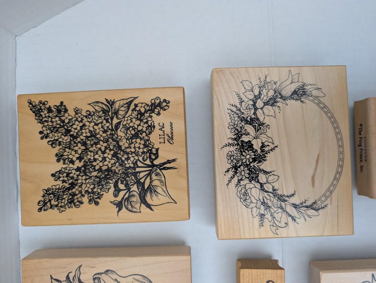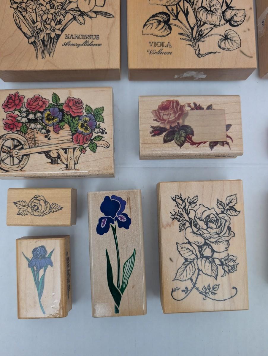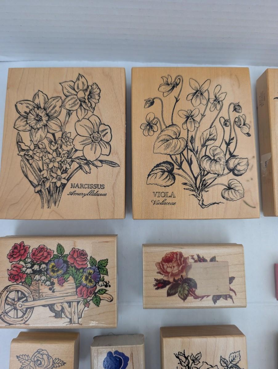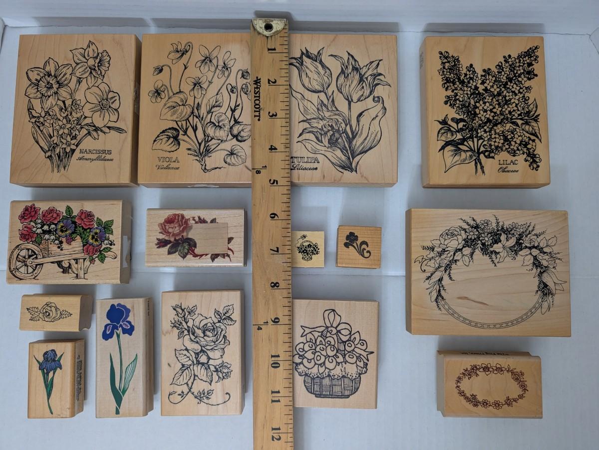 Lot of 15 Wooden Rubber Stamps Flowers Roses Tulips Lilac Iris Botanical Crafting