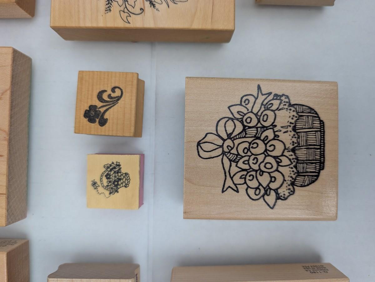 wooden rubber stamps, floral stamps, rose stamp, tulip stamp, lilac stamp, iris stamp, narcissus stamp, viola stamp, flower basket stamp, wreath stamp, botanical rubber stamps, vintage craft stamps, cardmaking supplies, scrapbooking lot, estate craft collection