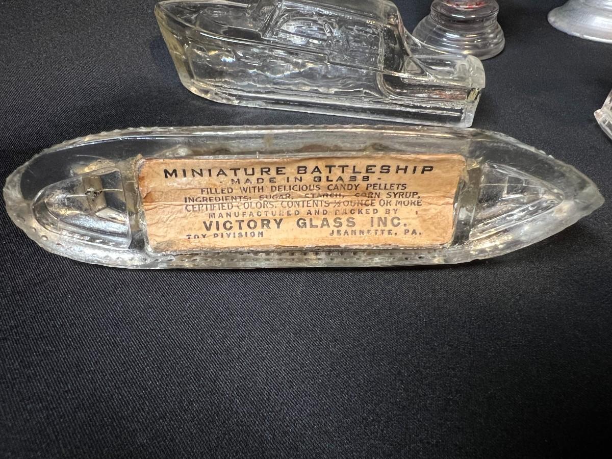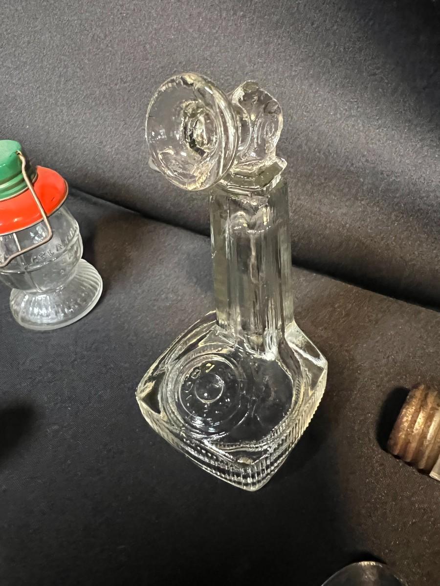 Lot of 16 Antique Glass Candy Jars Shaped Like Cars, Tank, Planes, Boats, Train, Guns, Telephone, and Lanterns