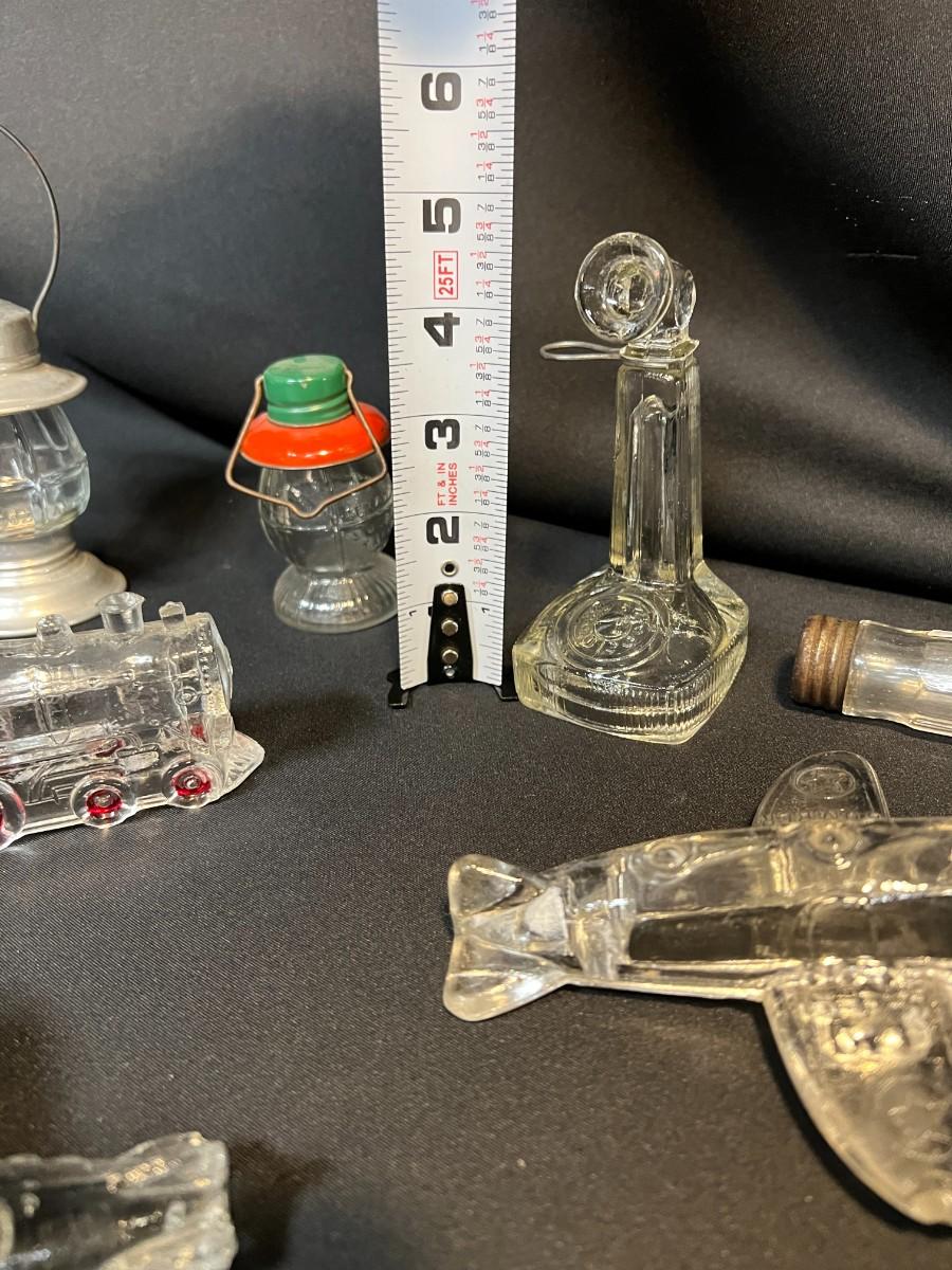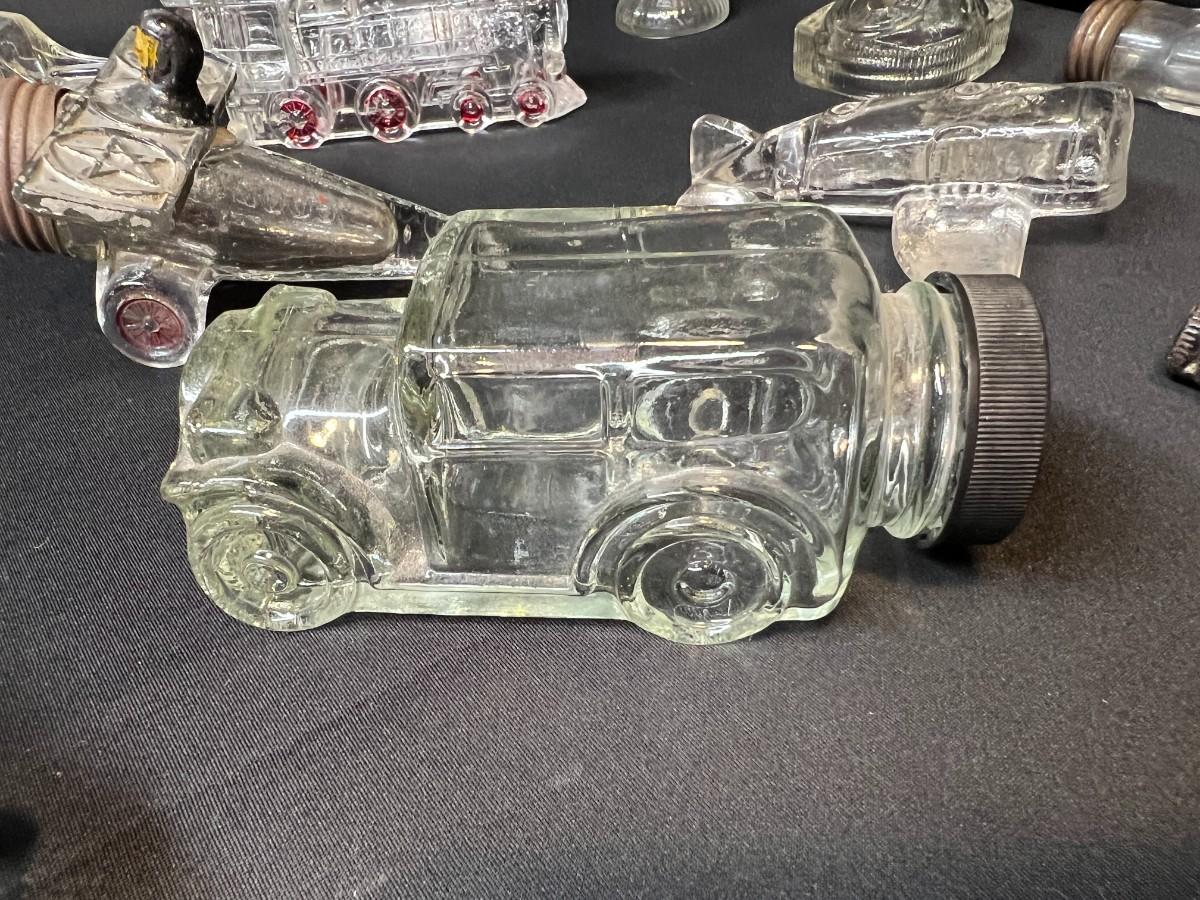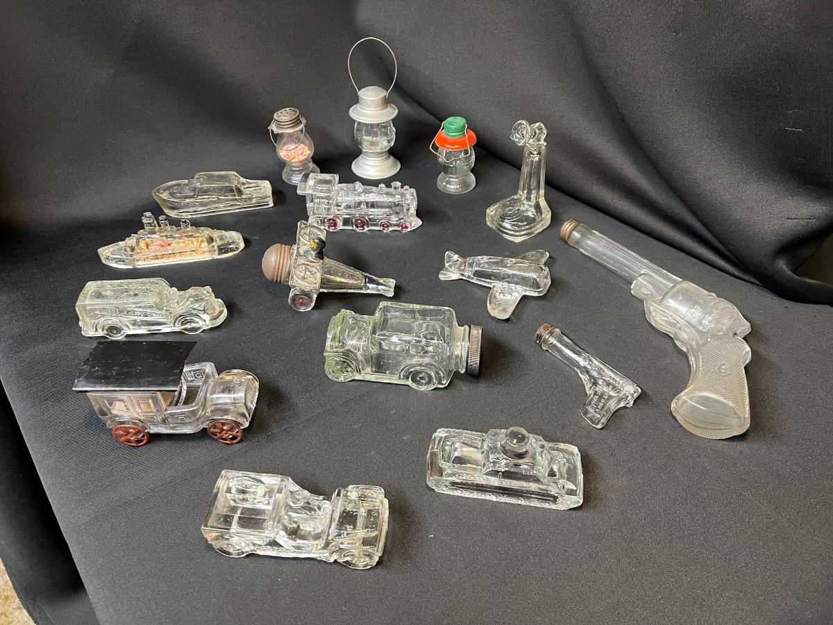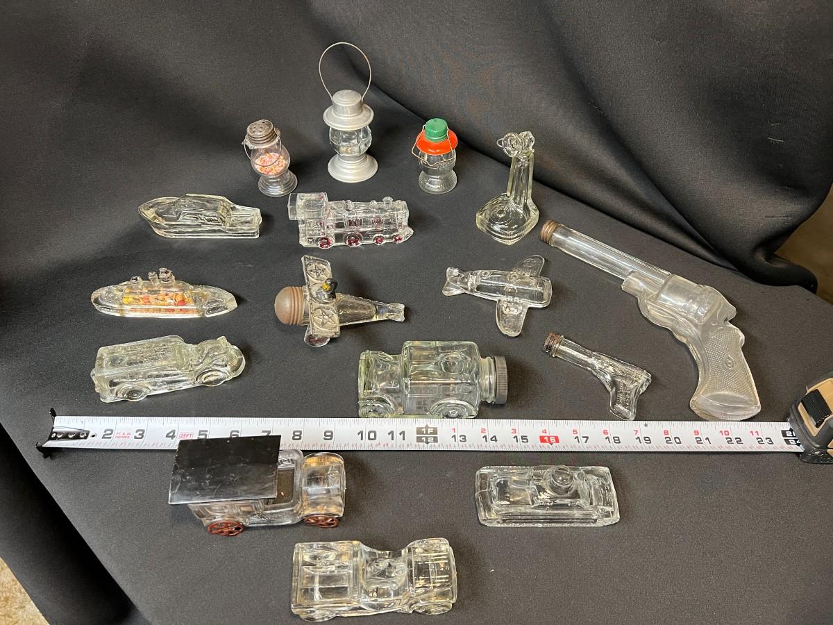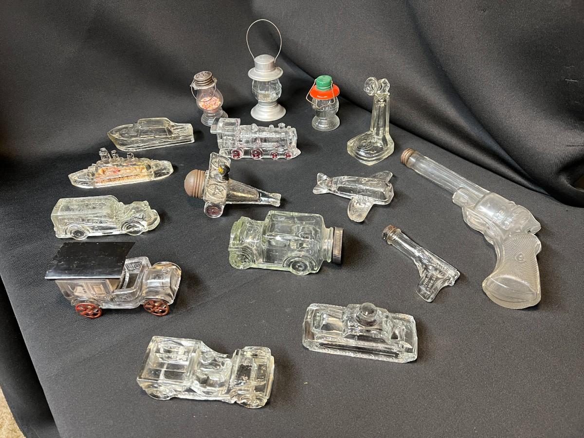 Lot of 16 Antique Glass Candy Jars Shaped Like Cars, Tank, Planes, Boats, Train, Guns, Telephone, and Lanterns. Includes a locomotive train, glass pistol, antique automobiles, and one unopened boat. Conditions are as shown.