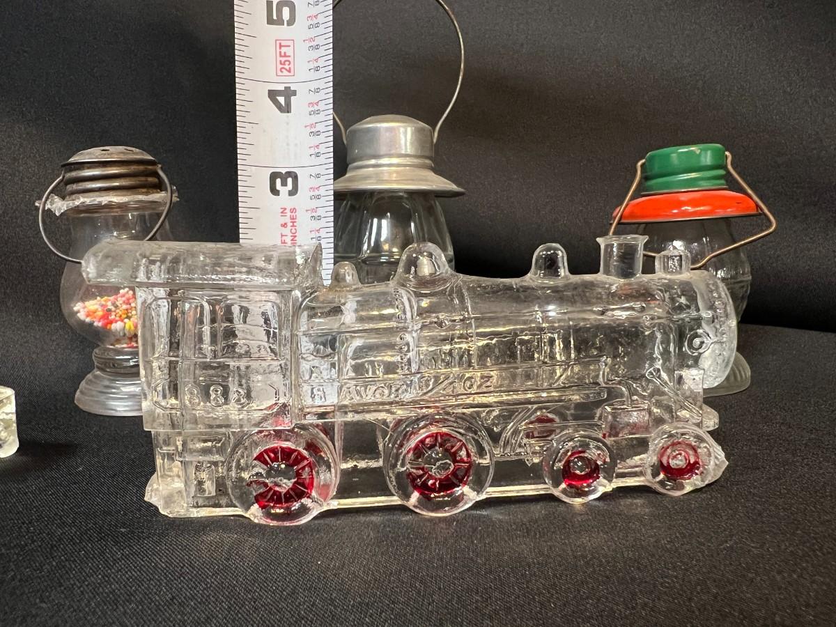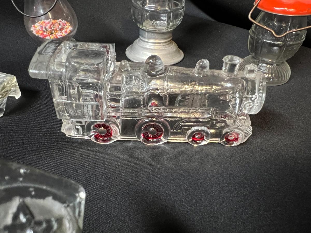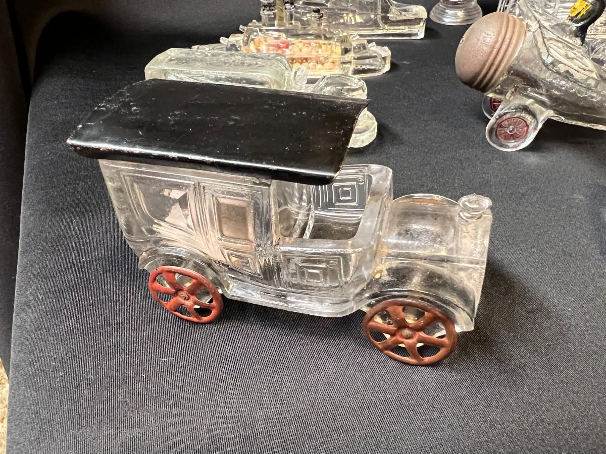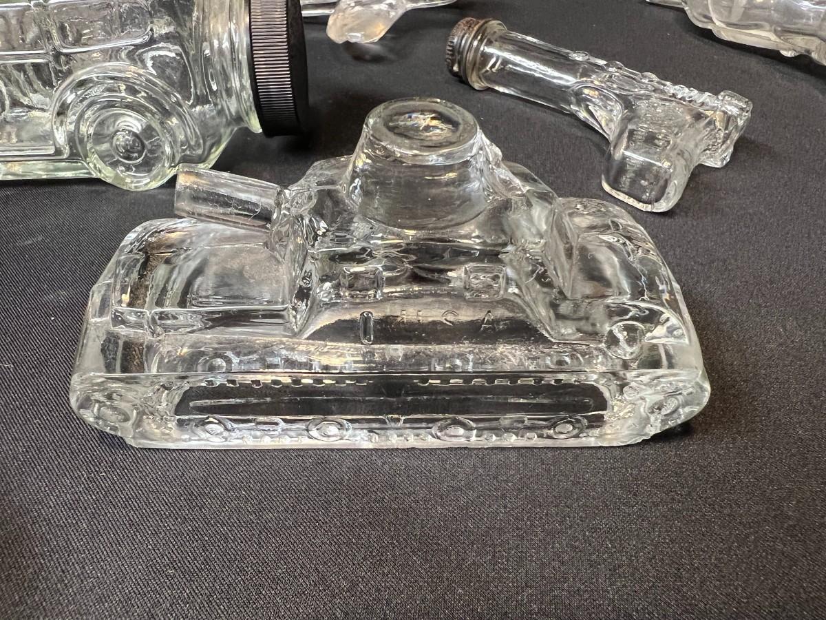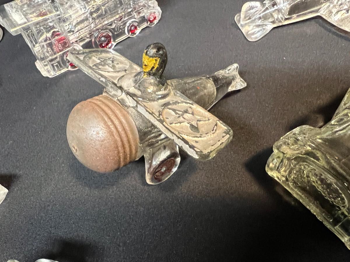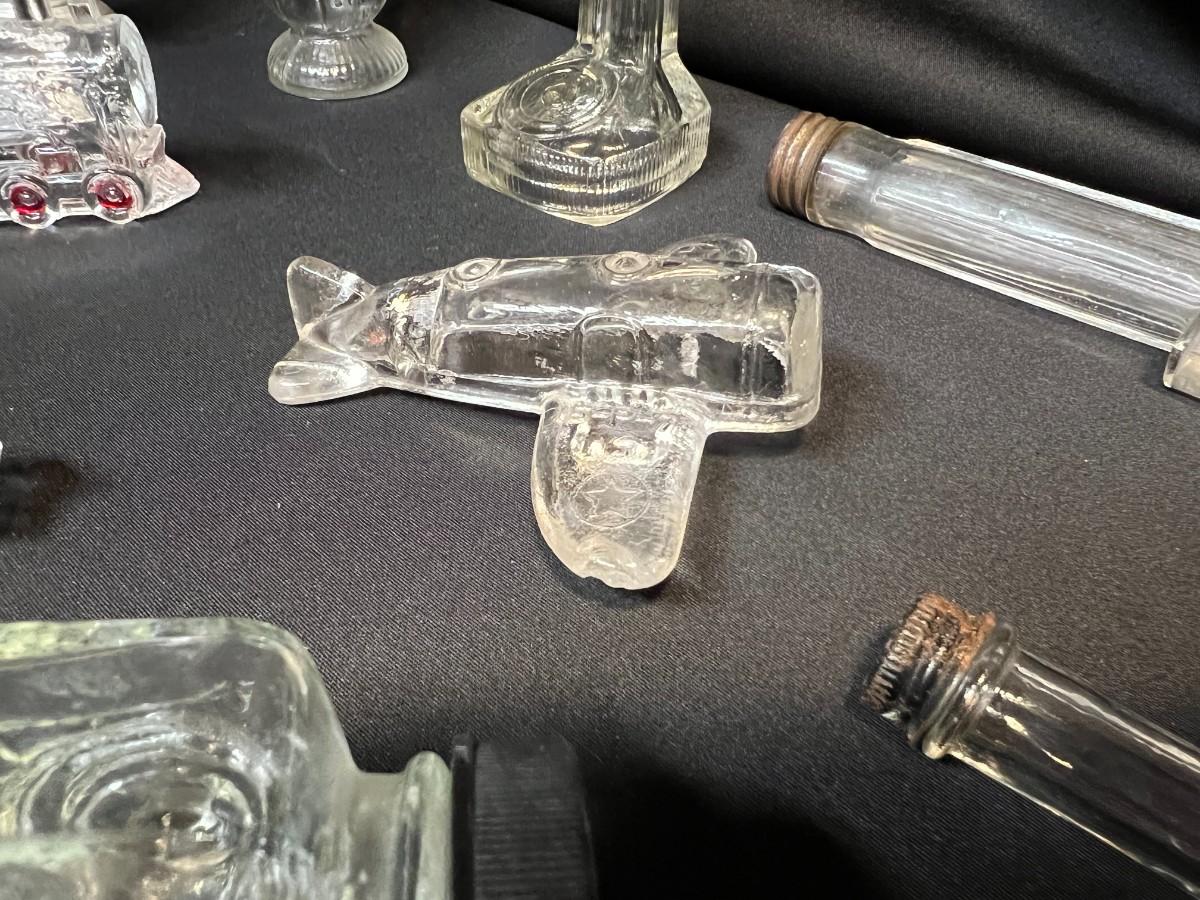 Lot of 16 Antique Glass Candy Jars Shaped Like Cars, Tank, Planes, Boats, Train, Guns, Telephone, and Lanterns. Includes a locomotive train, glass pistol, antique automobiles, and one unopened boat. Conditions are as shown.
