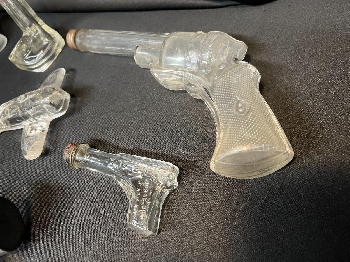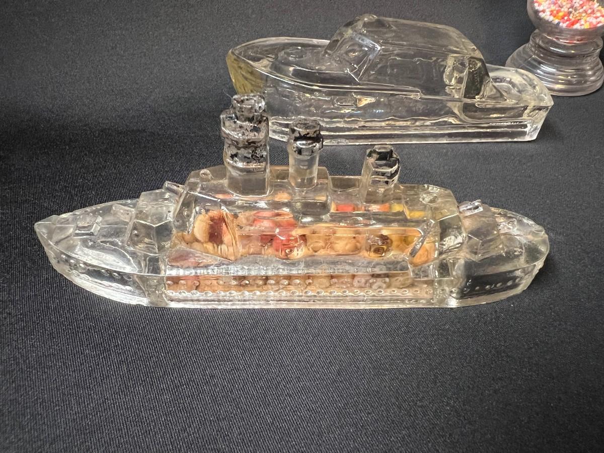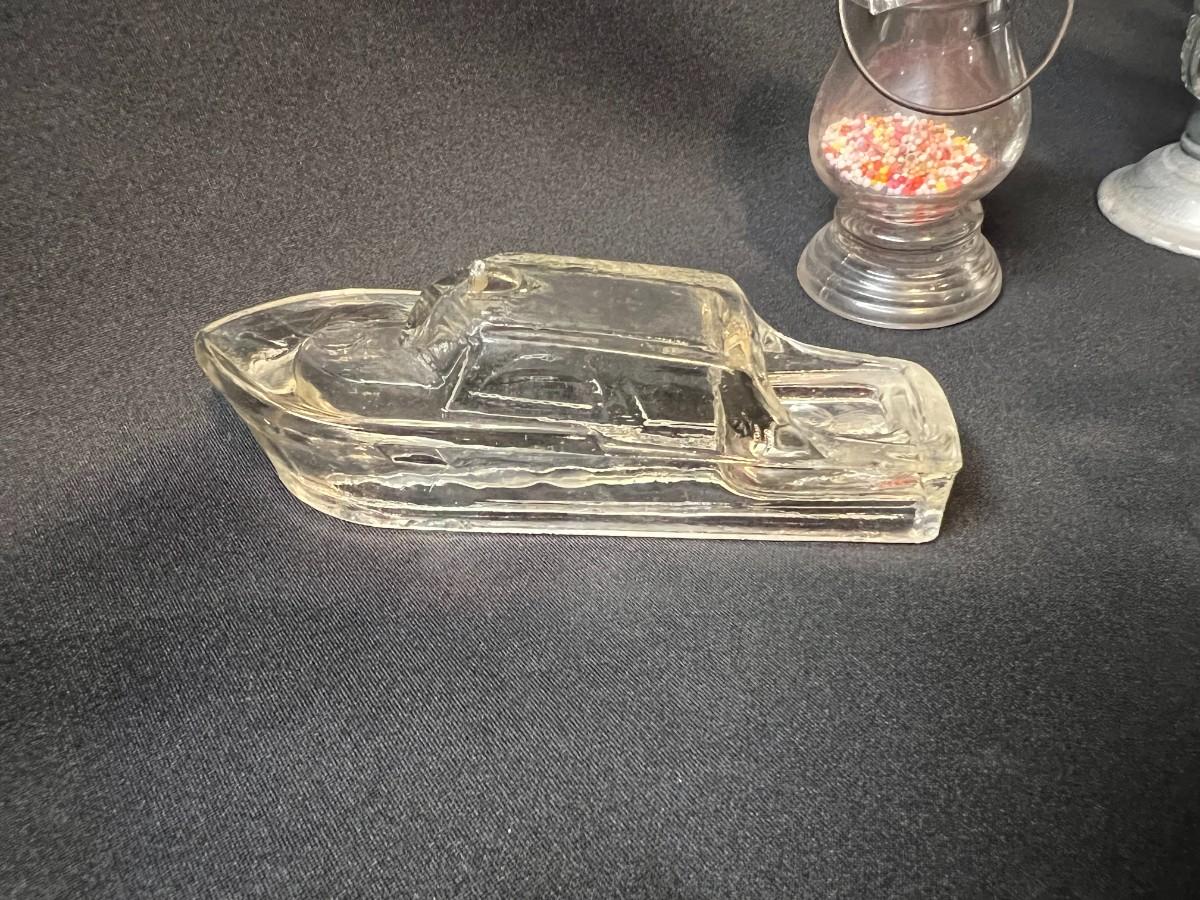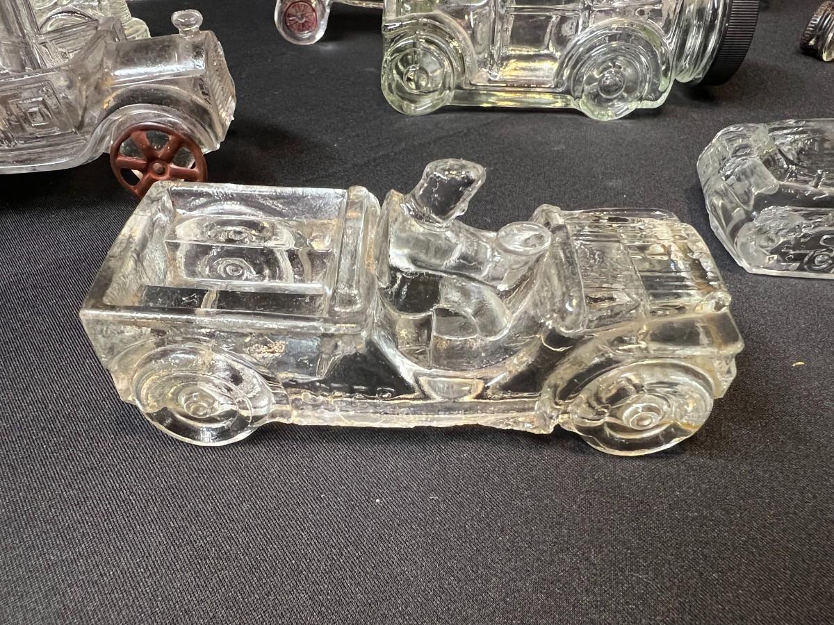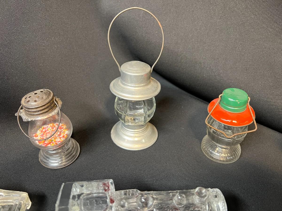 Lot of 16 Antique Glass Candy Jars Shaped Like Cars, Tank, Planes, Boats, Train, Guns, Telephone, and Lanterns. Includes a locomotive train, glass pistol, antique automobiles, and one unopened boat. Conditions are as shown.