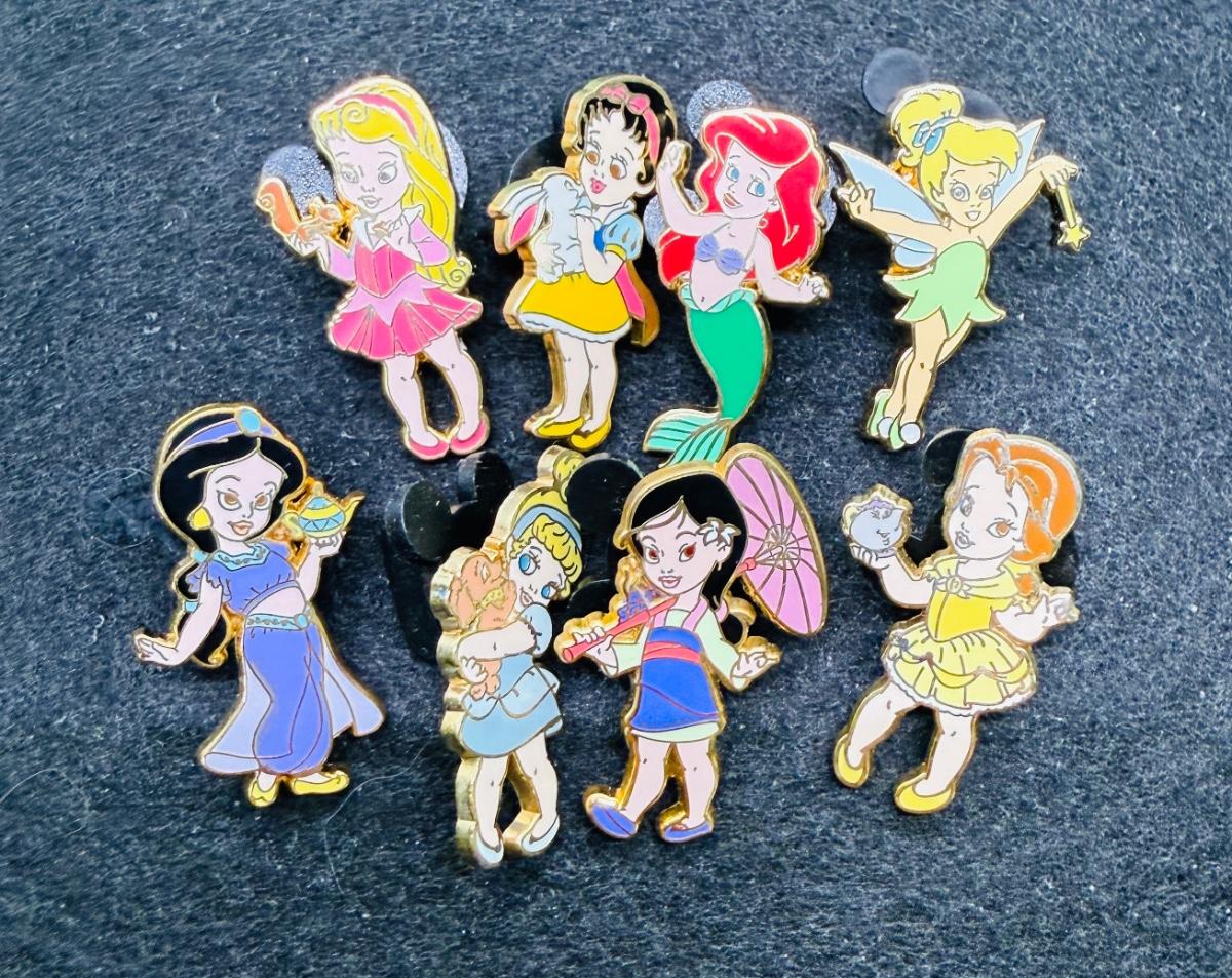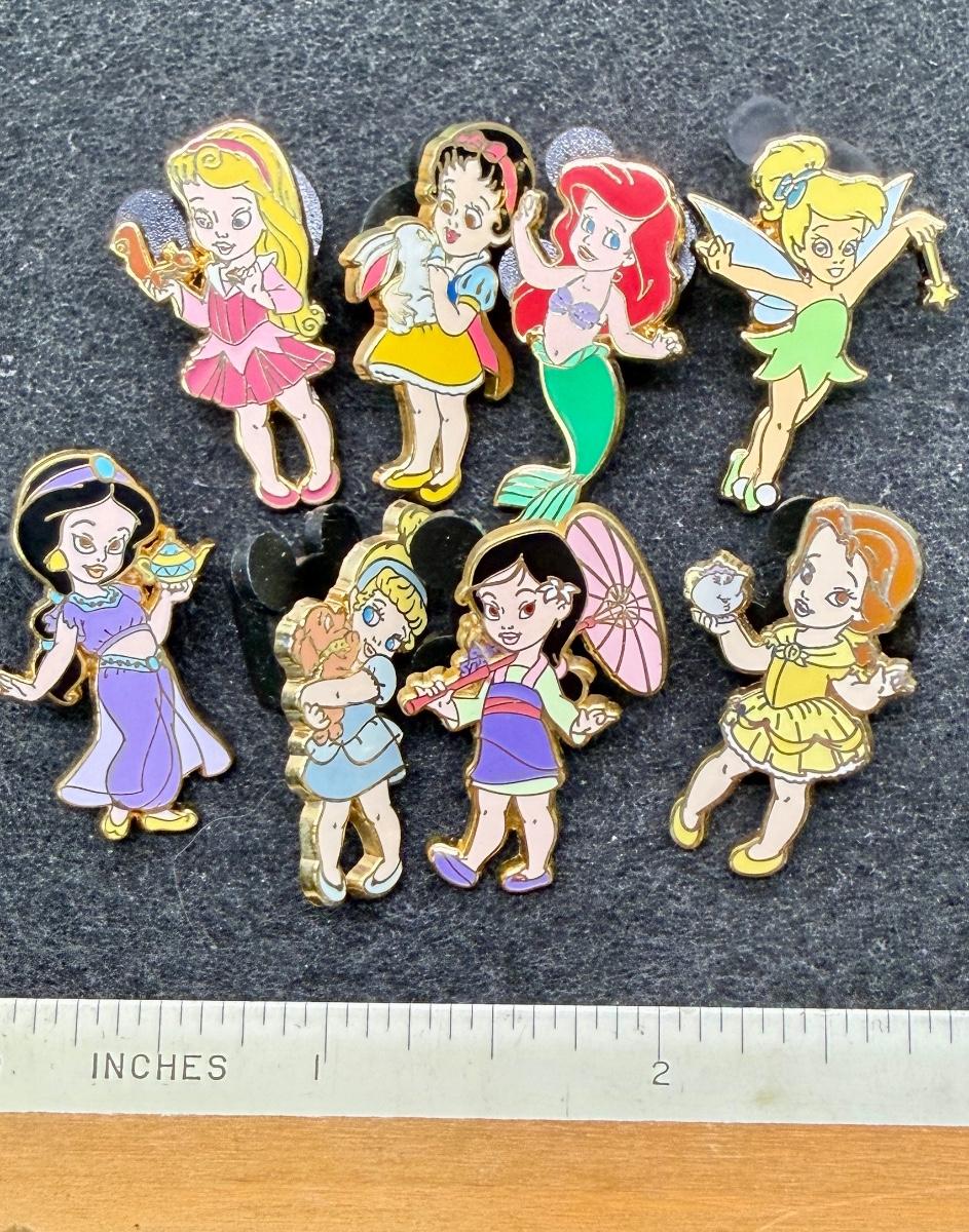 Set of 17 pins. The collection includes Princesses such as Ariel, Aurora, Belle, Cinderella, Jasmine, and Snow White. They were released as part of an Open Edition Mini Pin Boxed set, with seven pins showing the princesses as toddler/babies. Regularly sell online for $10 ea. Came from the home of a Disneyland Cast Member.