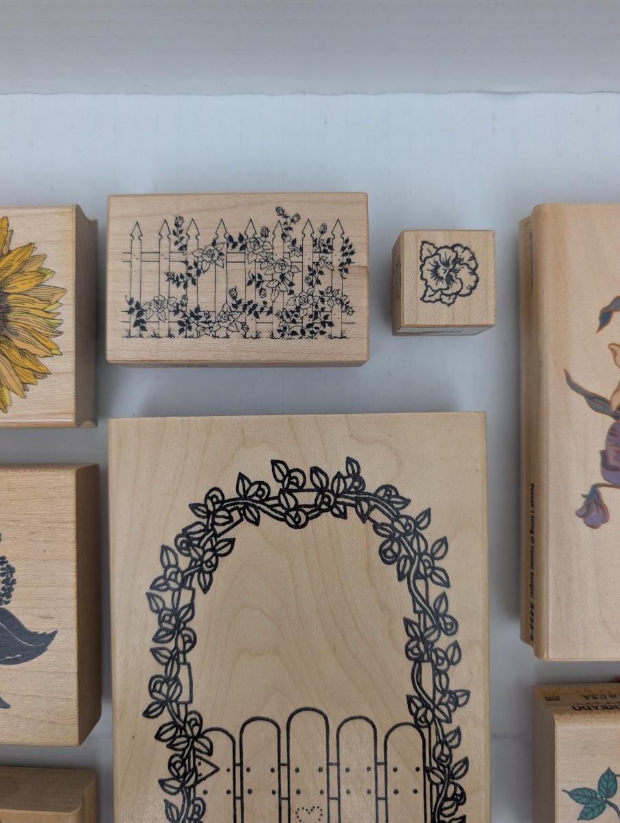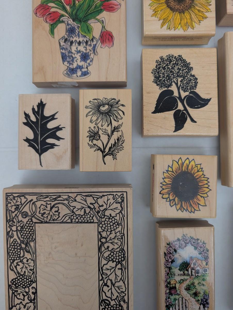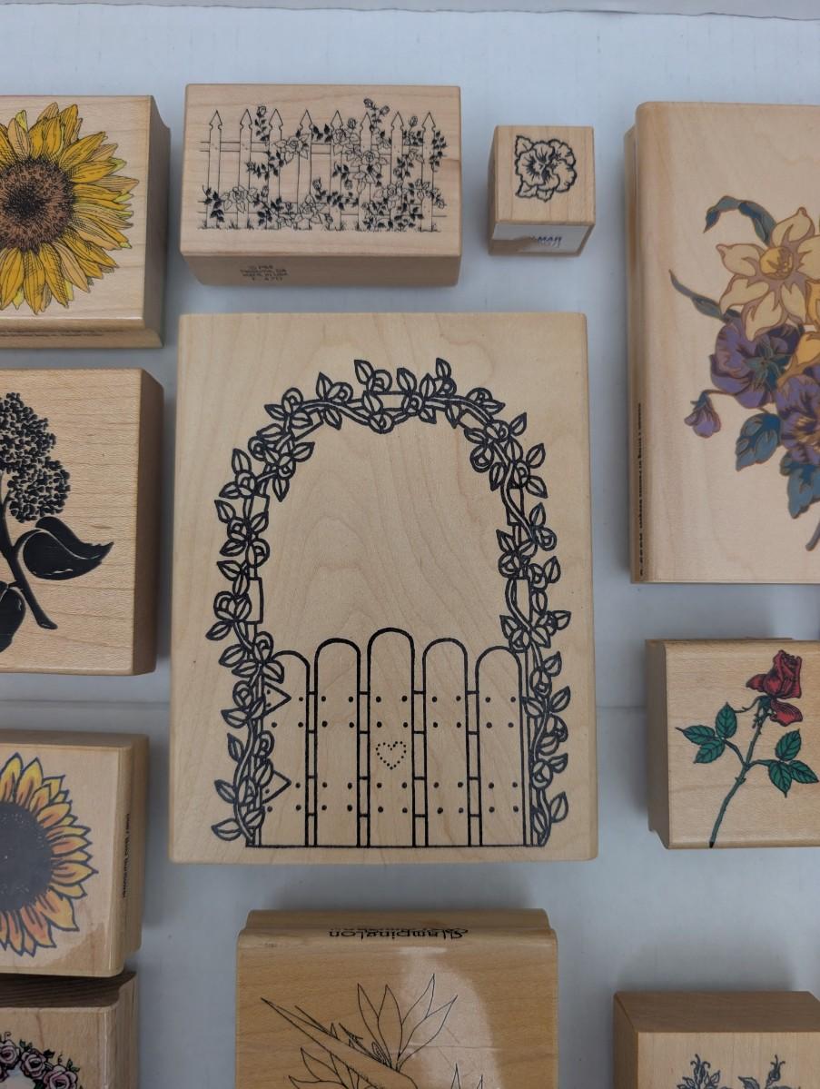 wooden rubber stamps, floral stamps, sunflower stamp, tulip stamp, rose stamp, daffodil stamp, cottage stamp, garden gate stamp, ivy stamp, oak leaf stamp, vintage craft stamps, stamping lot, scrapbooking supplies, cardmaking tools, estate craft collection
