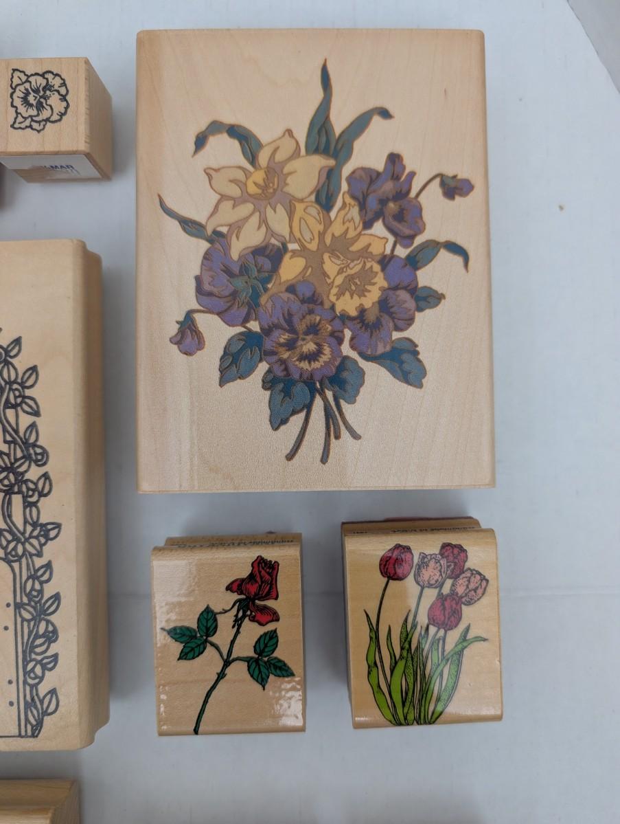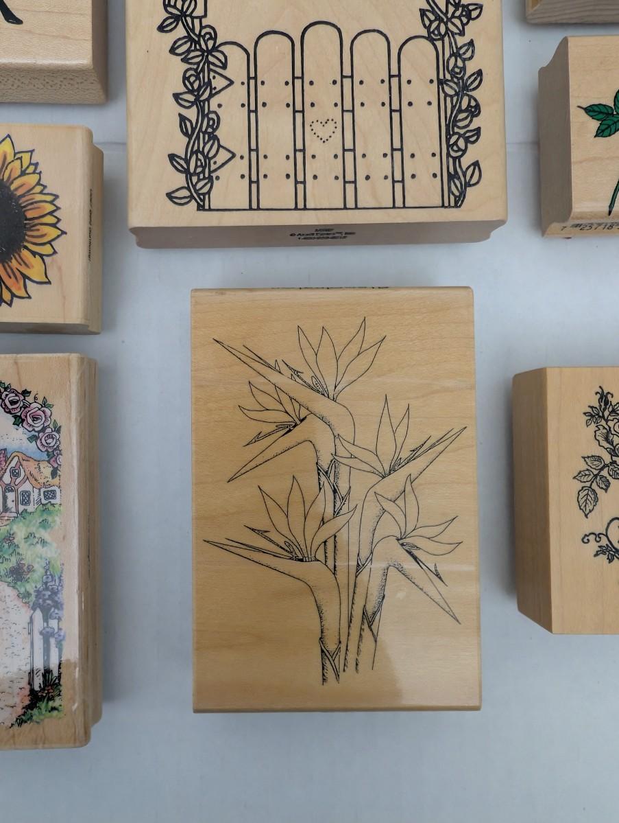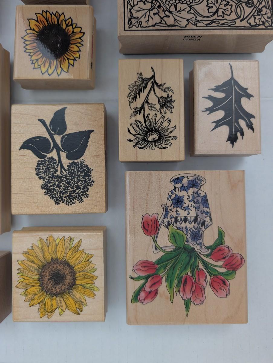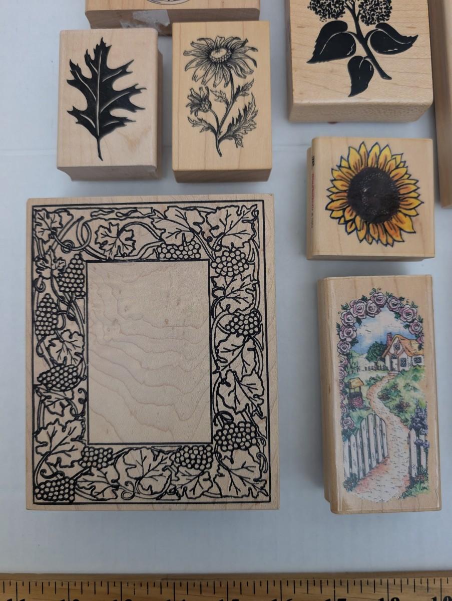 wooden rubber stamps, floral stamps, sunflower stamp, tulip stamp, rose stamp, daffodil stamp, cottage stamp, garden gate stamp, ivy stamp, oak leaf stamp, vintage craft stamps, stamping lot, scrapbooking supplies, cardmaking tools, estate craft collection