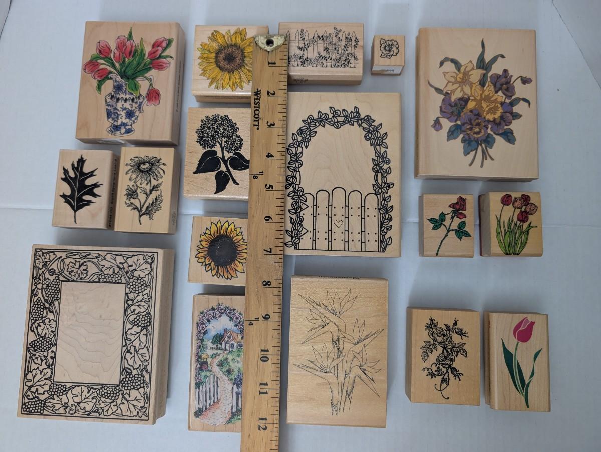 Set of 17 wooden rubber stamps with beautiful floral and garden designs. Includes sunflowers, tulips, roses, daffodils, ivy, oak leaf, decorative frame, cottage path, and garden gate. Perfect for scrapbooking, journaling, cardmaking, and craft projects.
