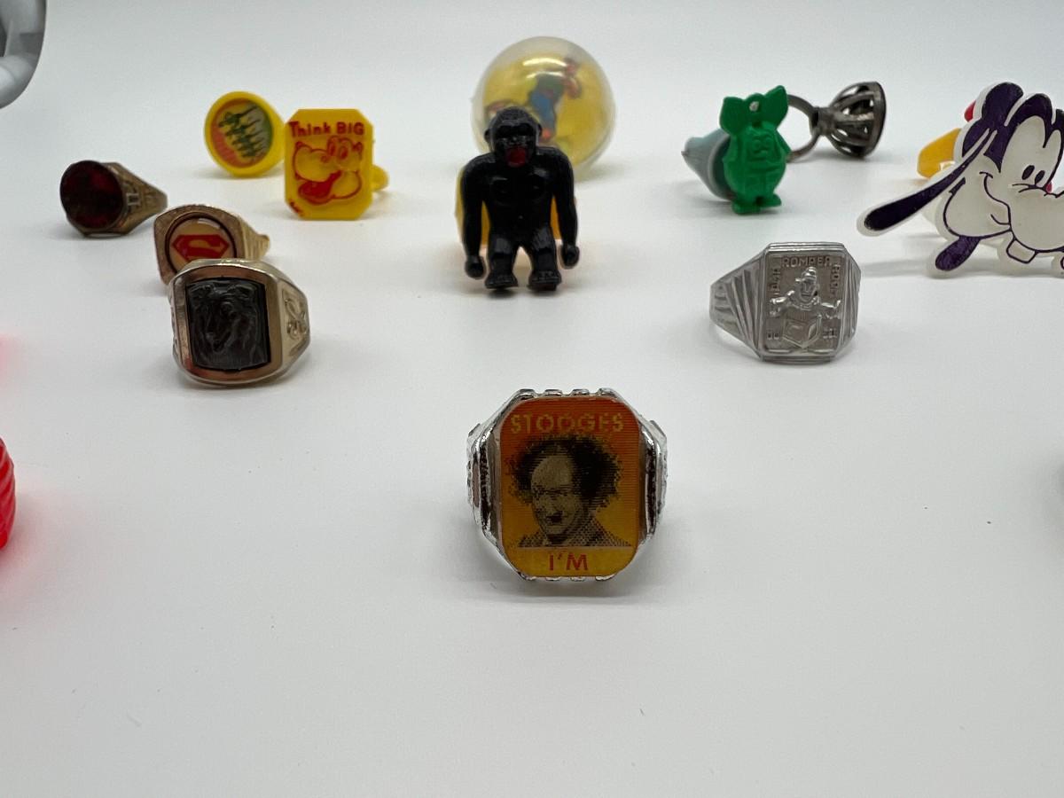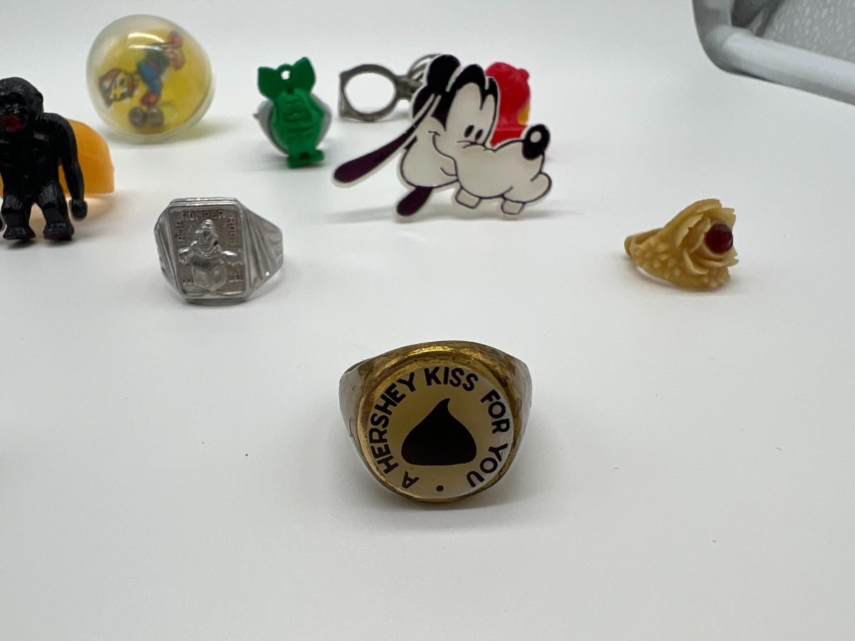 Lot of 18 Kids Toy Rings from the 1960s and 1970s. Lot includes Donald Duck, 1960s Rat Fink by Ed Roth, 1960 Ralston Chex Cereal Secret Agent Decoder Ring, Three Stooges "I'm Larry" gumball ring, 1970s A Hershey's Kiss For You Ring, and Lassie Embossed Collie Dog Ring.