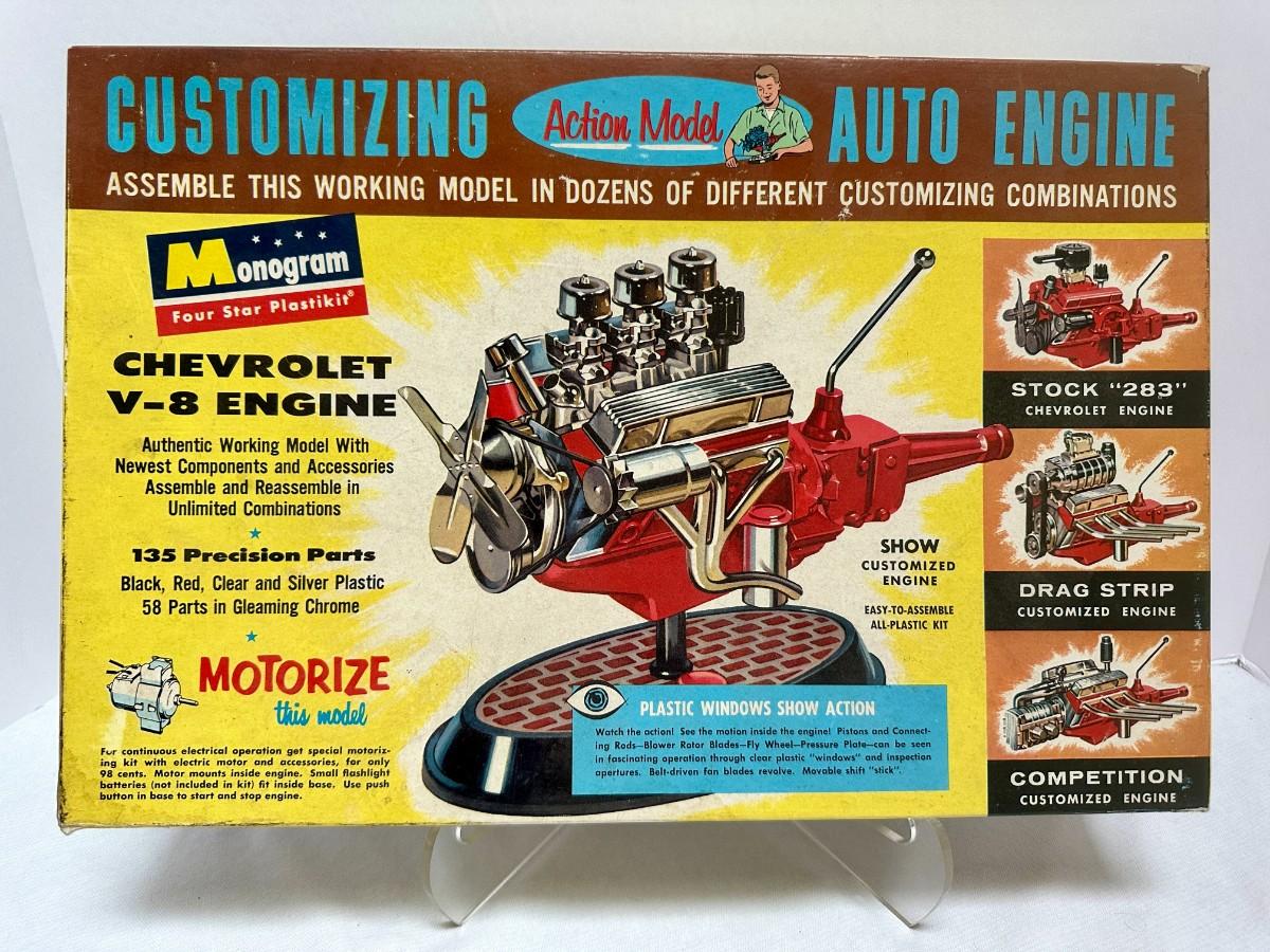 Customizing Auto Engine Action Model for Chevy V8. Very rare because this was the one and only issue of this model. We do not believe all model parts are in the box. Value is in the box. Also included a 1966 Super Stock Magazine.