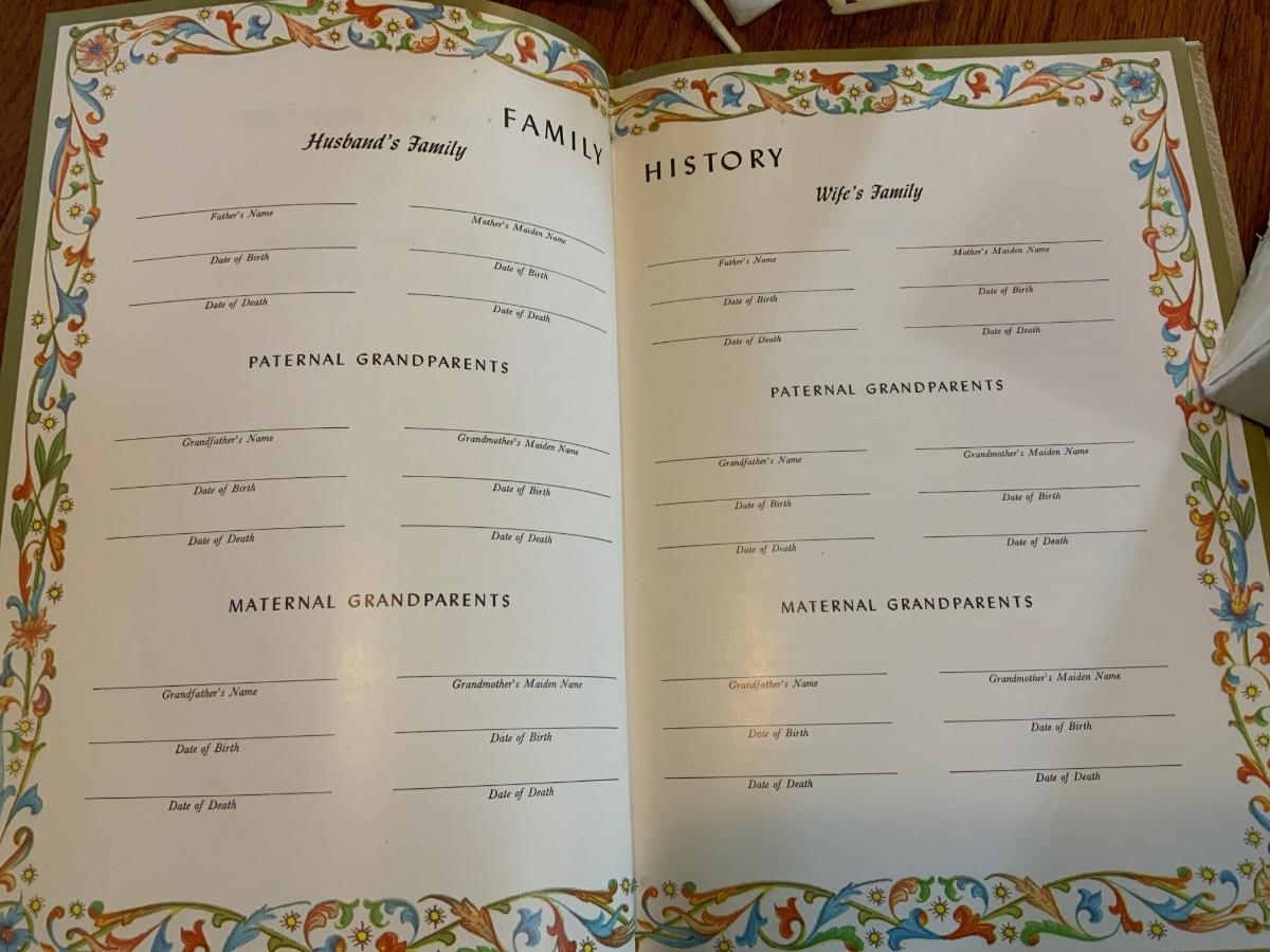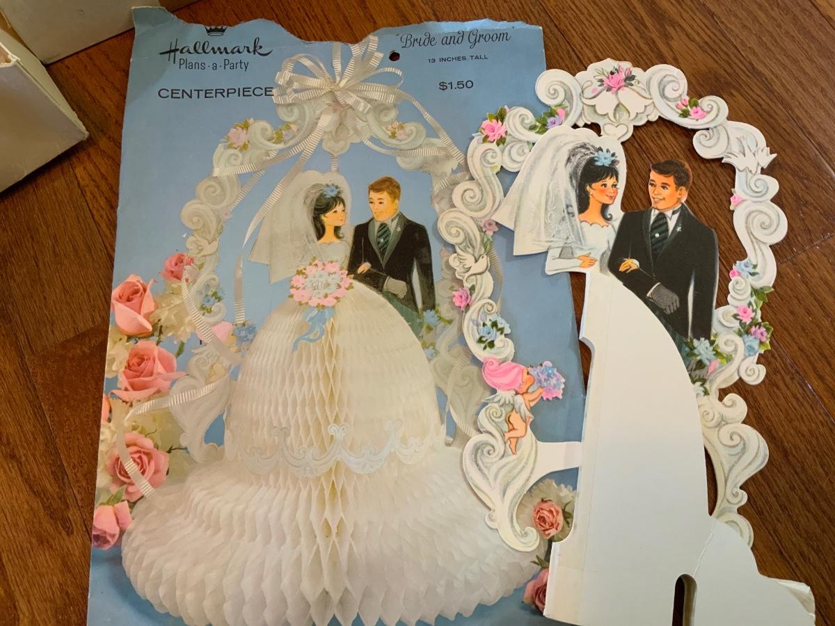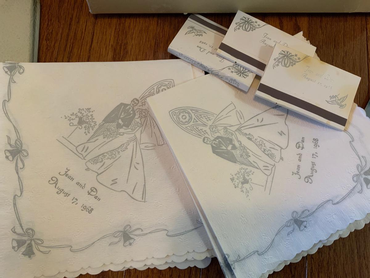 Lot of 1968 Wedding items. Dove Wedding cake topper, Hallmark table decoration, Brides dried Bouquet which has vintage lace, Never used book for Newlyweds, Personalized napkins and matches and leftover wedding invites including the plate they were made from.