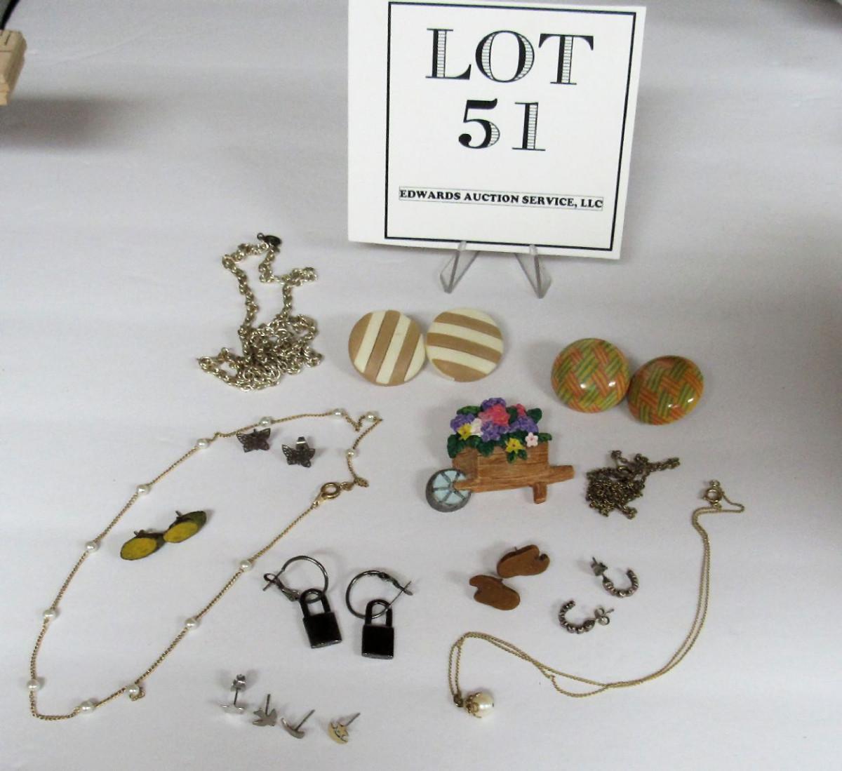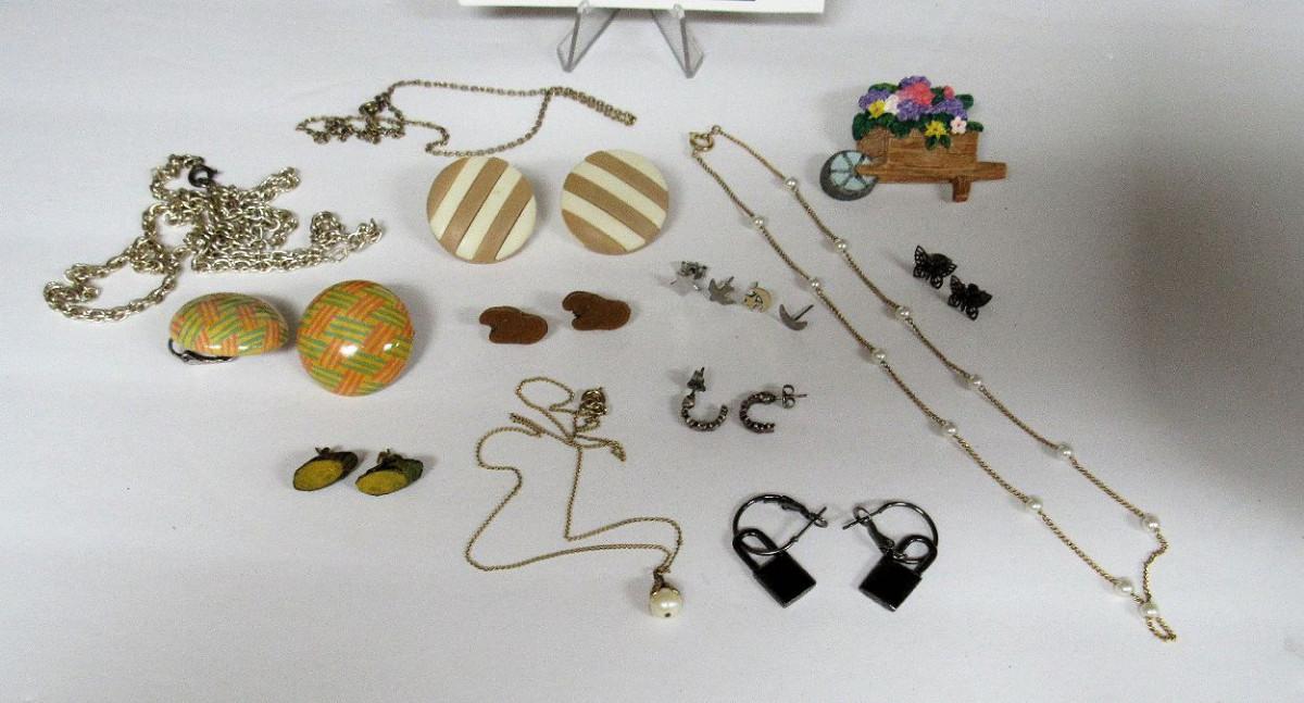 The locks earrings are cute! Faux pearl necklaces, wood earrings. There are 4 tiny small single earrings with no mates and some have no backs. Chains have wear. Shipping is available at shipping cost plus $5.00 handling fee on one box, $10.00 handling fee on two boxes, $15.00 handling fee on 3 boxes. Helps cover shipping materials and labor cost.