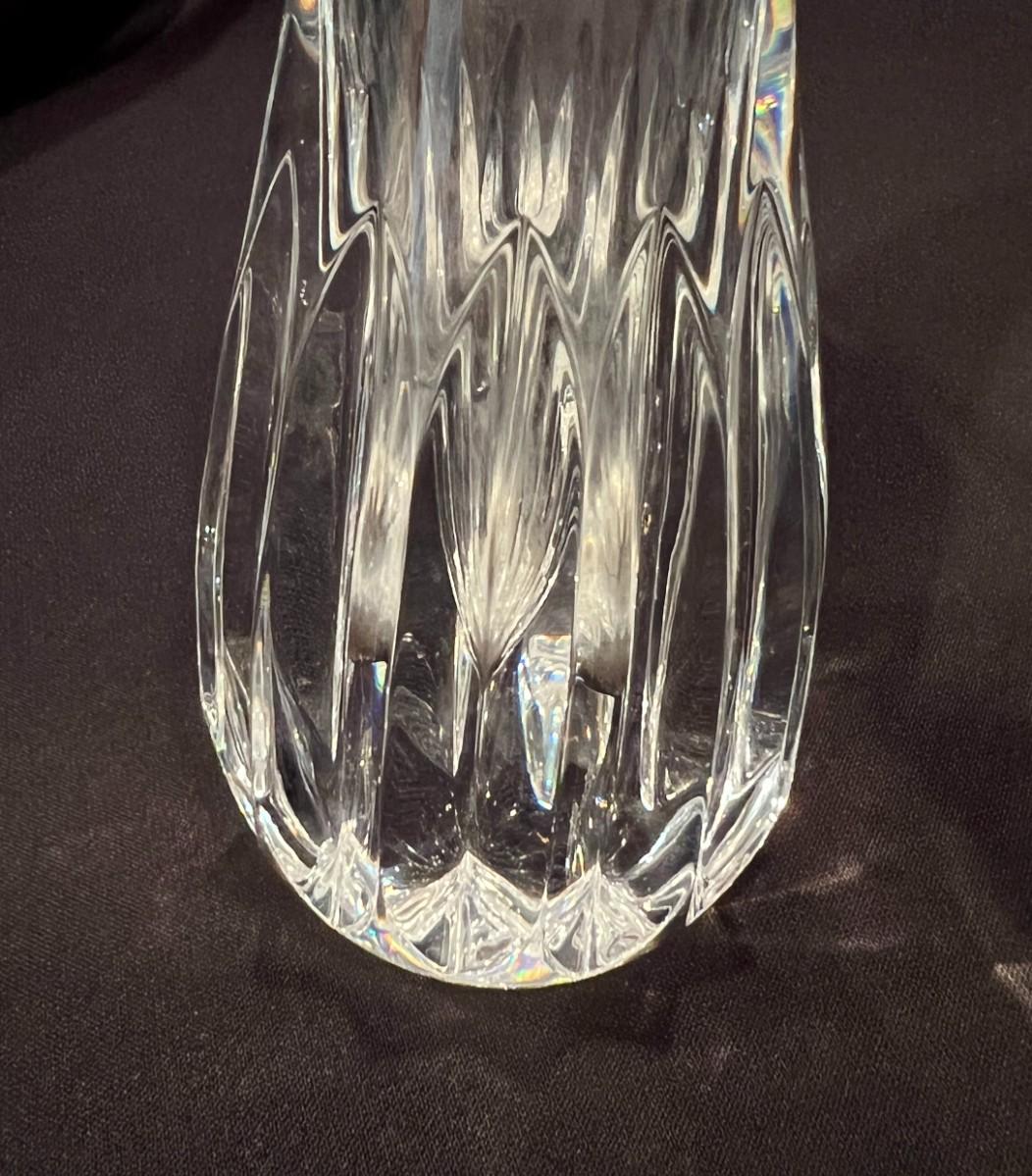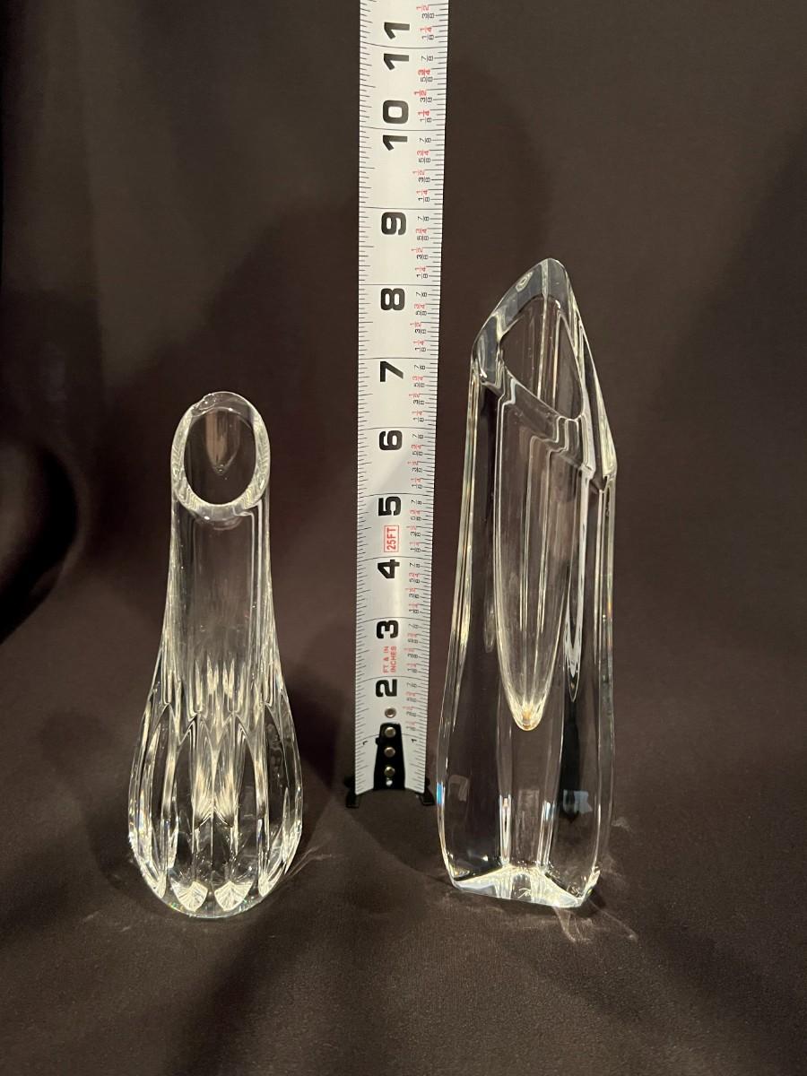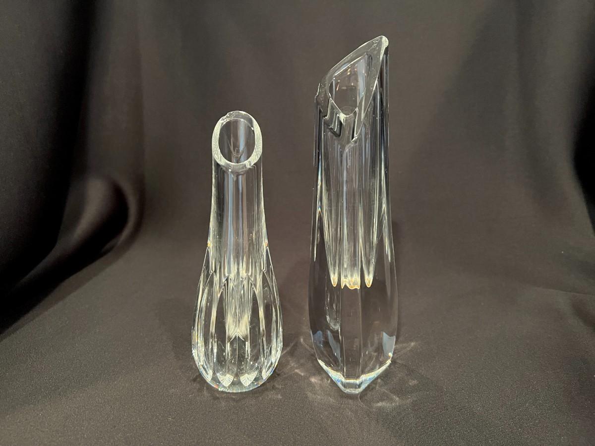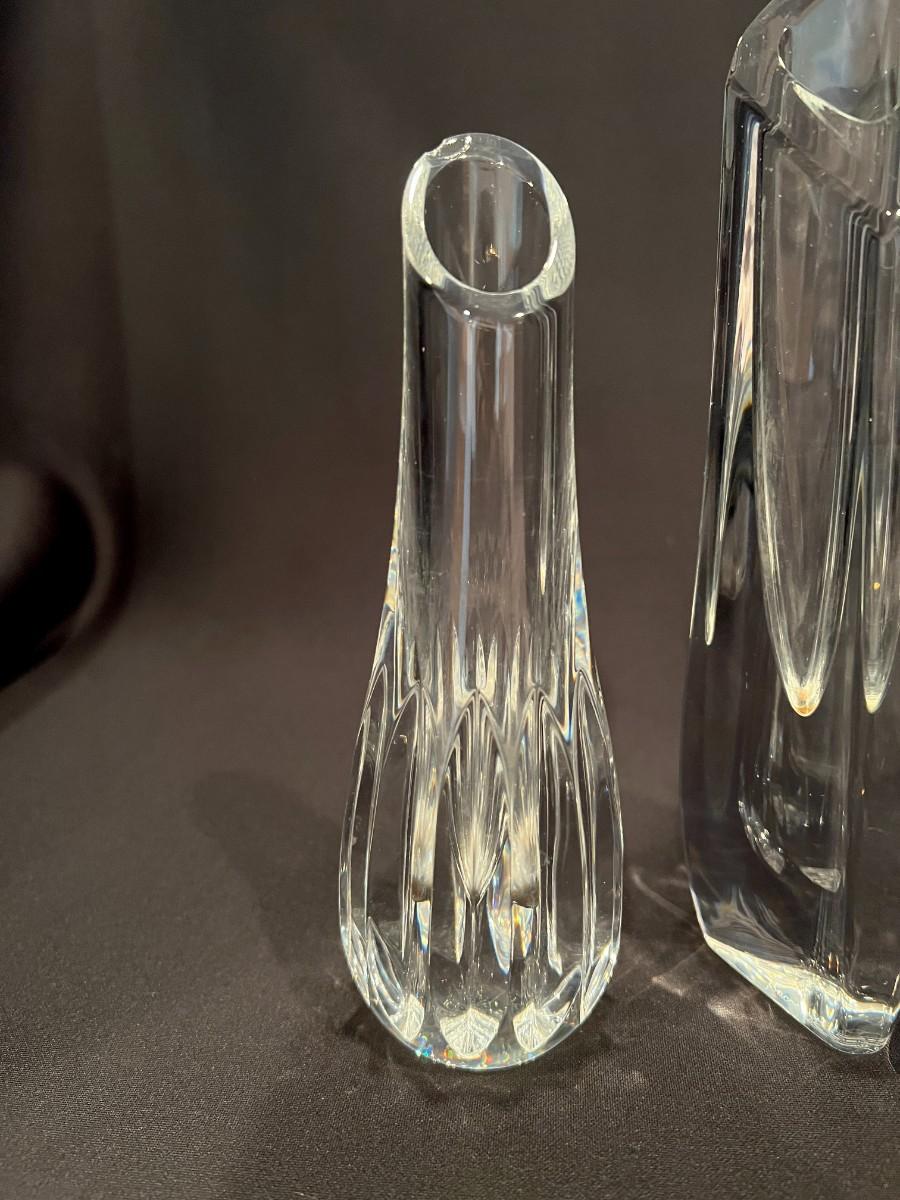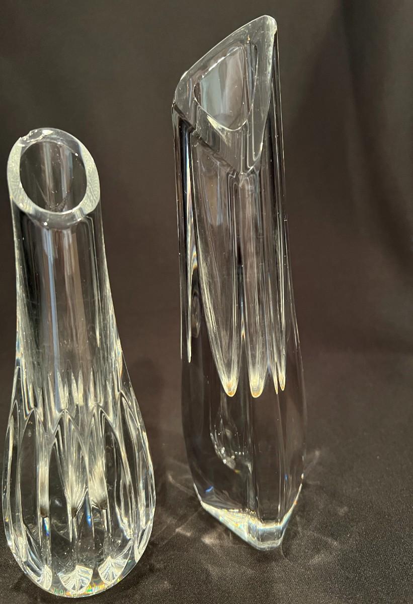 Lovely pair of two Baccarat clear cut crystal vases. Both signed Baccarat. In good condition, though one has a chip in the top (shown in photo).