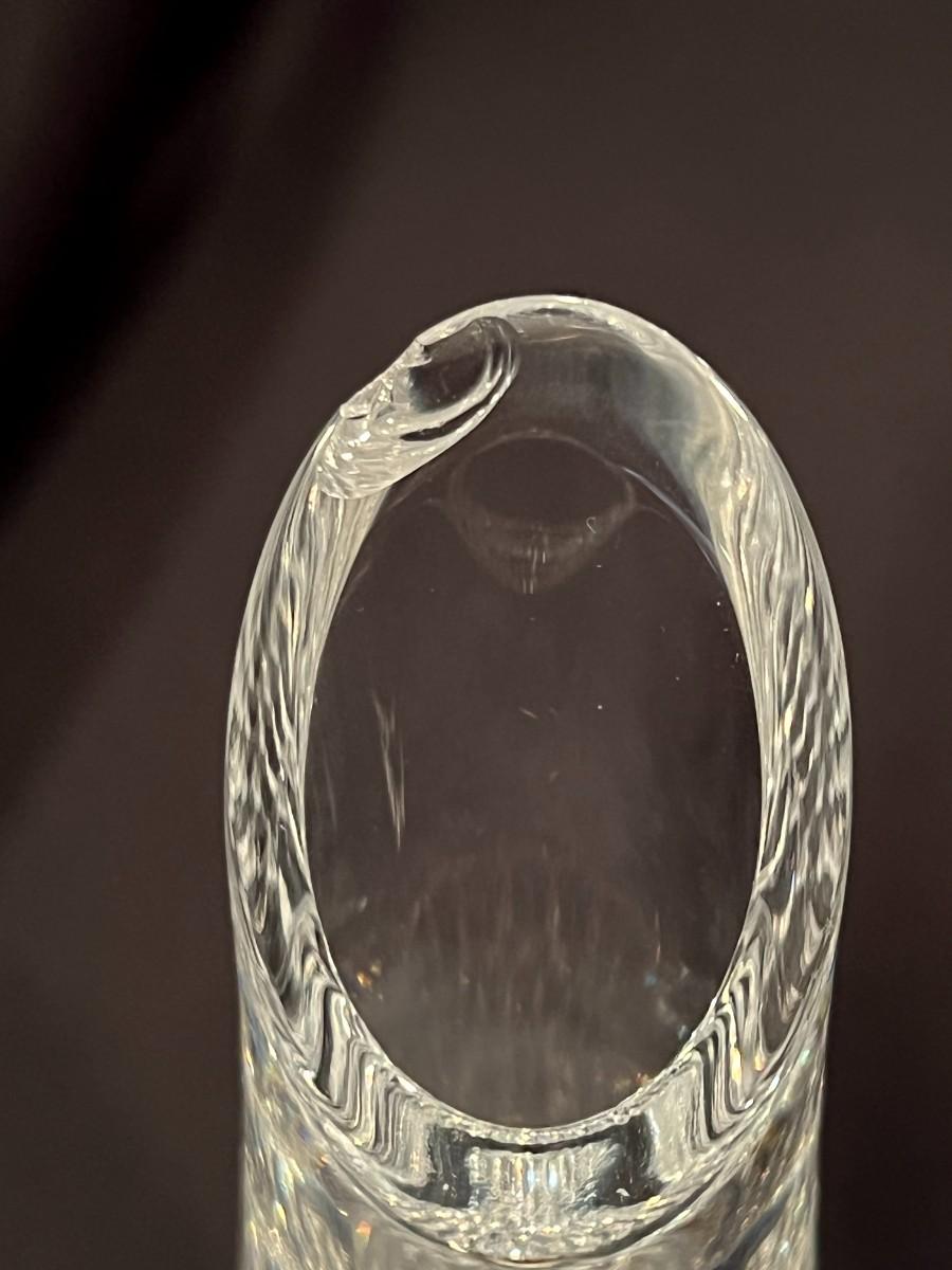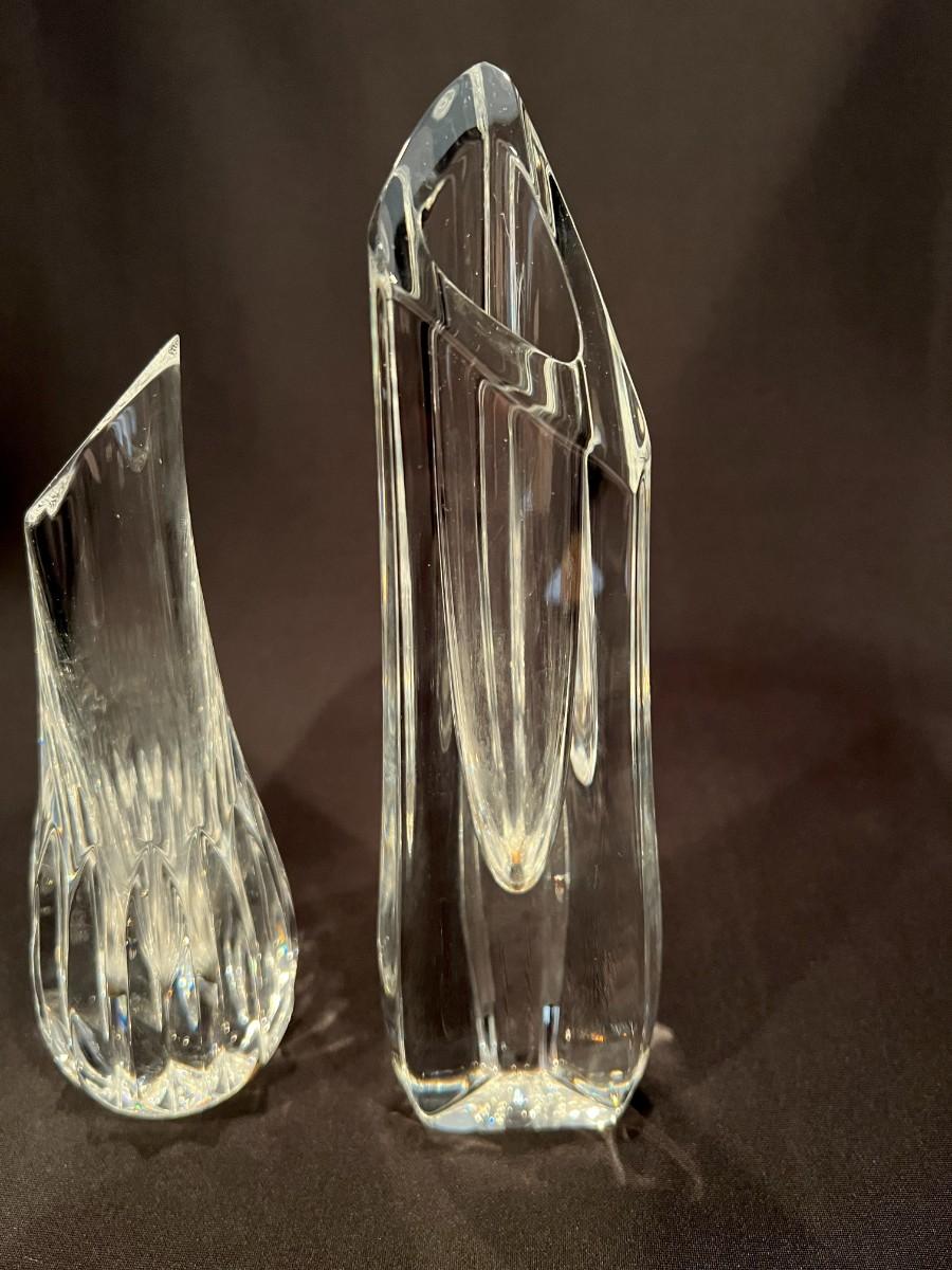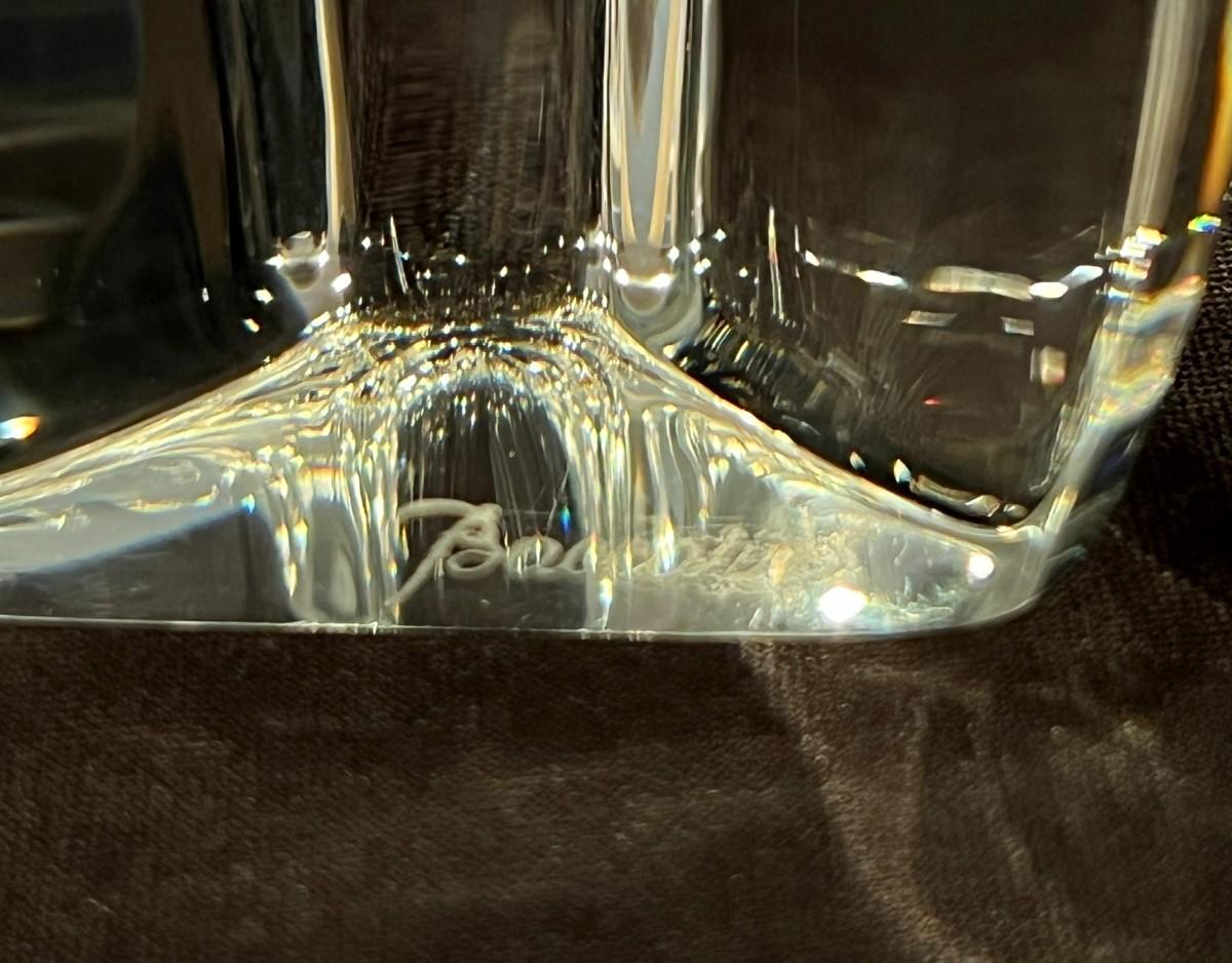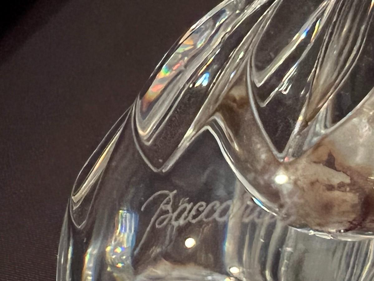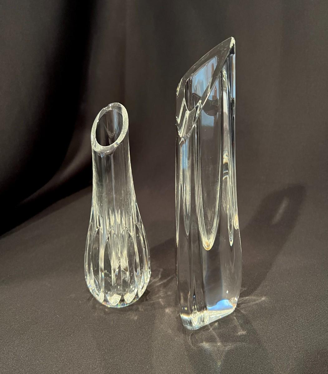 Lovely pair of two Baccarat clear cut crystal vases. Both signed Baccarat. In good condition, though one has a chip in the top (shown in photo).