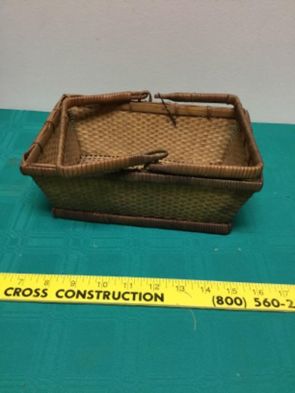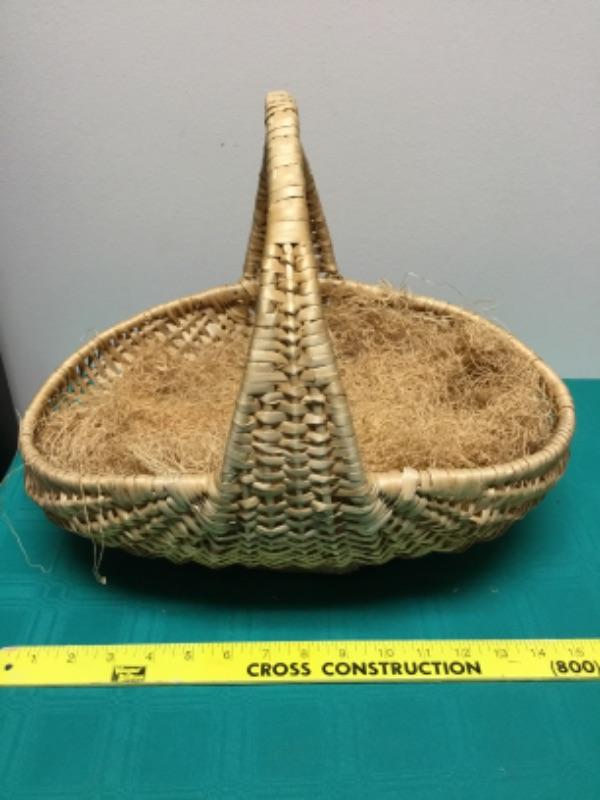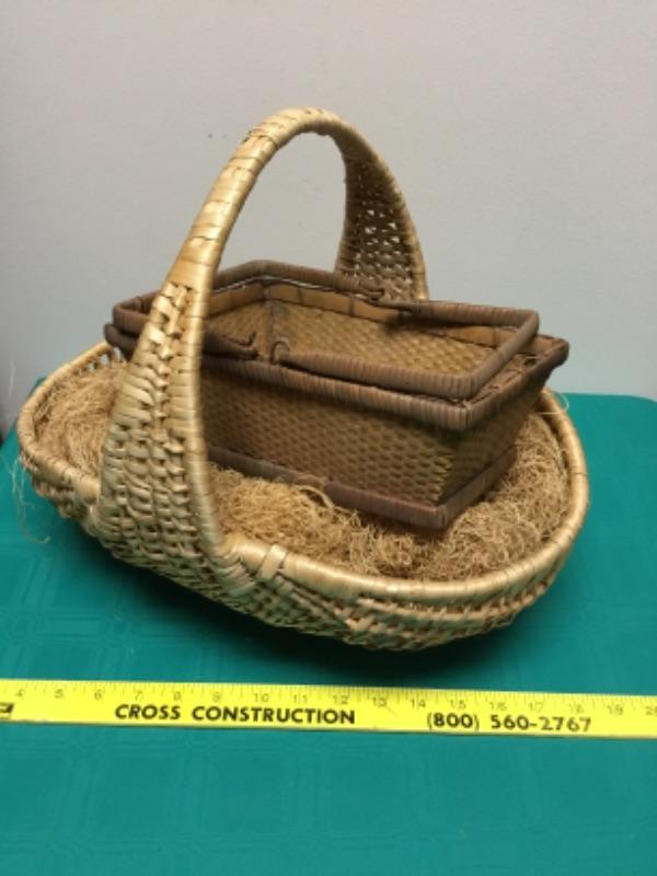 The smaller basket has two broken handles. See pictures. The larger basket is in good condition, and includes the bedding material.
