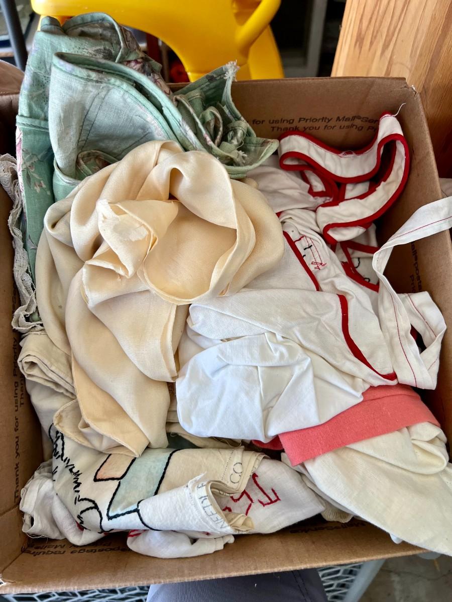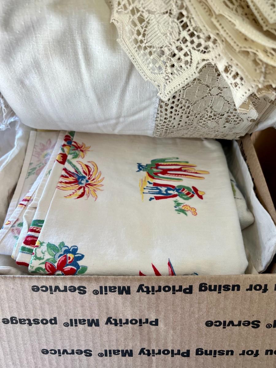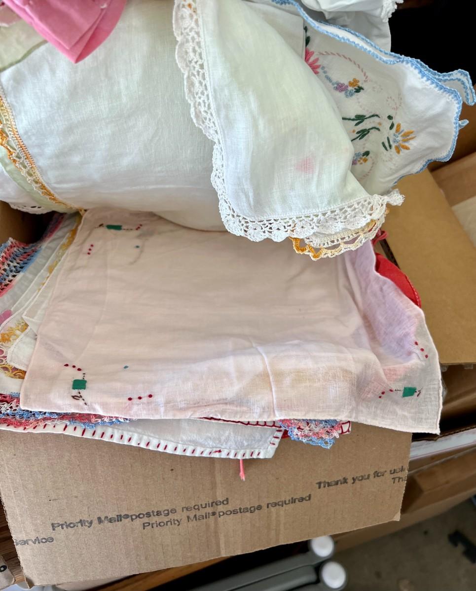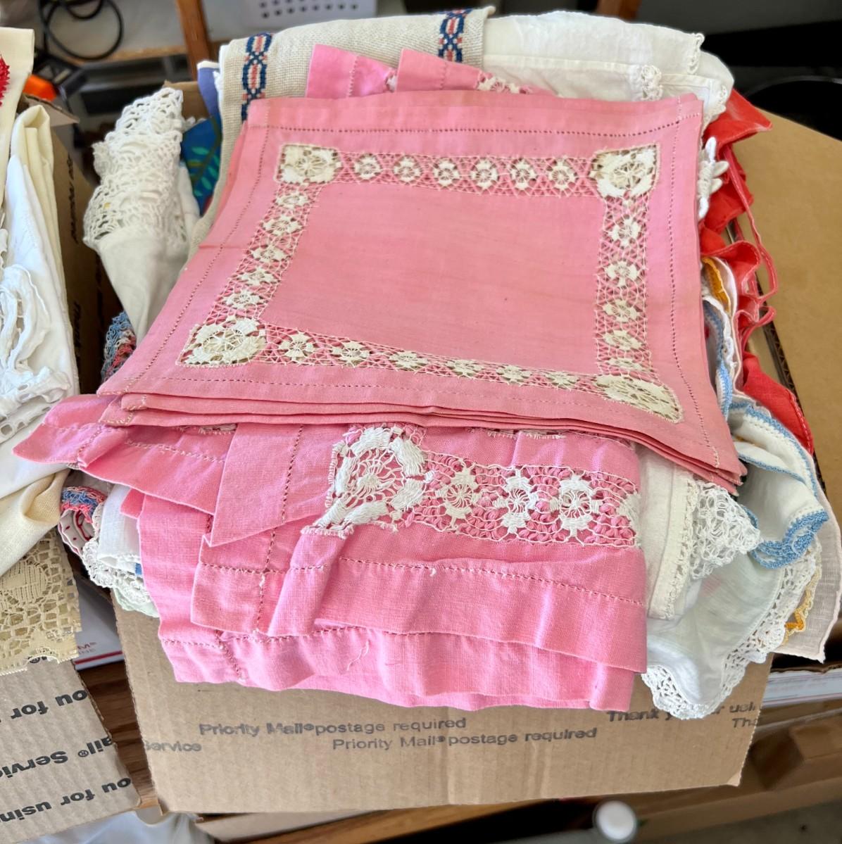 Lot of 2 Boxes of Miscellaneous Vintage Tablecloths, Table Runners and Napkins