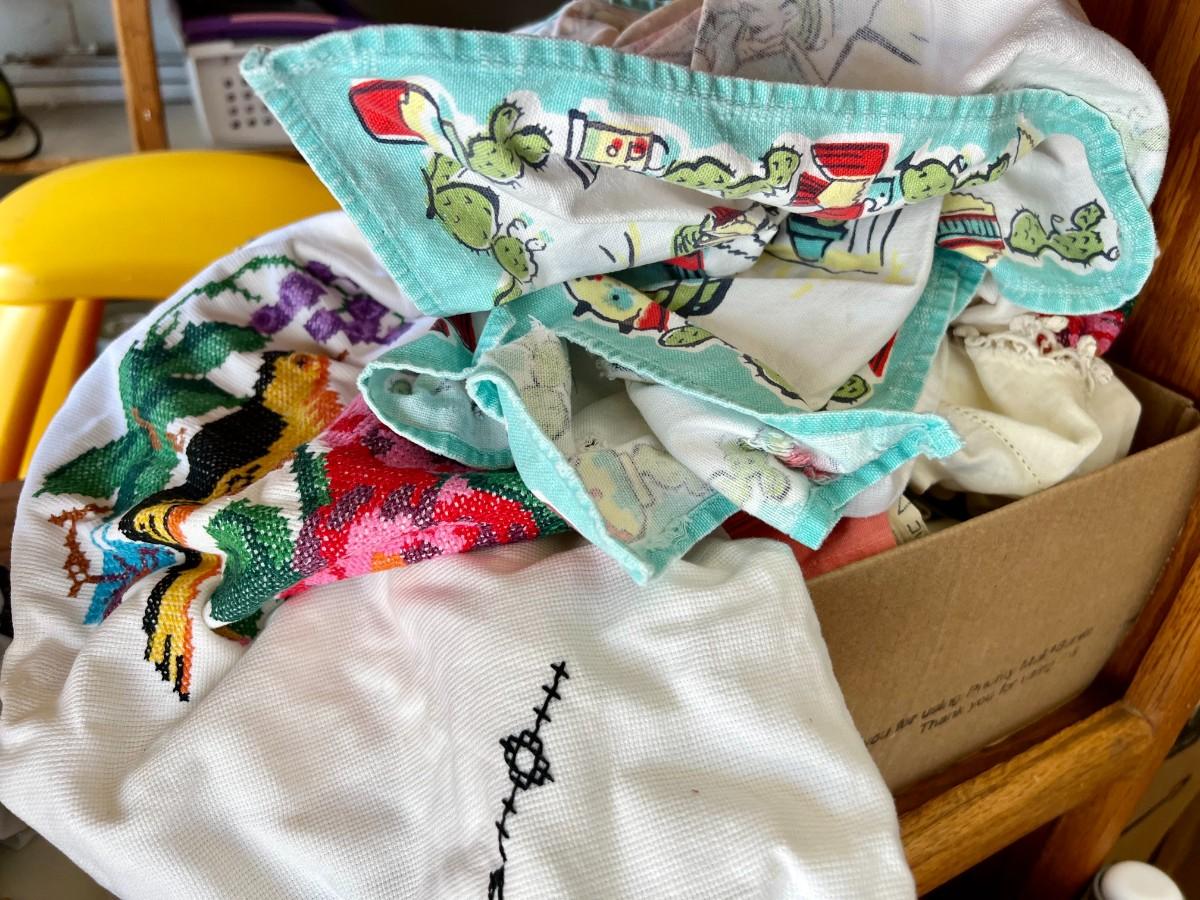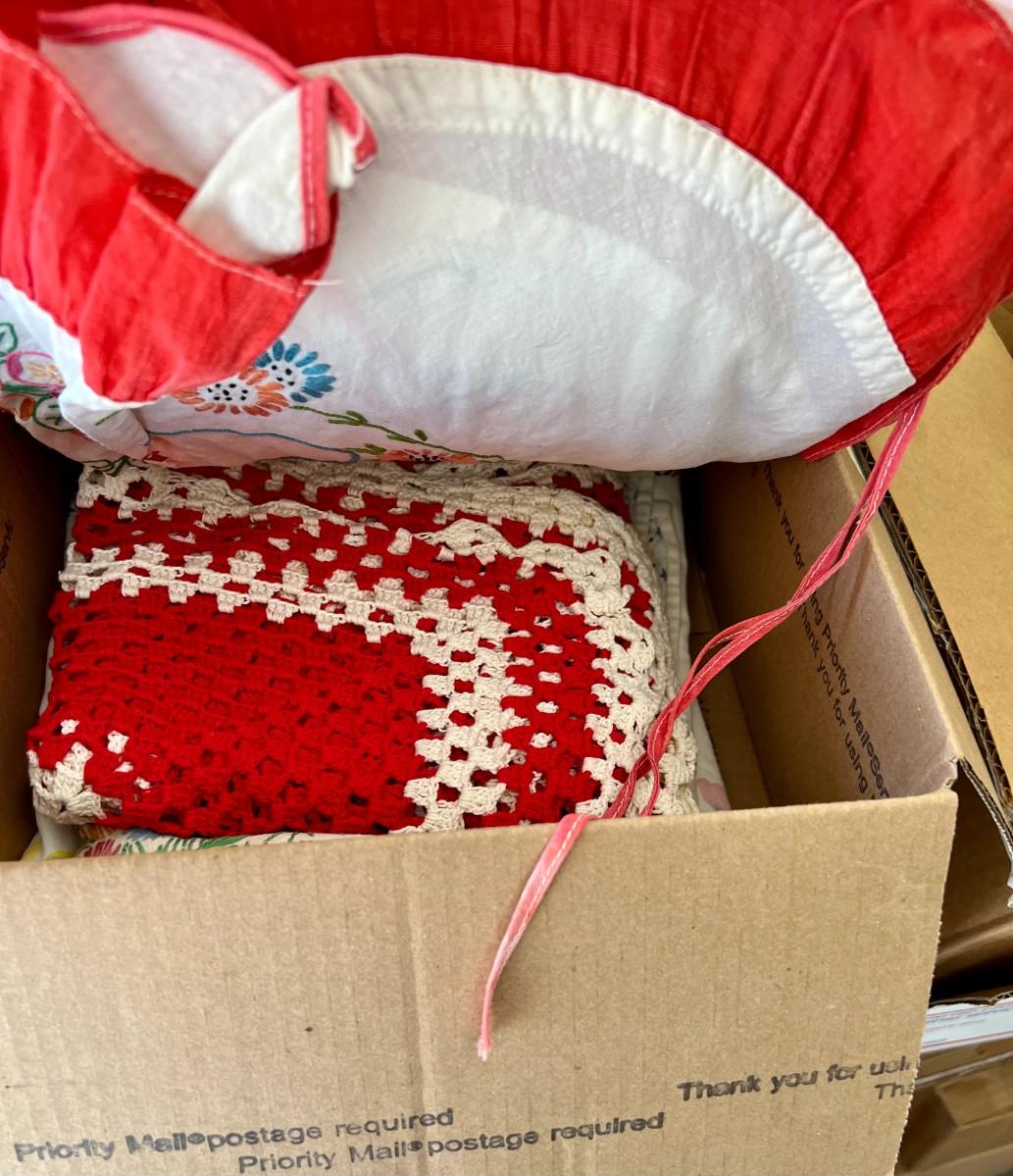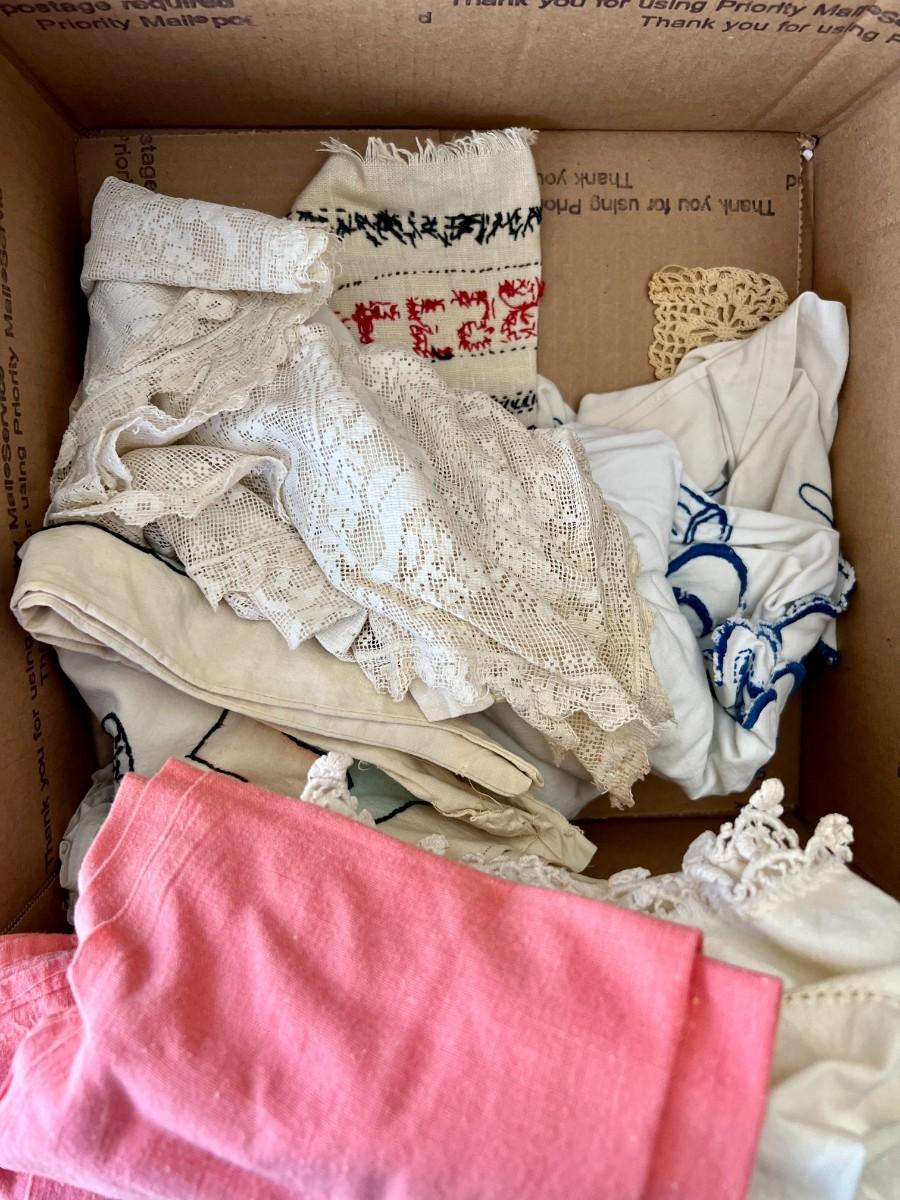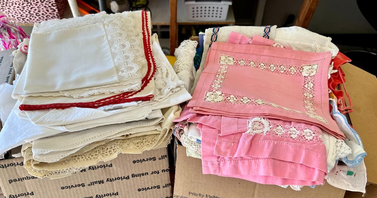 Lot of 2 Boxes of Miscellaneous Vintage Tablecloths, Table Runners and Napkins
