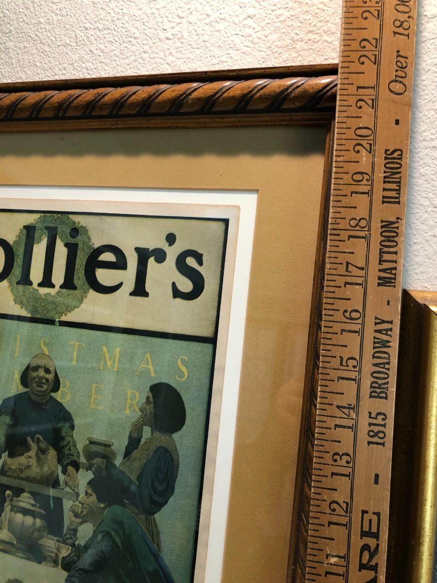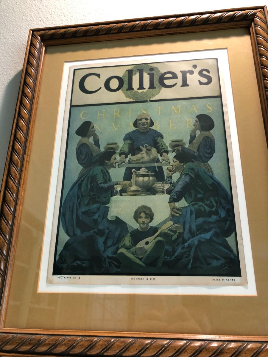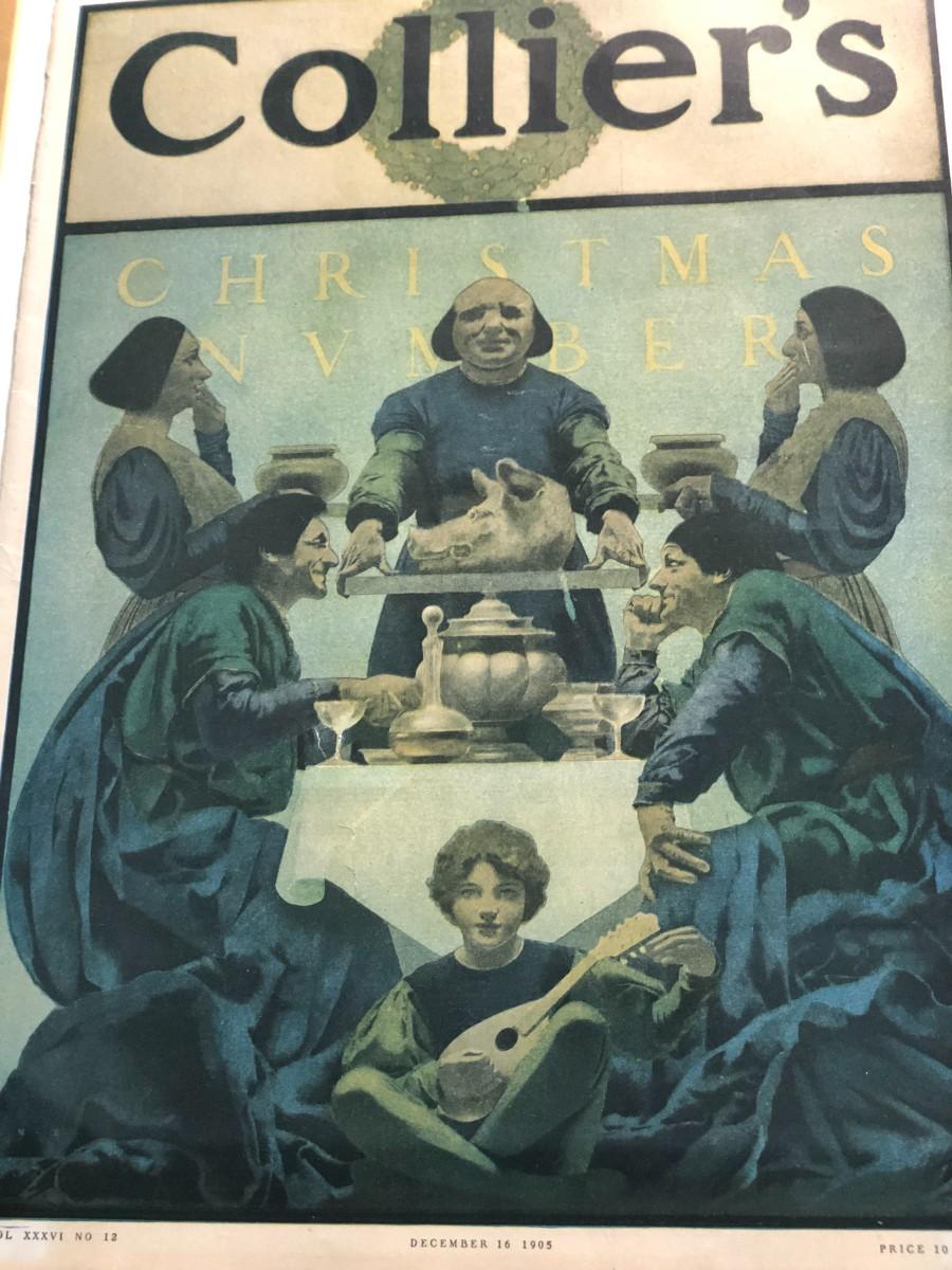 Great lot of 2 vintage print ads featuring illustrations by Maxfield Parrish. One is a Christmas scene with a hogs head feast, dated December 16, 1905. The other is a cover for Collier's The National Weekly, featuring an independence theme with boys carrying flags, says "independence" and "nvmber".