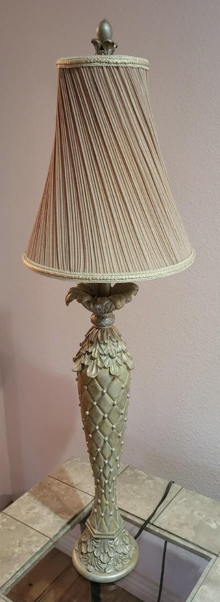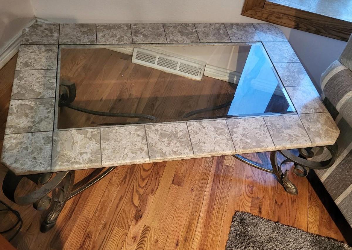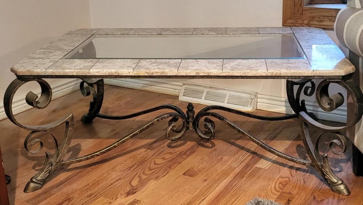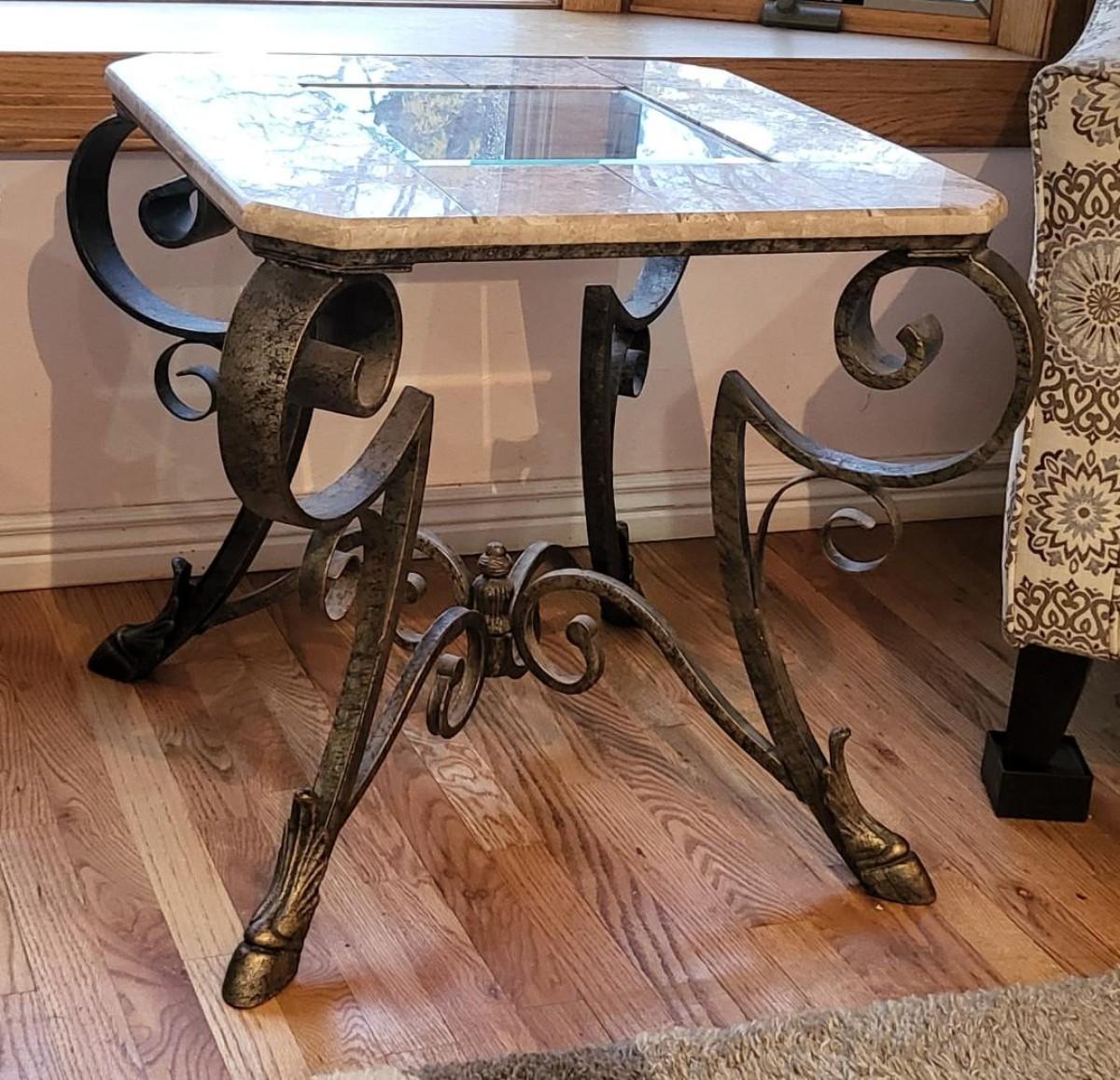 Heavy, metal legs. Top includes stone margin and glass top. Excellent condition. Lamp and floral arrangement shown not included in this lot.