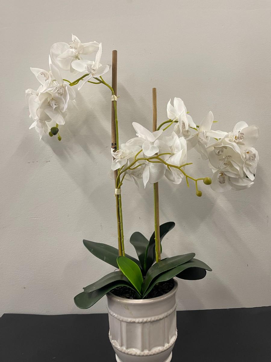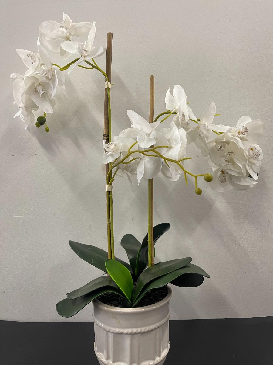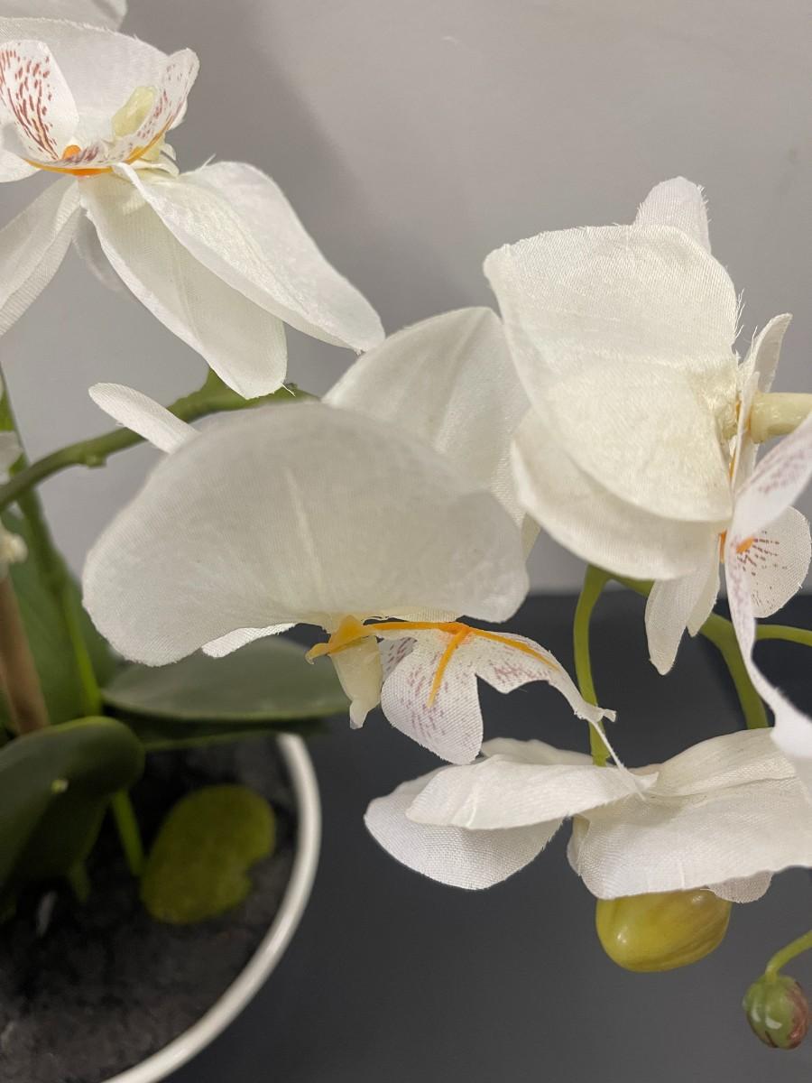 Lot of 2 faux potted white orchids. Very good condition.