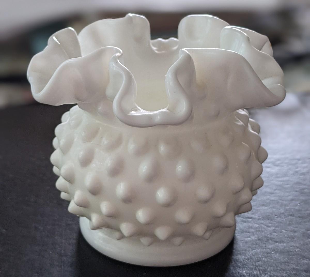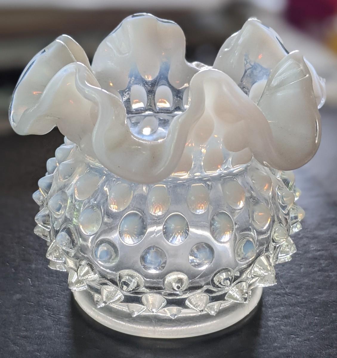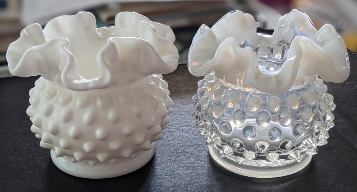 Lot of 2 - Fenton Moonstone Opalescent Hobnail Double Ruffle & White Milk glass Small vases