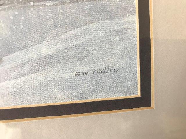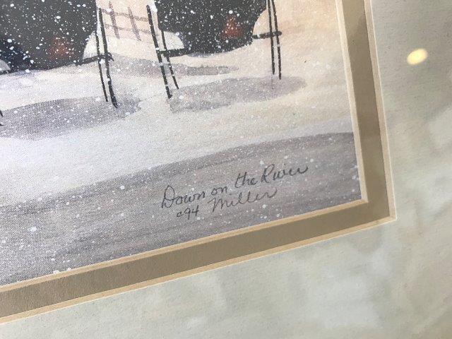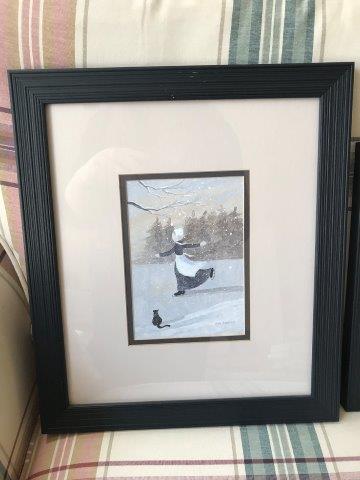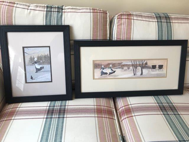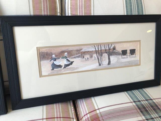 Lot includes one print "Down on the River" of two Amish girls ice skating in front of a covered bridge in the snow. 24" x 12" H The other is a small print of a single Amish girl ice skating. 13" x 15" Both framed in black and matted in cream.