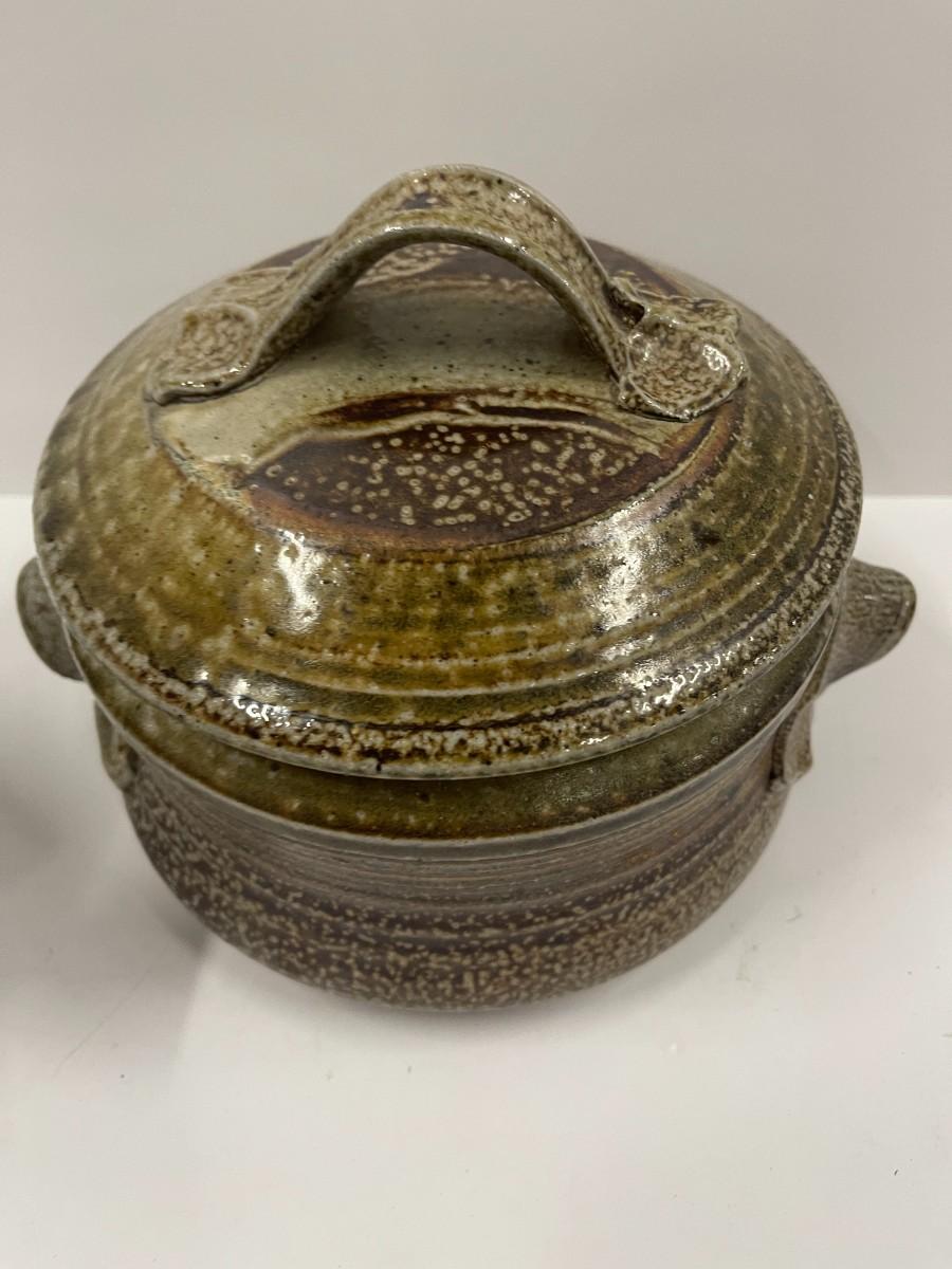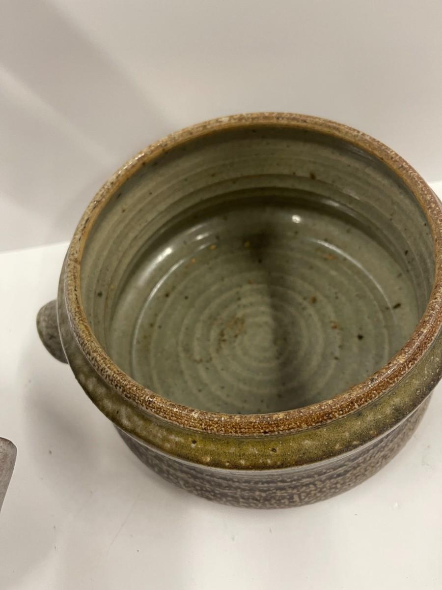 Lot of 2 handmade pottery pieces, signed by maker. The dish with lid appears to have a hair line crack in the lid. Open piece is 5" high. Vessel with lid is 3 1/4" high.