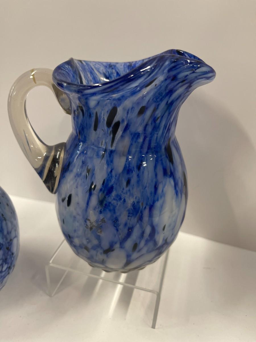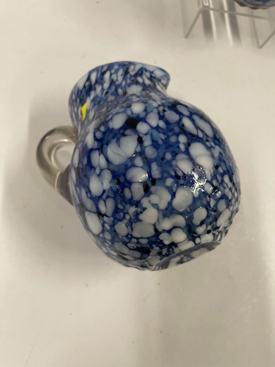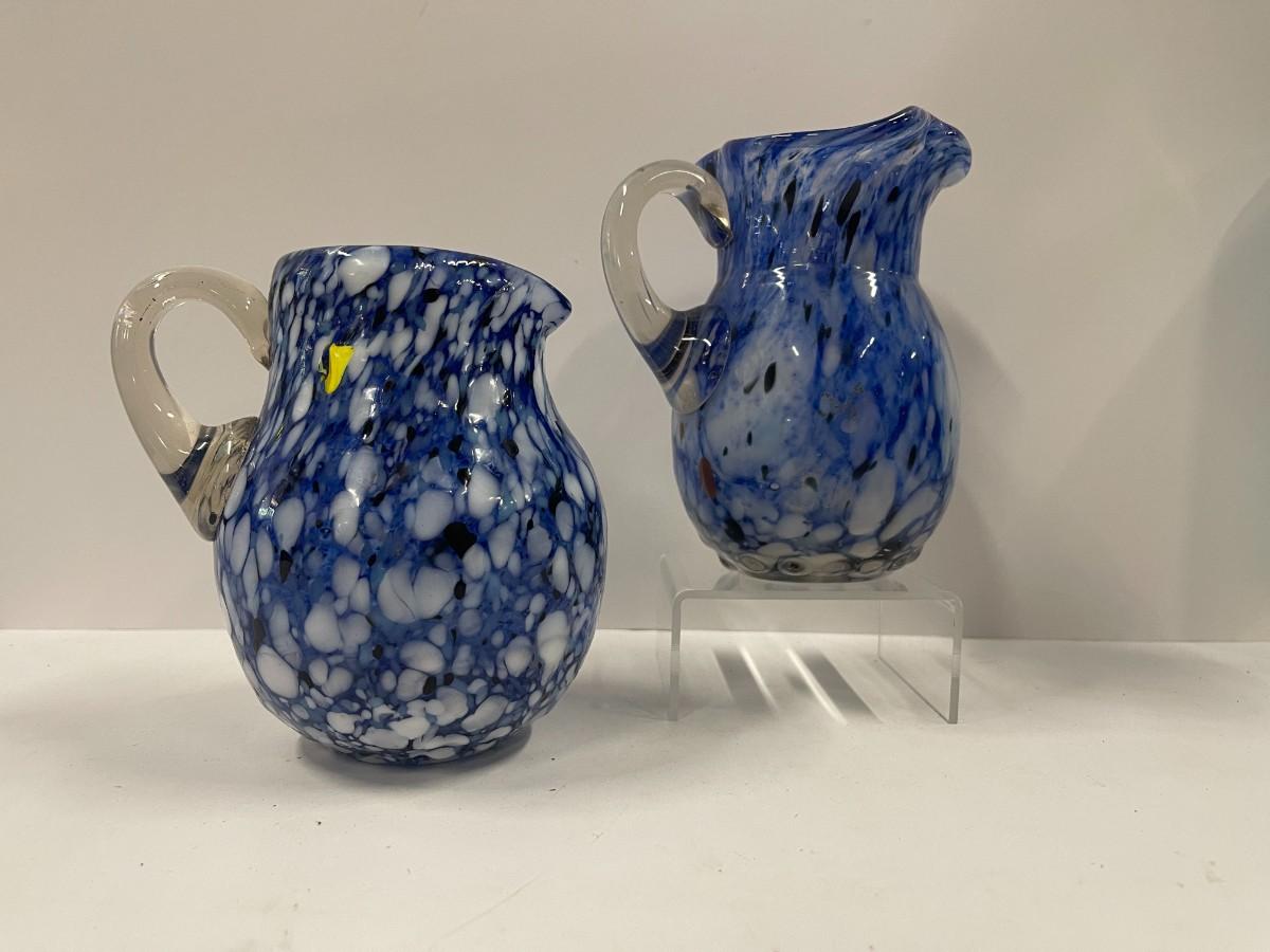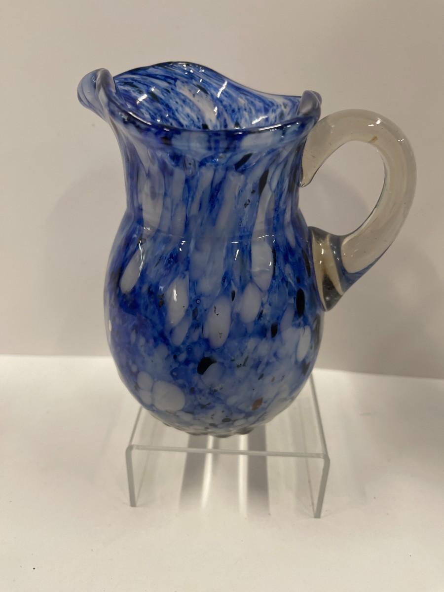 Lot of 2 hand made blue and white art glass pitchers. Each is fairly small at about 5 1/2" tall. Both in very good condition; no chips, cracks or broken pieces.