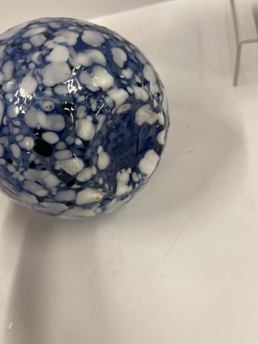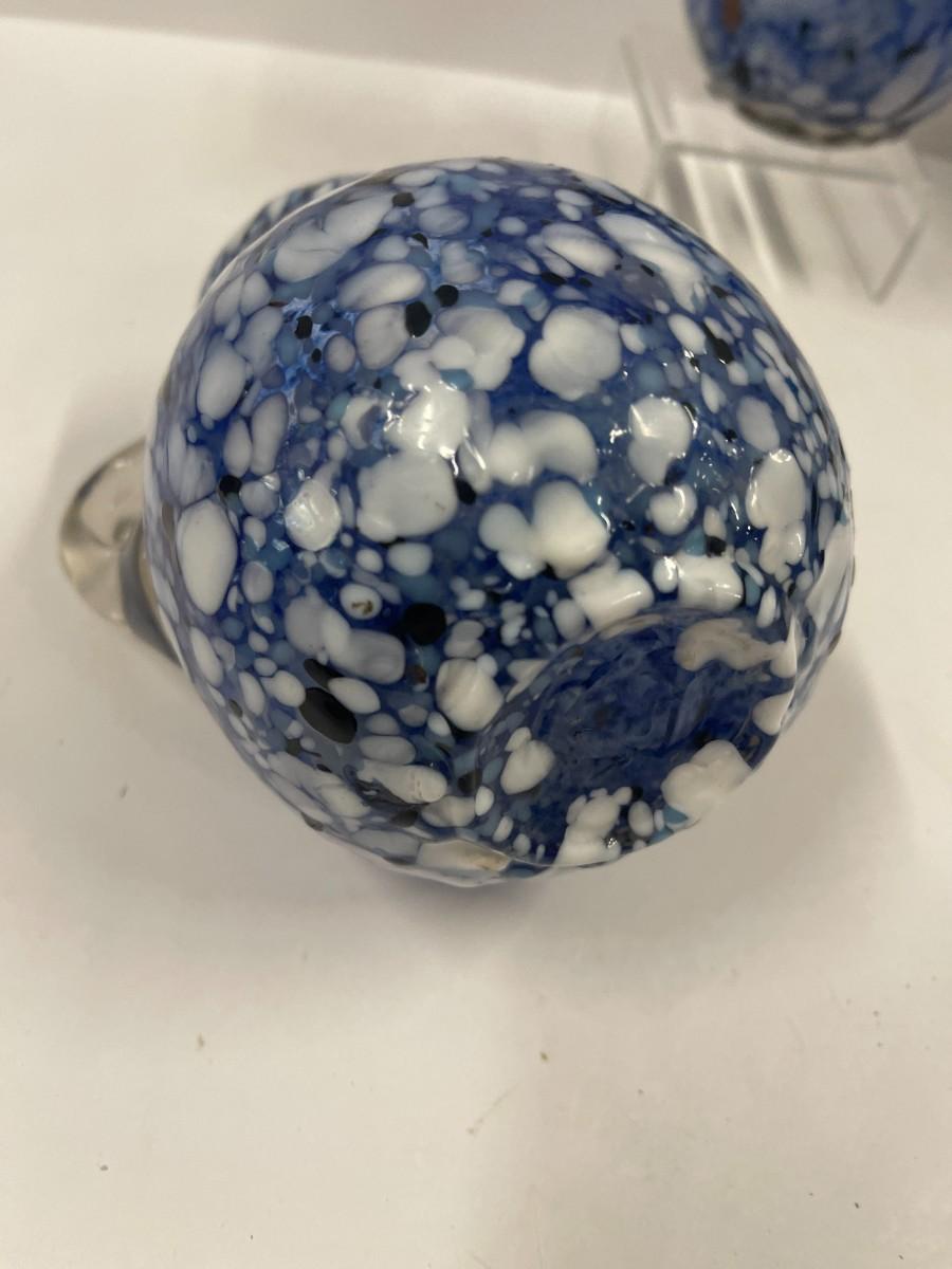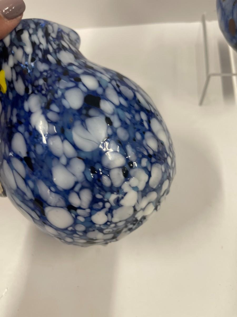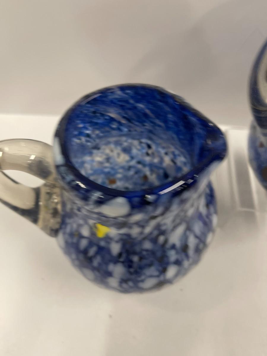 Lot of 2 hand made blue and white art glass pitchers. Each is fairly small at about 5 1/2" tall. Both in very good condition; no chips, cracks or broken pieces.