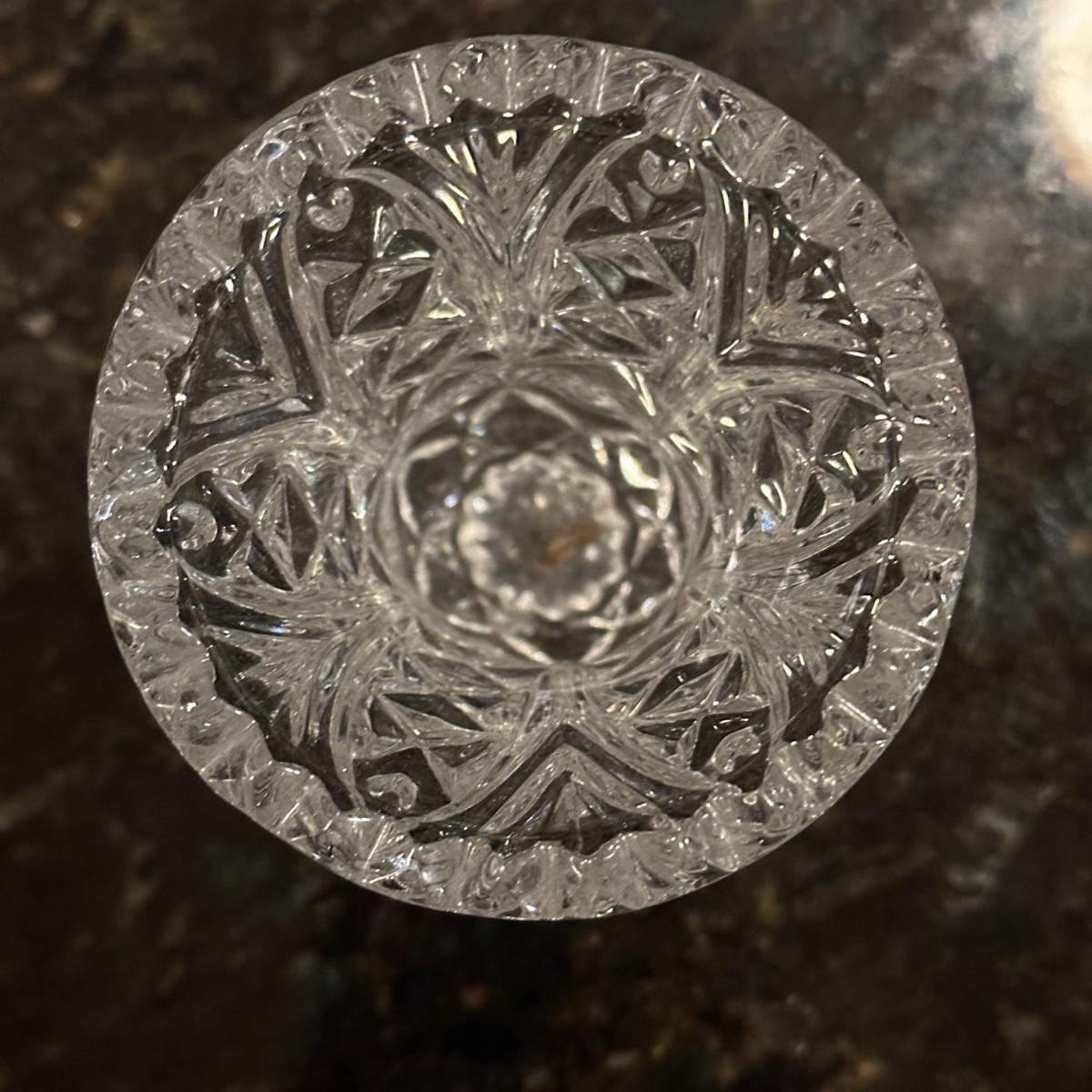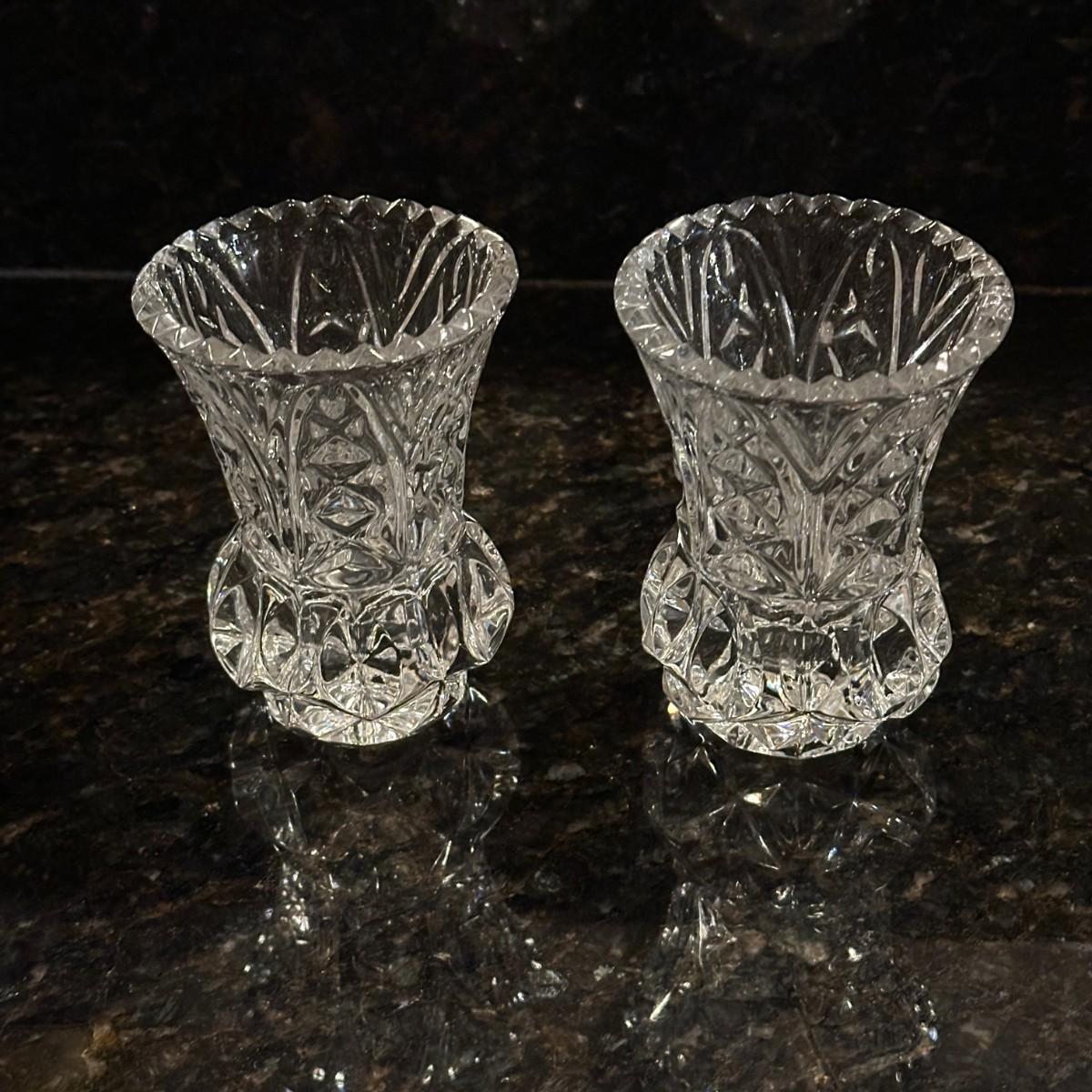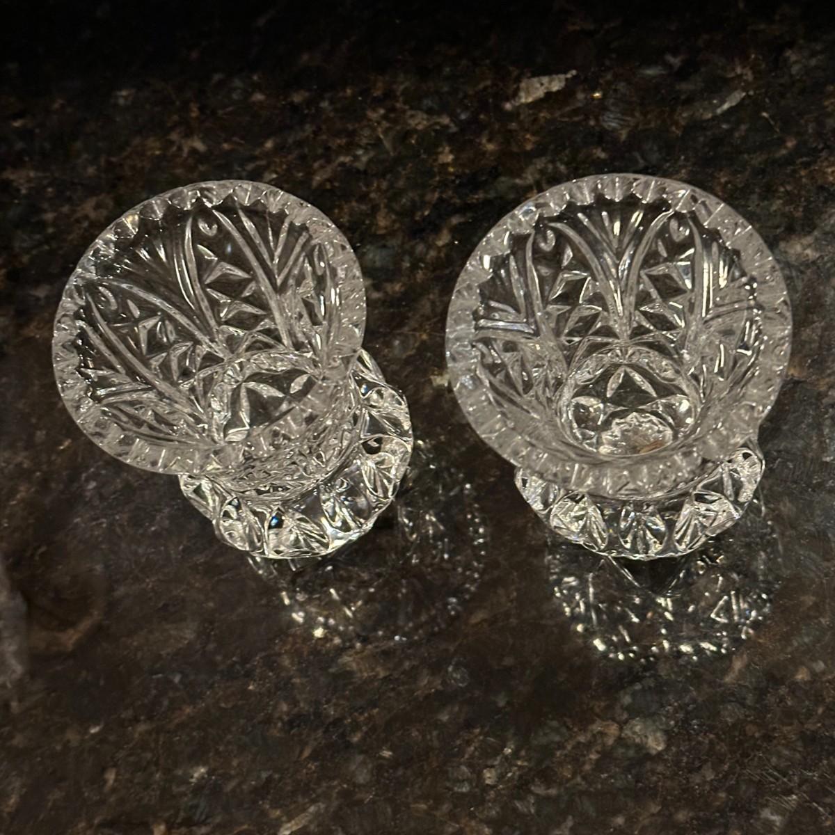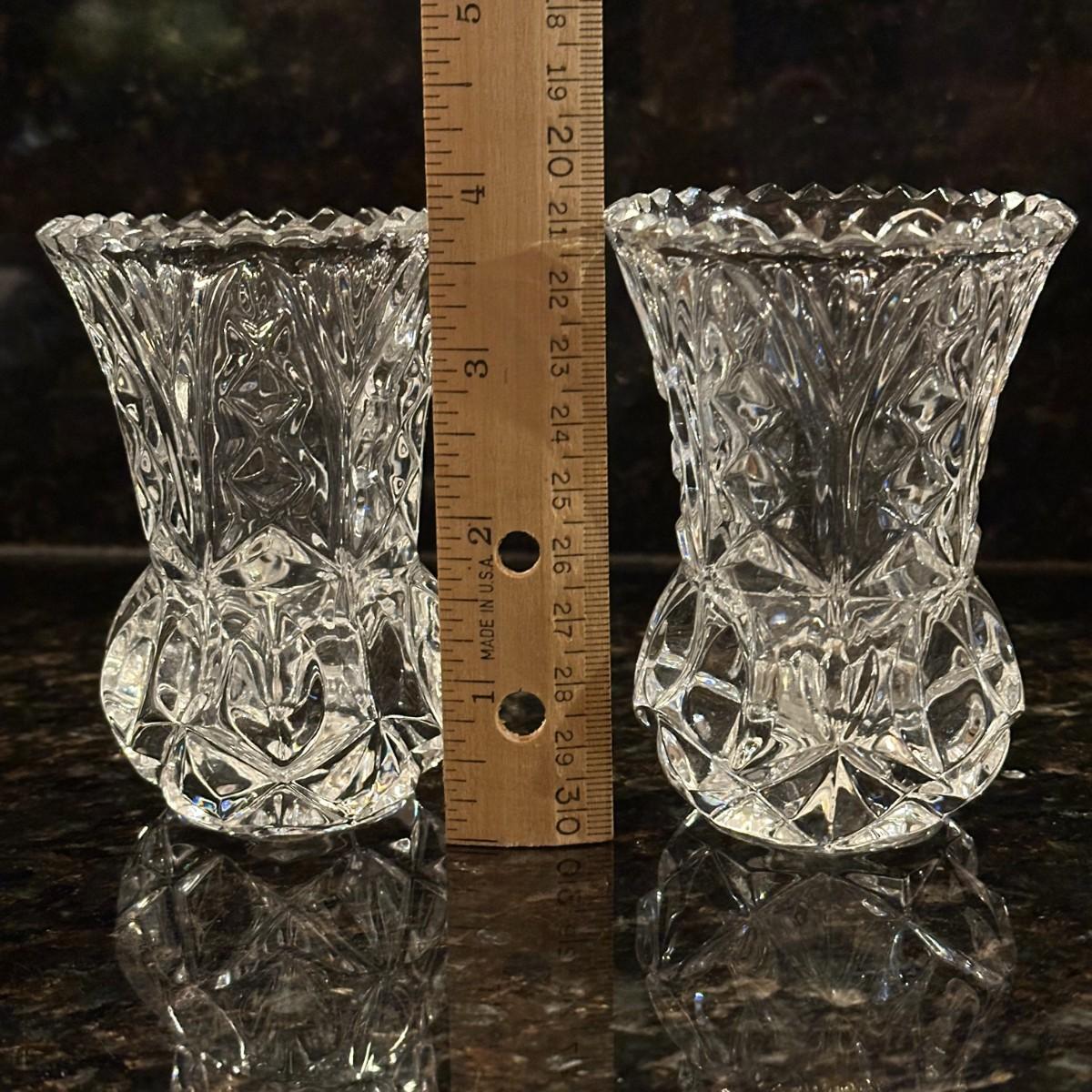 Lot of 2 Heavy Glass Candle Holders with ornate cut style pattern and flared tops. No visible chips or cracks.