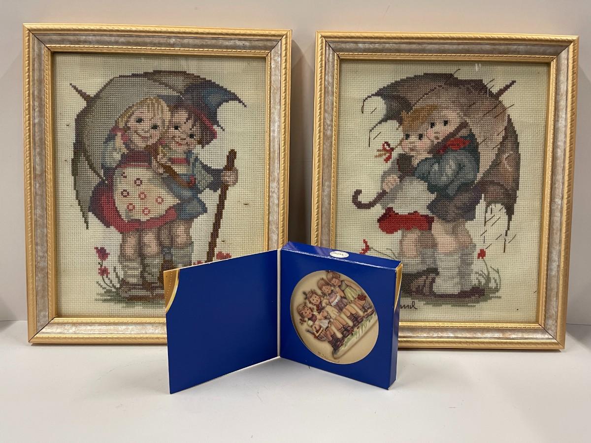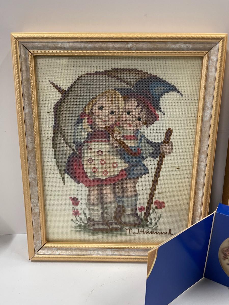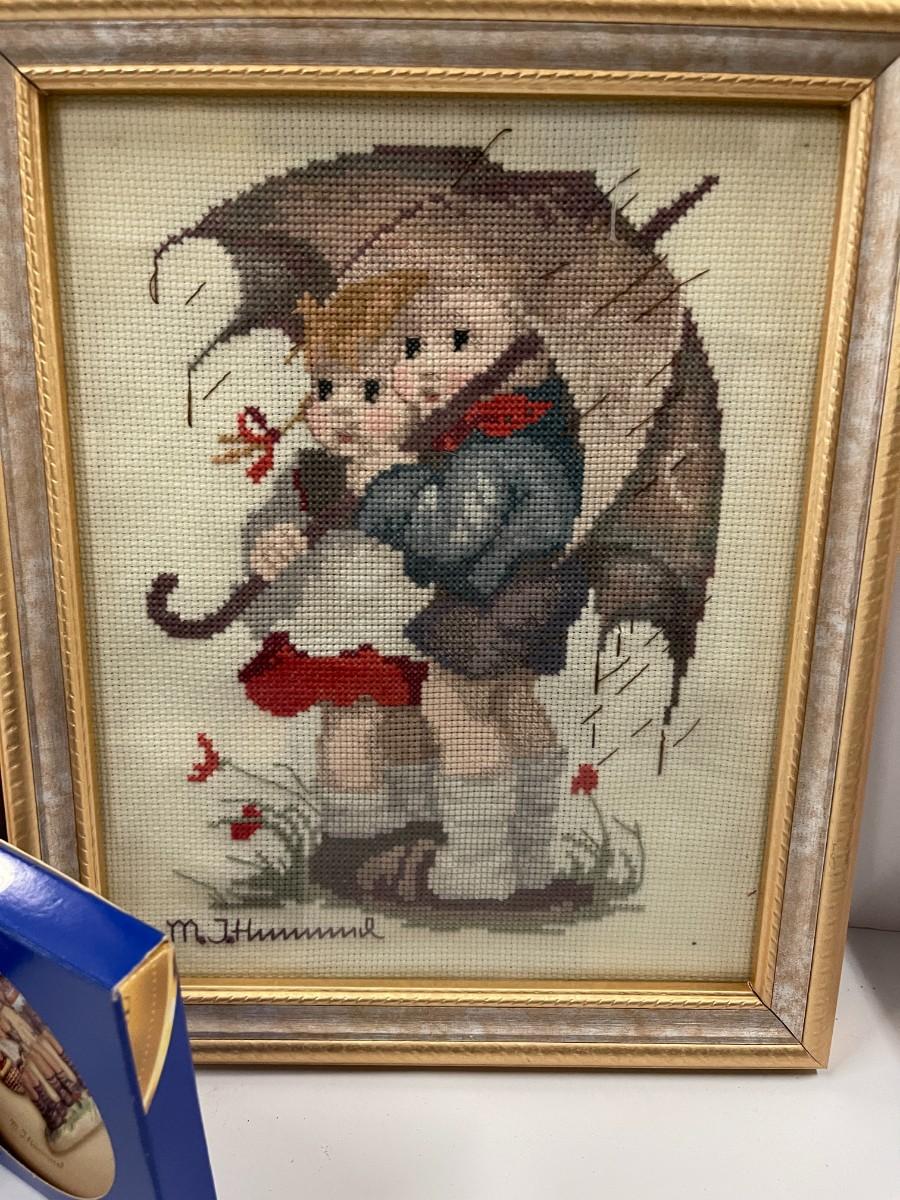Lot of 2 Hummel Framed Cross Stitches and Small Trinket Dish