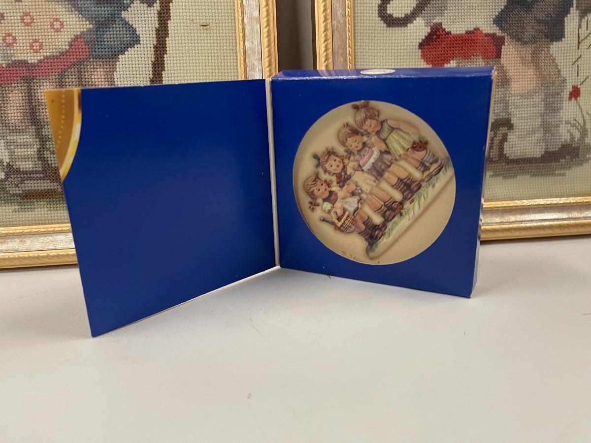 Lot of 2 Hummel Framed Cross Stitches and Small Trinket Dish, new in box. Frames are 9 x 11 and trinket dish box is 4"