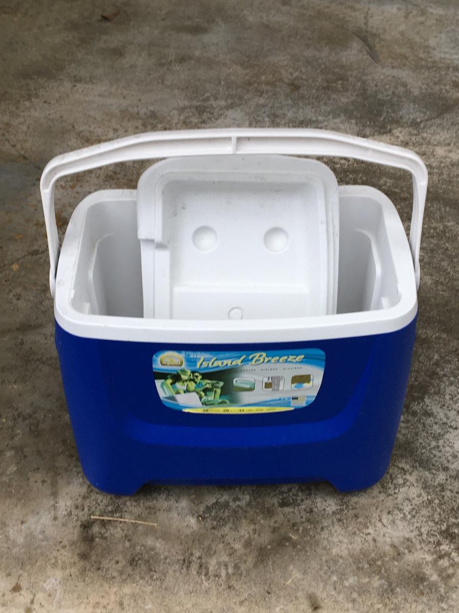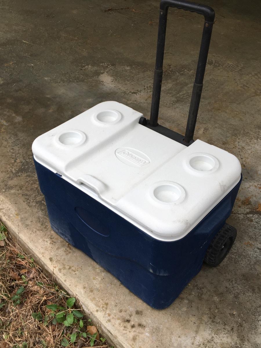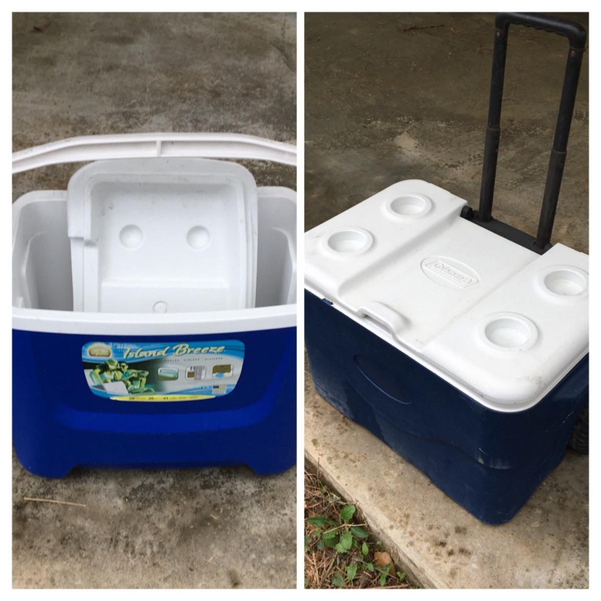 Lot of 2 Ice chests - Coleman ice chest on wheels, fair condition (has an outside tear on the bottom right corner), and 28-quart Igloo ice chest, good condition