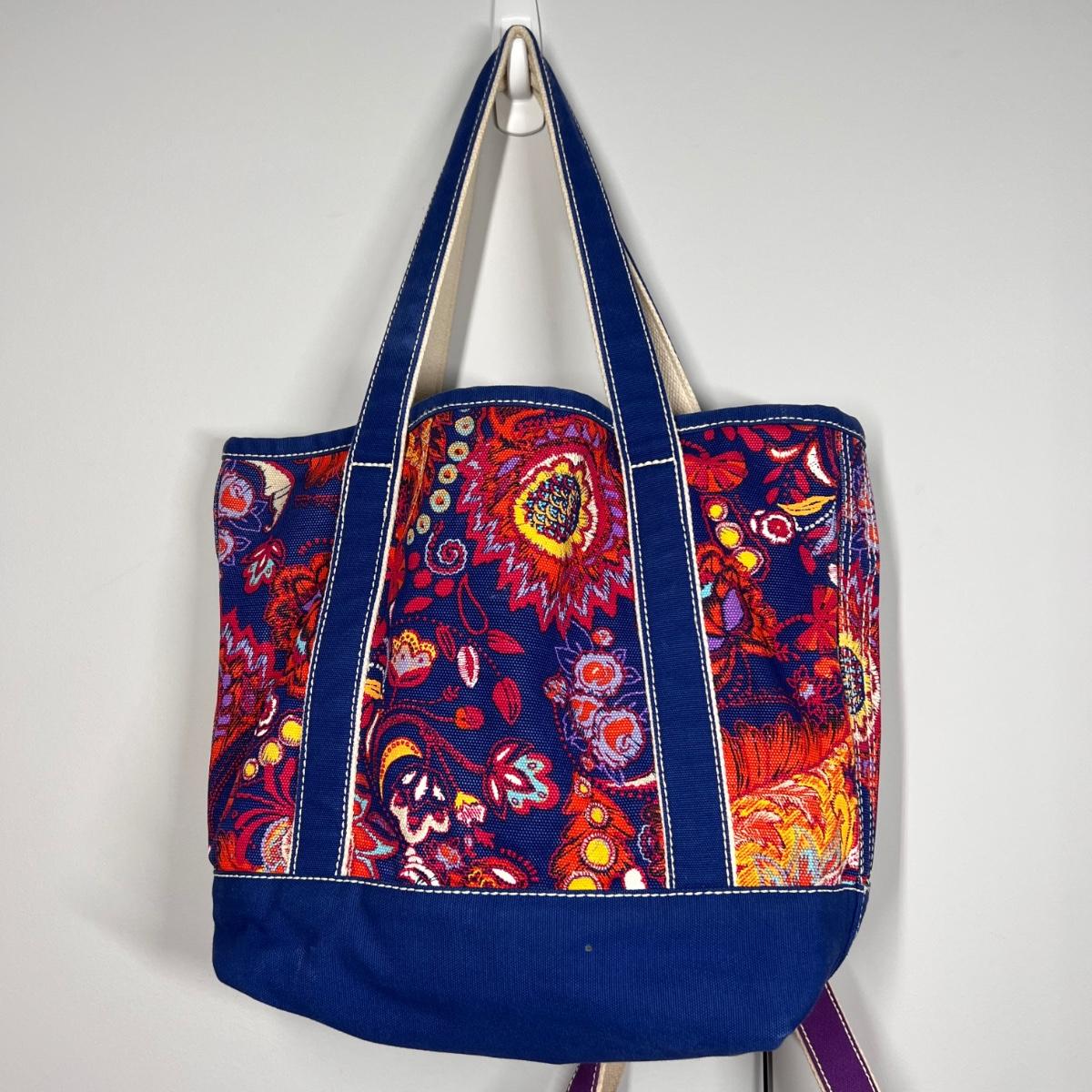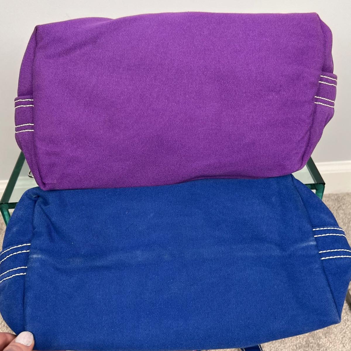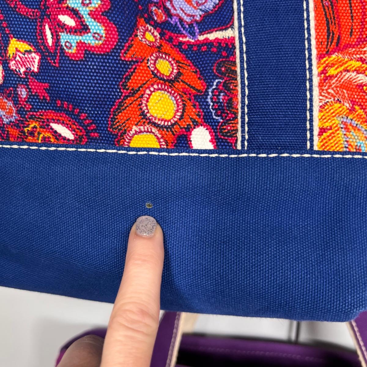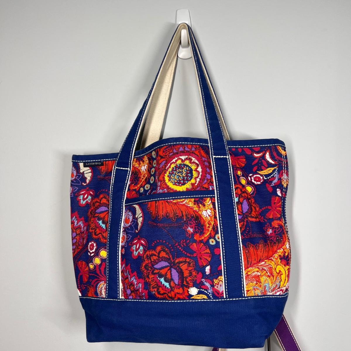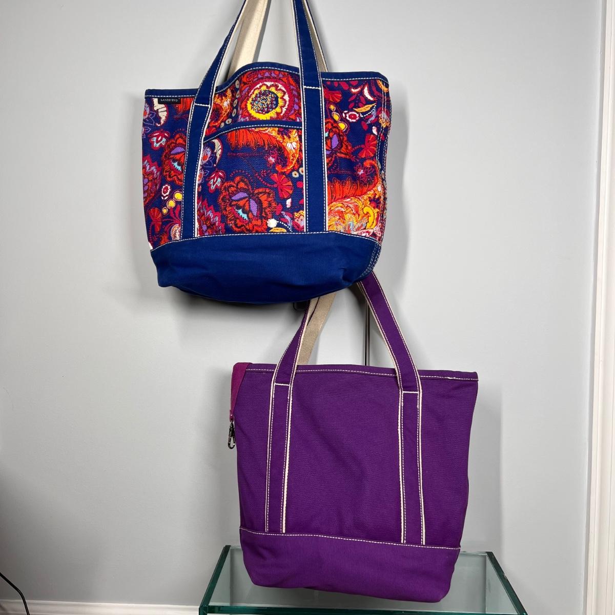 2 medium Lands End Camvas tote bags. Purple has minor spot condition rated as very good. Blue floral is has some minor spots to outside. Spotting in interior. Condition is rated as good.