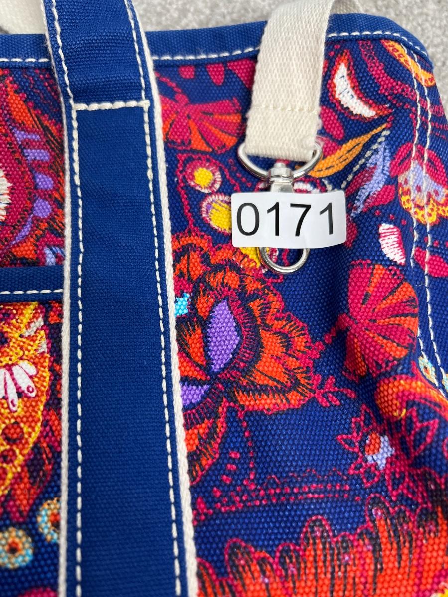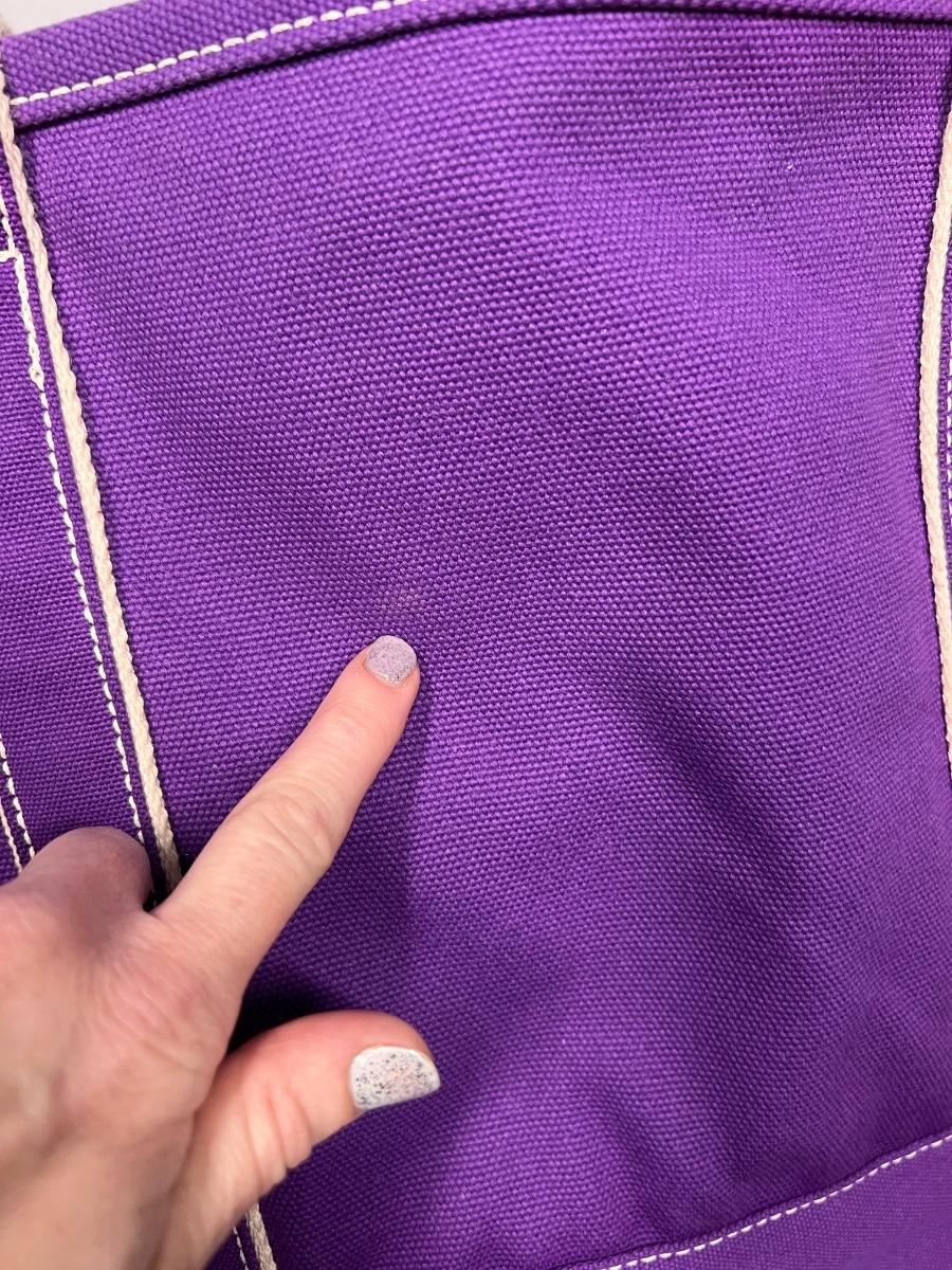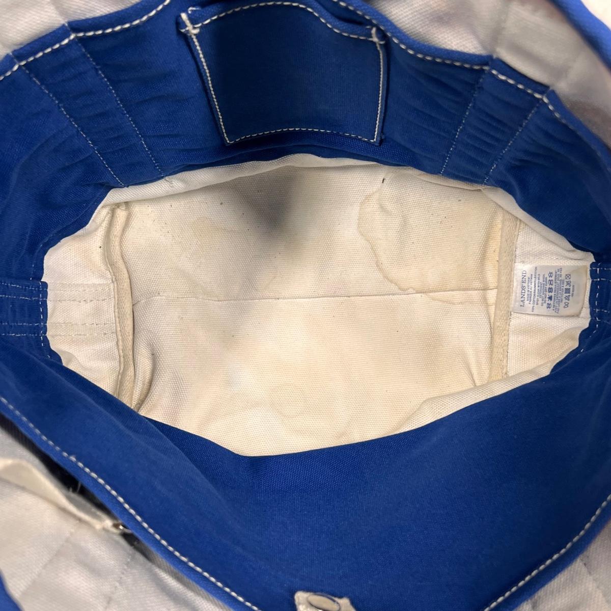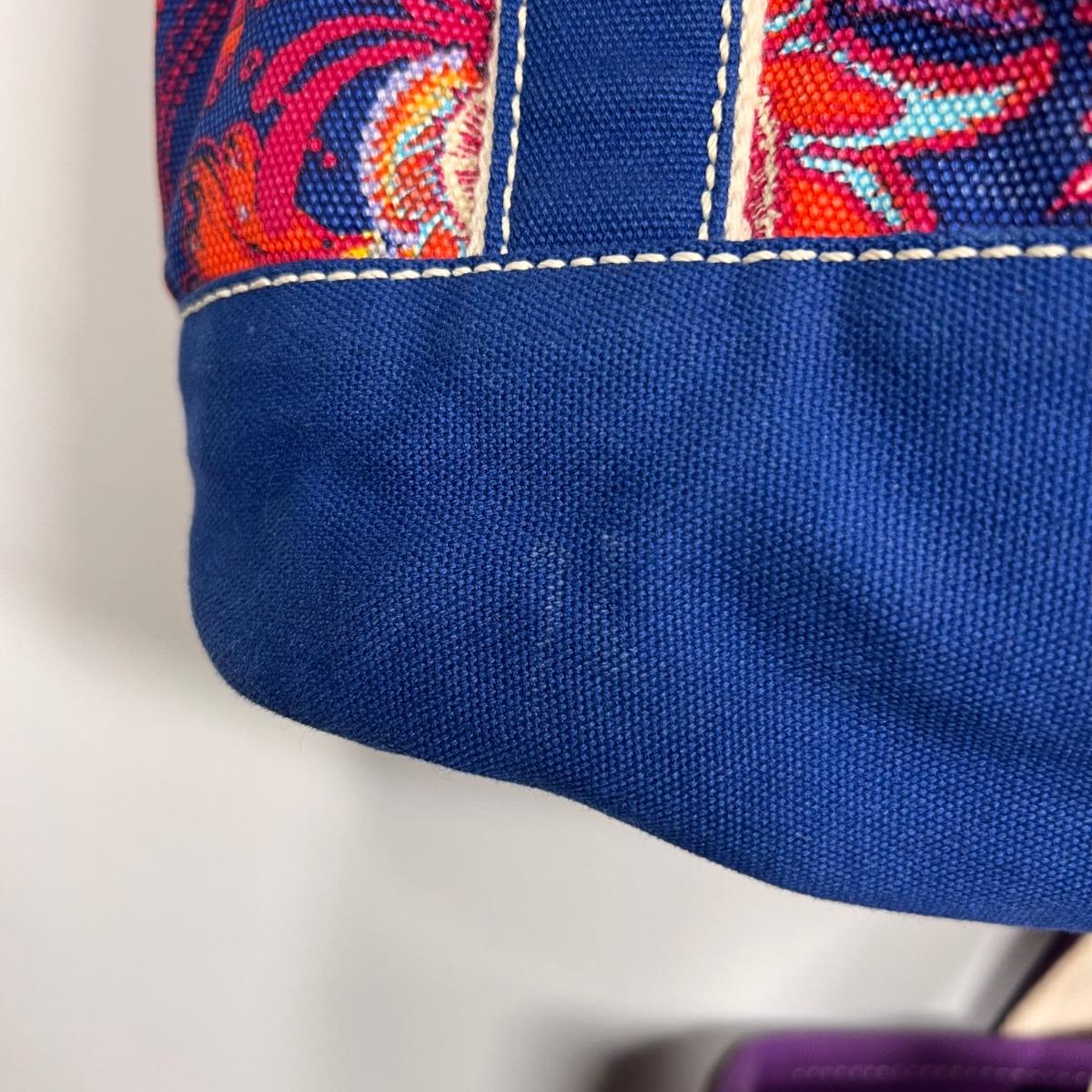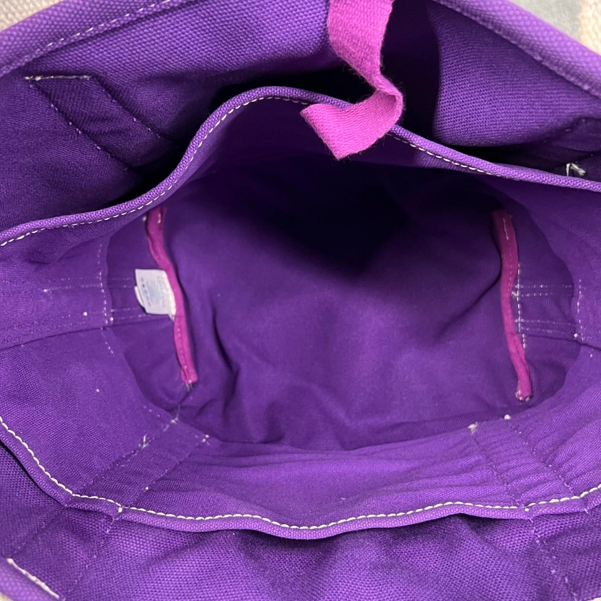 2 medium Lands End Camvas tote bags. Purple has minor spot condition rated as very good. Blue floral is has some minor spots to outside. Spotting in interior. Condition is rated as good.