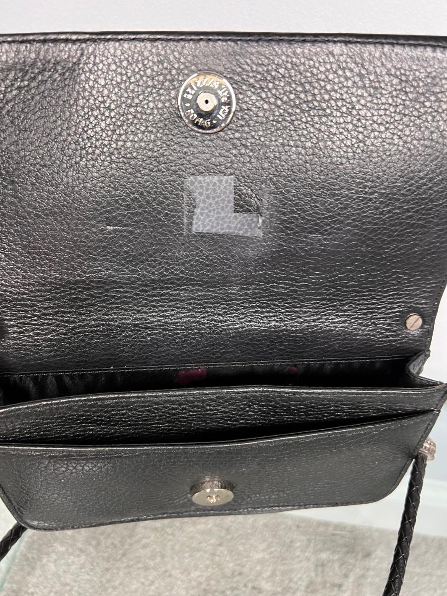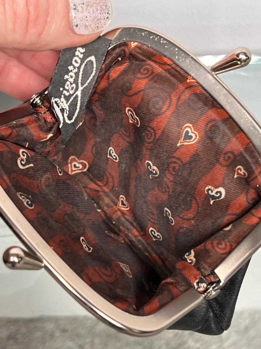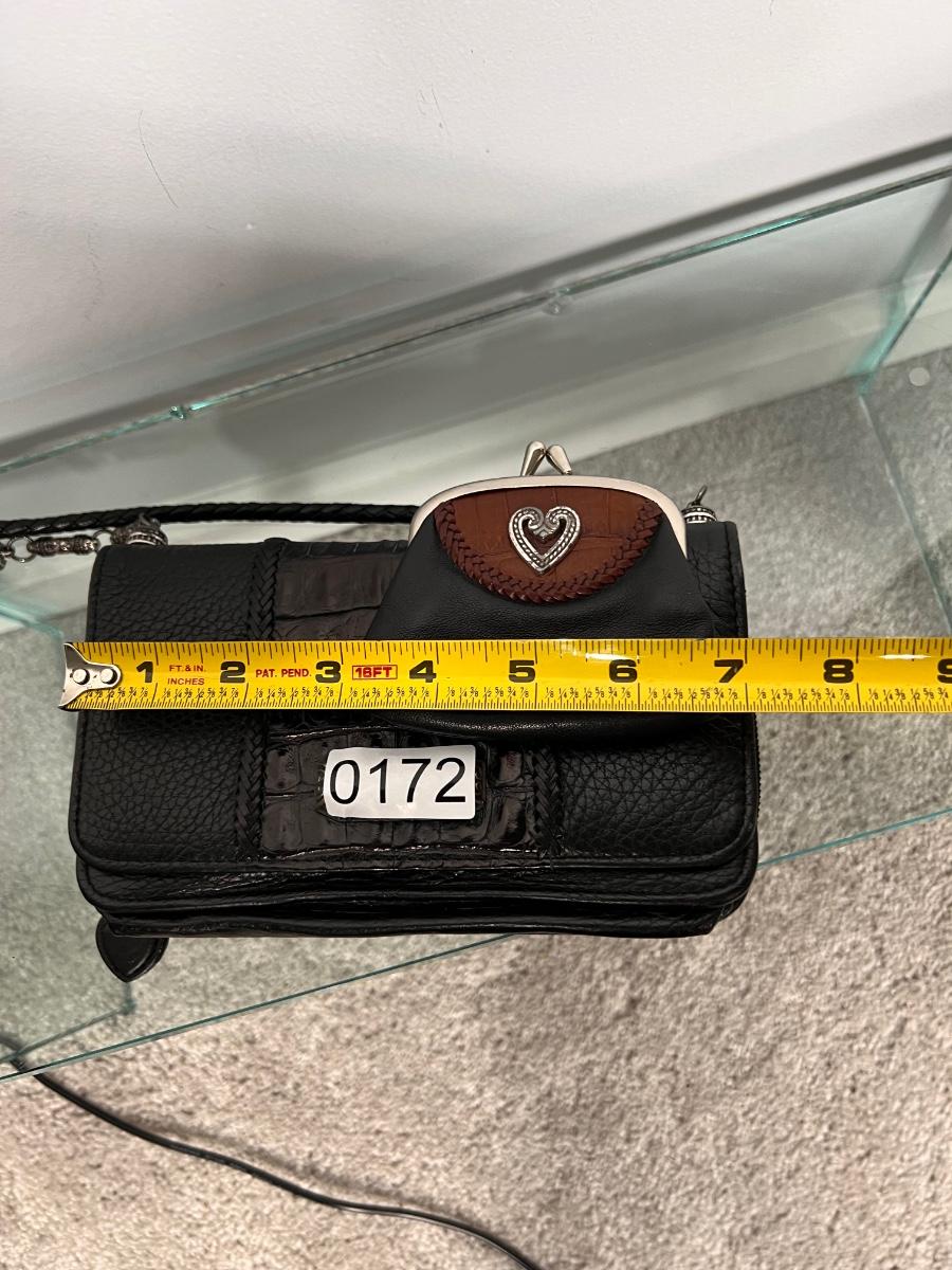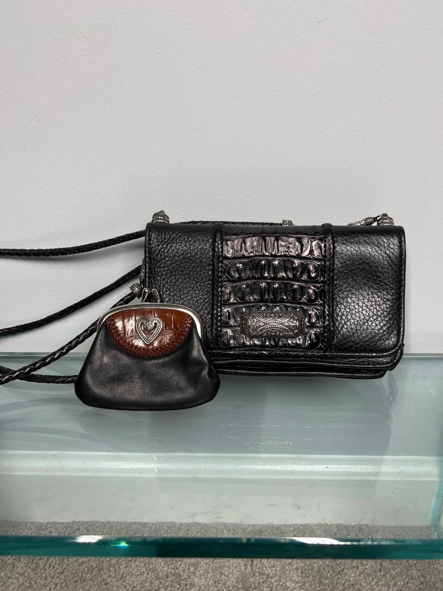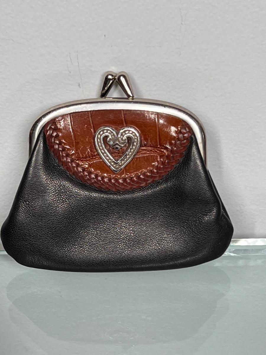 Small brown and black leather kiss lock coin purse with silver heart hardware. Crossbody shoulder black leather purse with wallet compartment. 29” shoulder drop. Both are in fair to good condition. Interior purse has marks, corner has slight wear. Coin purse shoes wear to interior and exterior.
