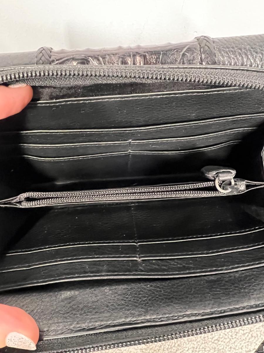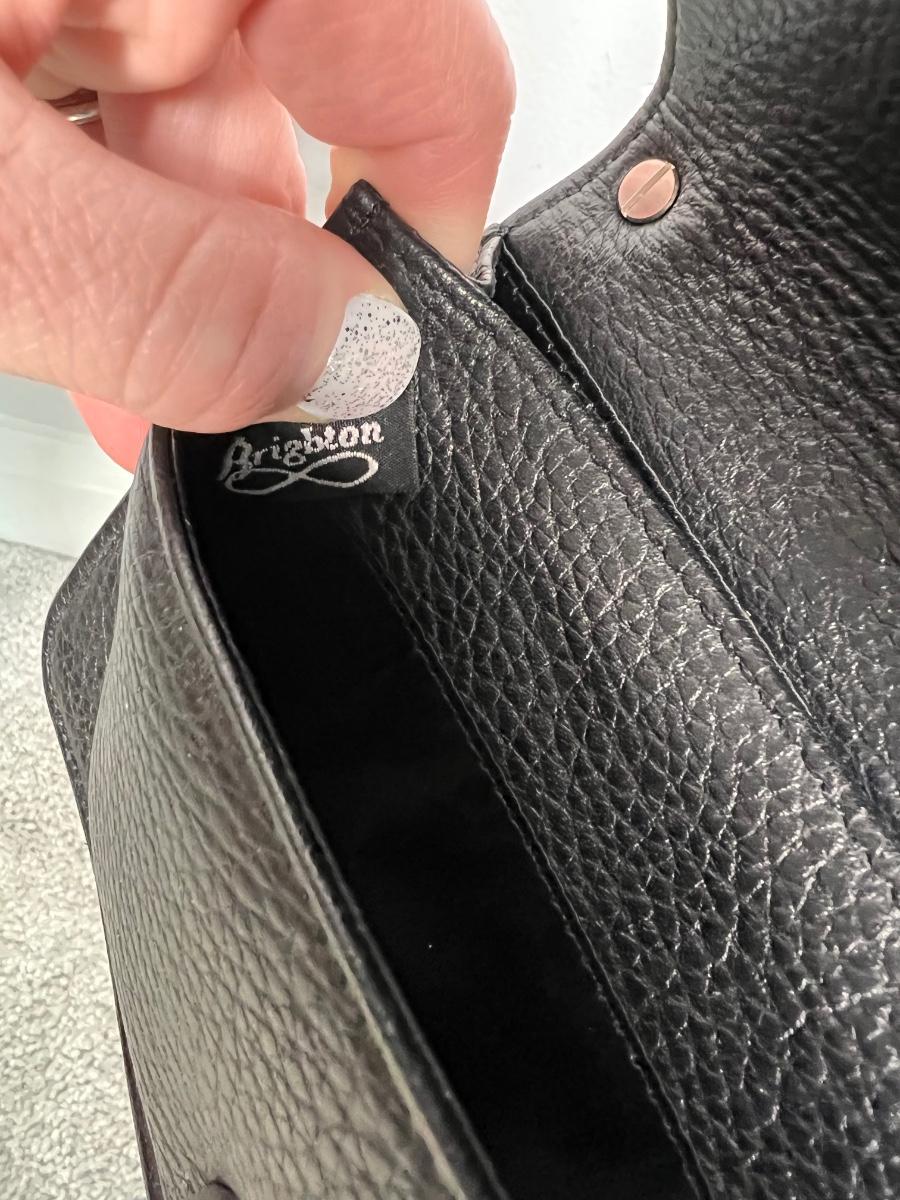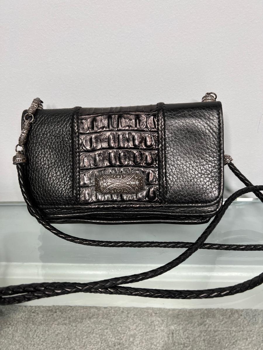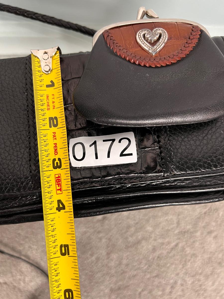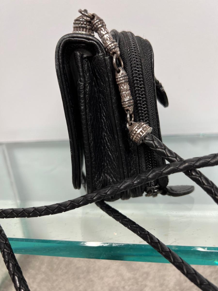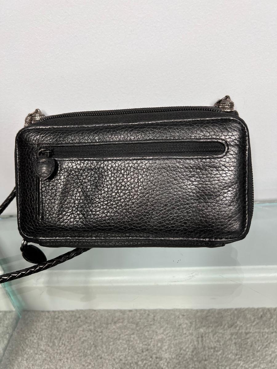 Small brown and black leather kiss lock coin purse with silver heart hardware. Crossbody shoulder black leather purse with wallet compartment. 29” shoulder drop. Both are in fair to good condition. Interior purse has marks, corner has slight wear. Coin purse shoes wear to interior and exterior.