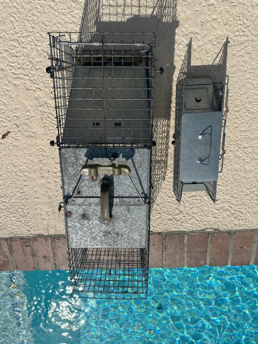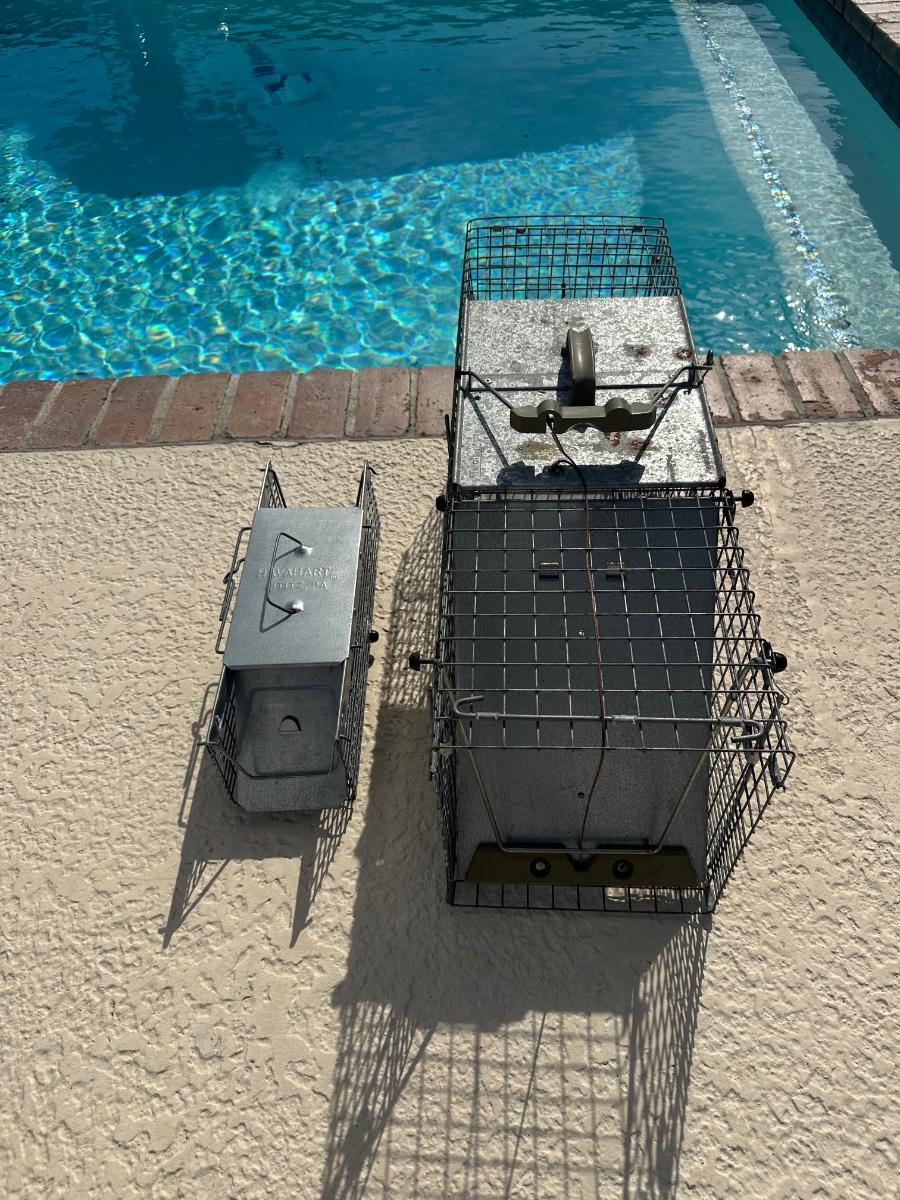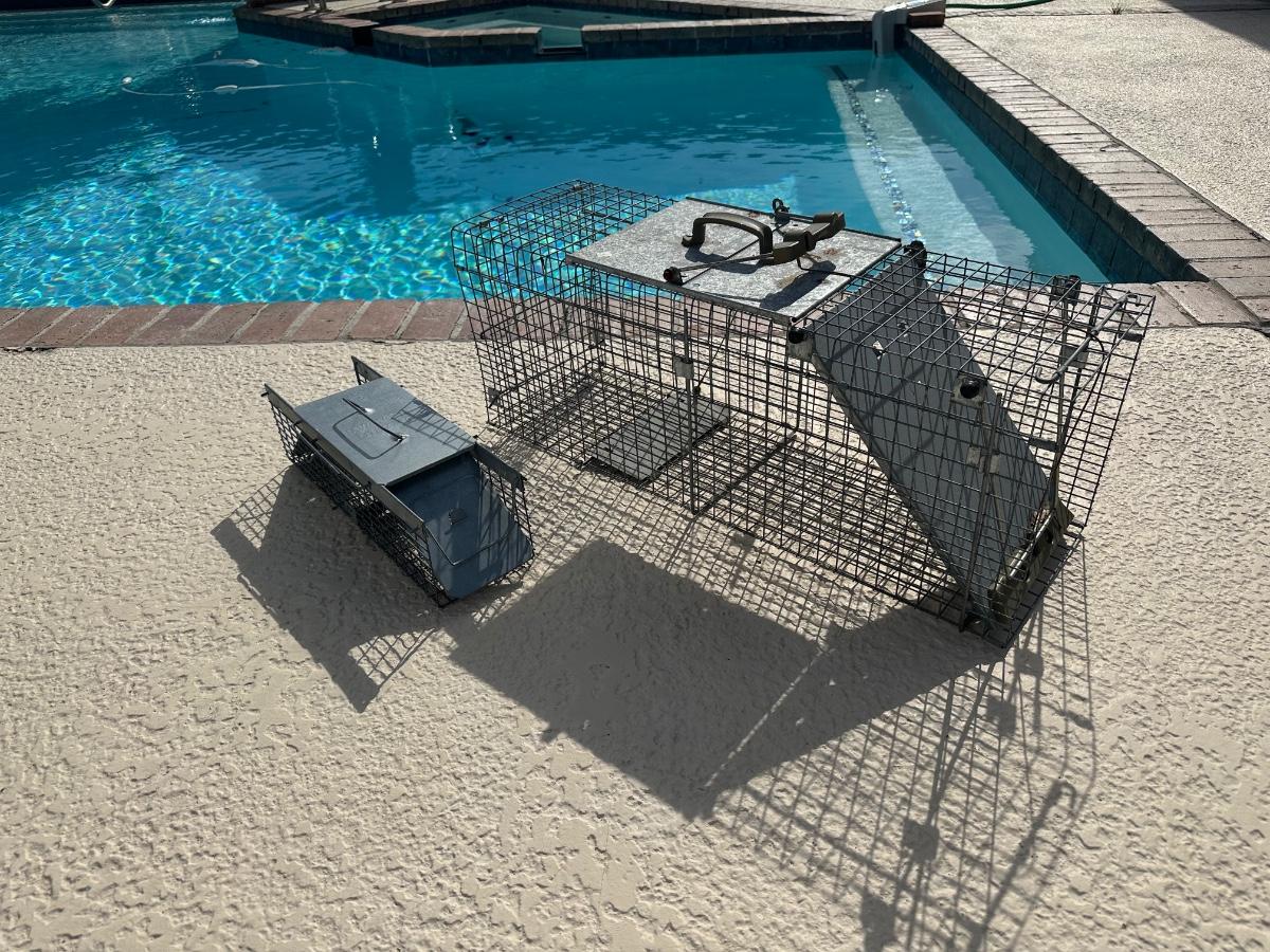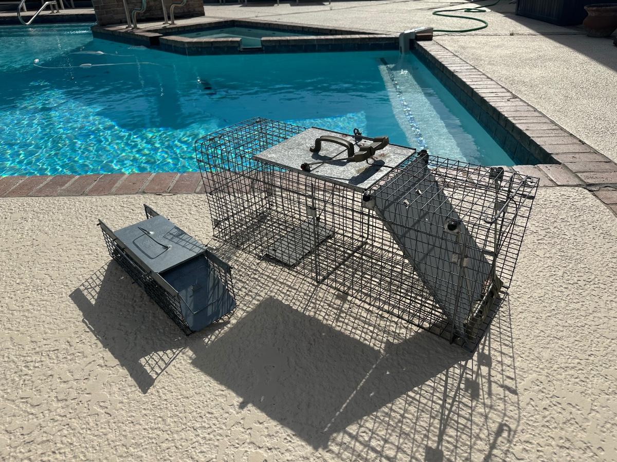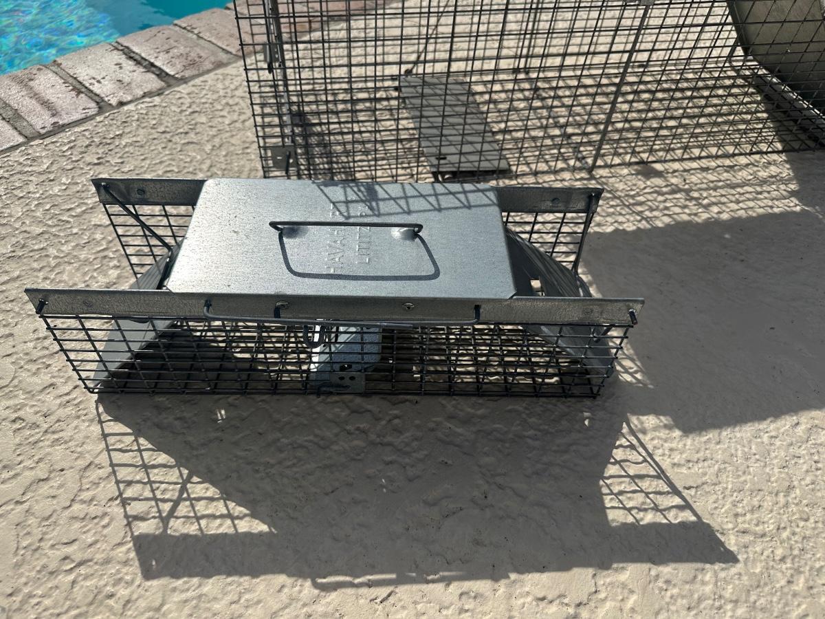 Lot of two live animal traps, including one larger and one smaller trap. Show surface rust, wear, and weathering consistent with outdoor use (see photos).