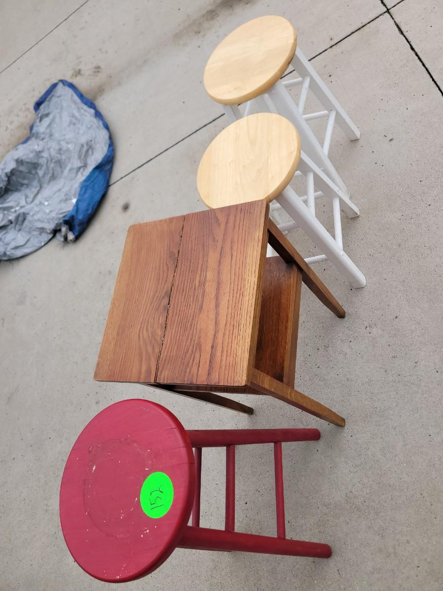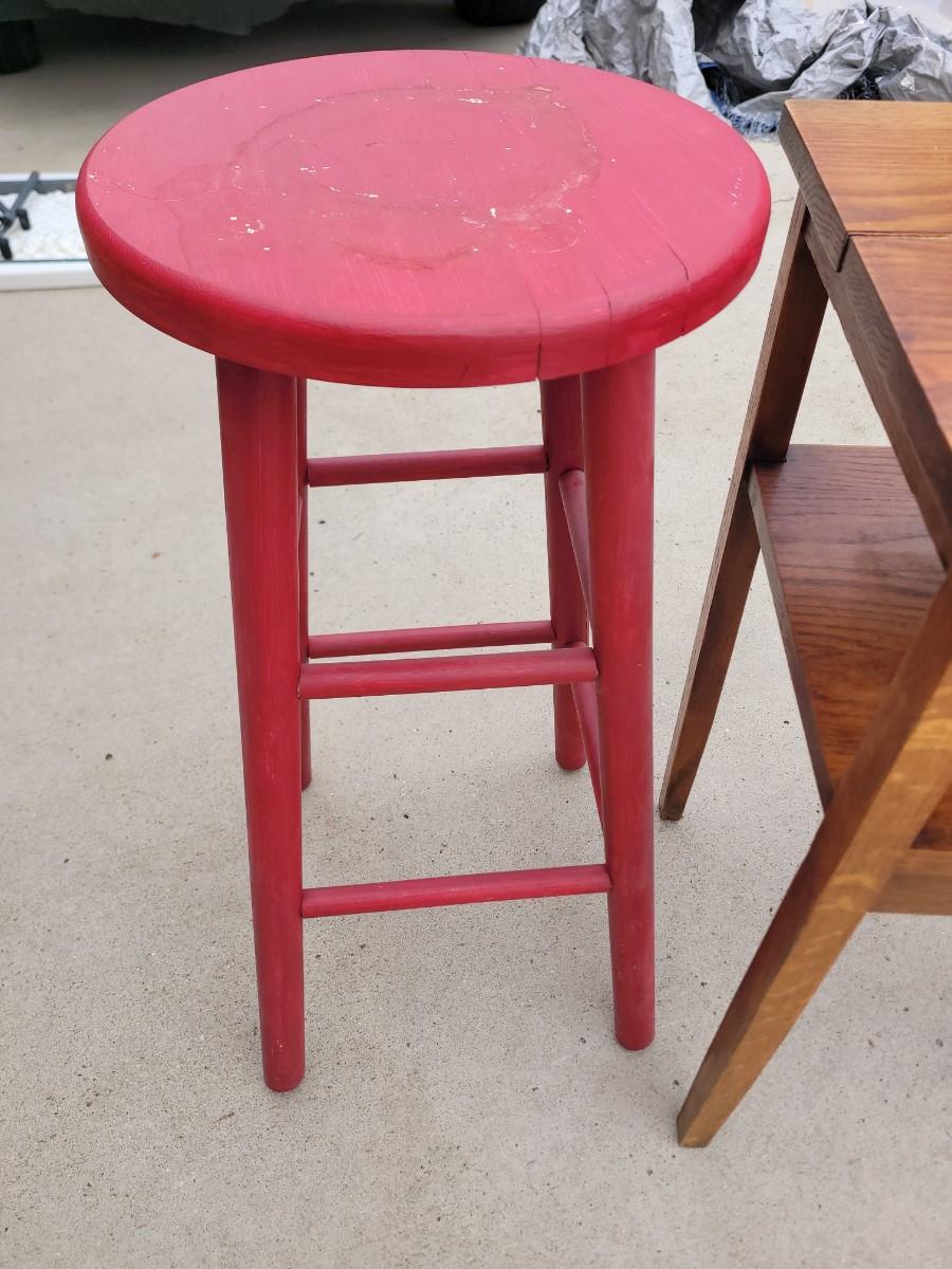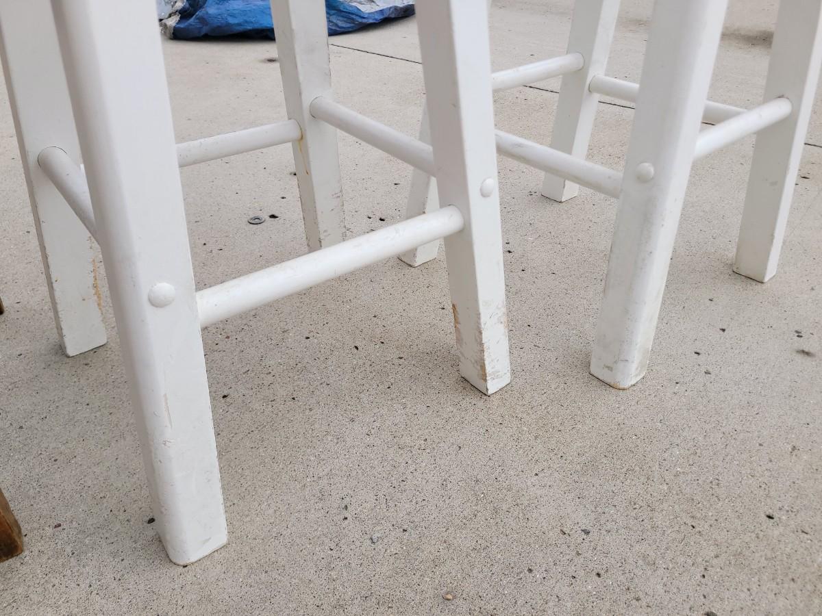 The white barstools are 24" high, the red one is 29" high and the table os 28" high and about 16" x 16" square, could use some glue and a clamp and the white barstools have Slight leg scratches see pics