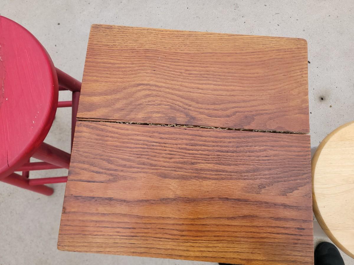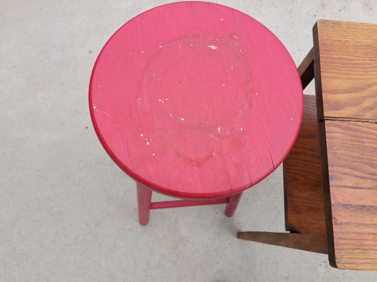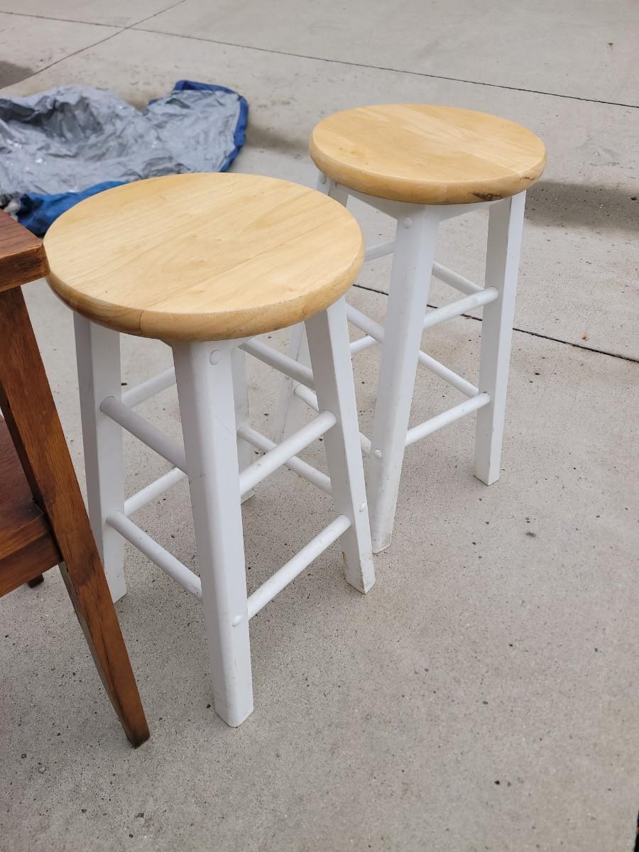 The white barstools are 24" high, the red one is 29" high and the table os 28" high and about 16" x 16" square, could use some glue and a clamp and the white barstools have Slight leg scratches see pics
