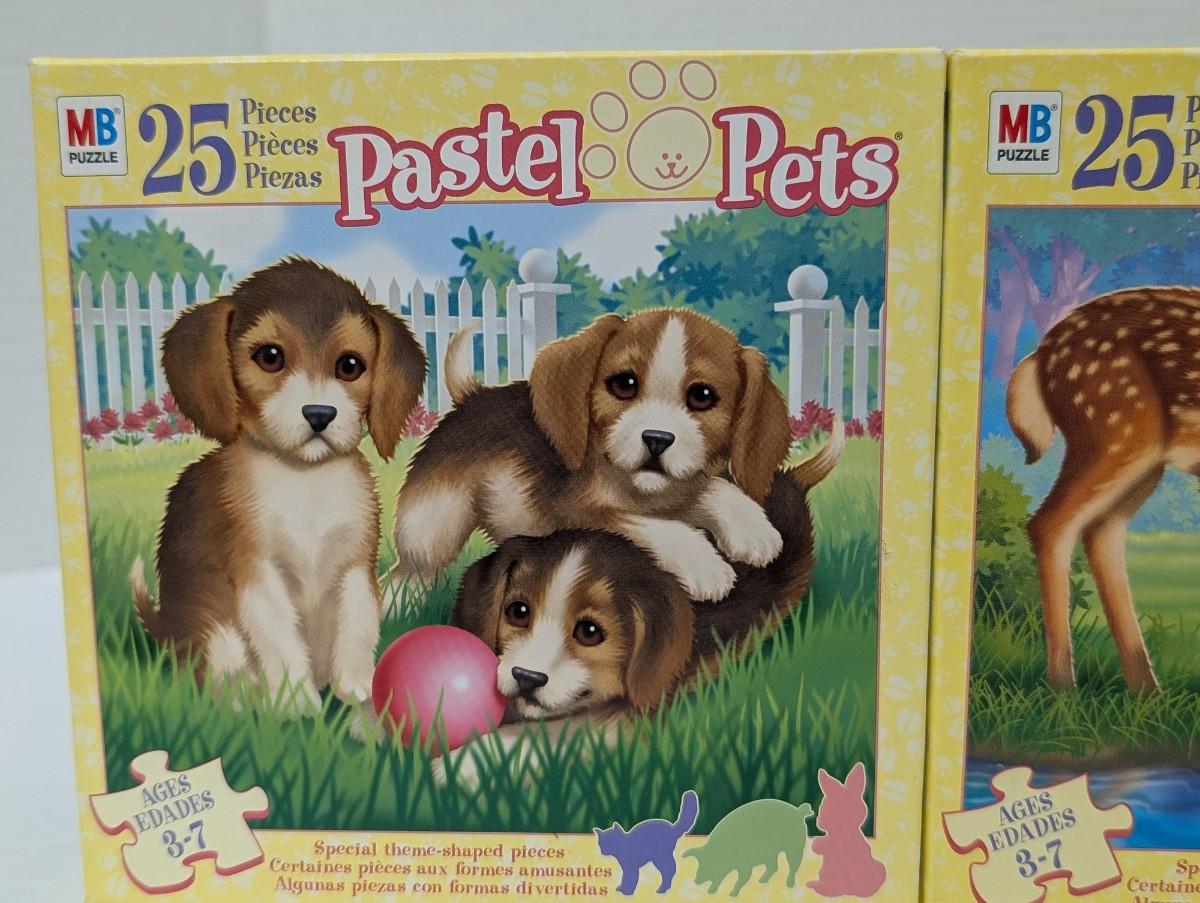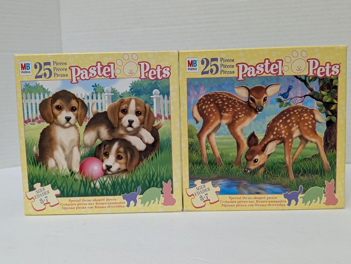 Adorable vintage MB Puzzle set from the Pastel Pets collection. This lot includes two 25 piece puzzles:
