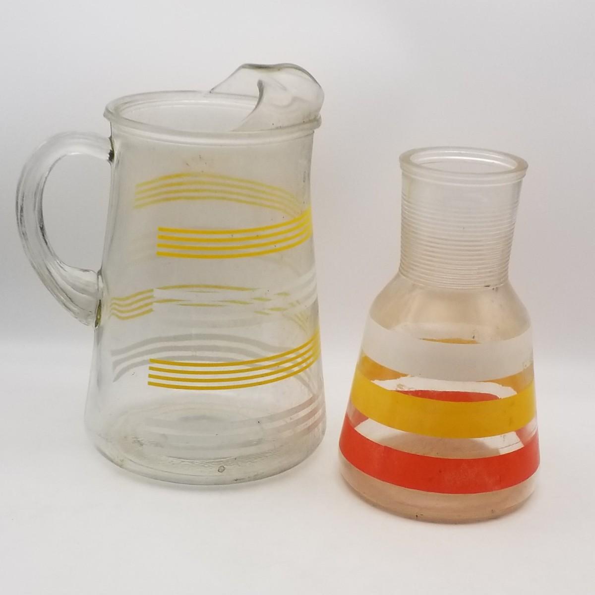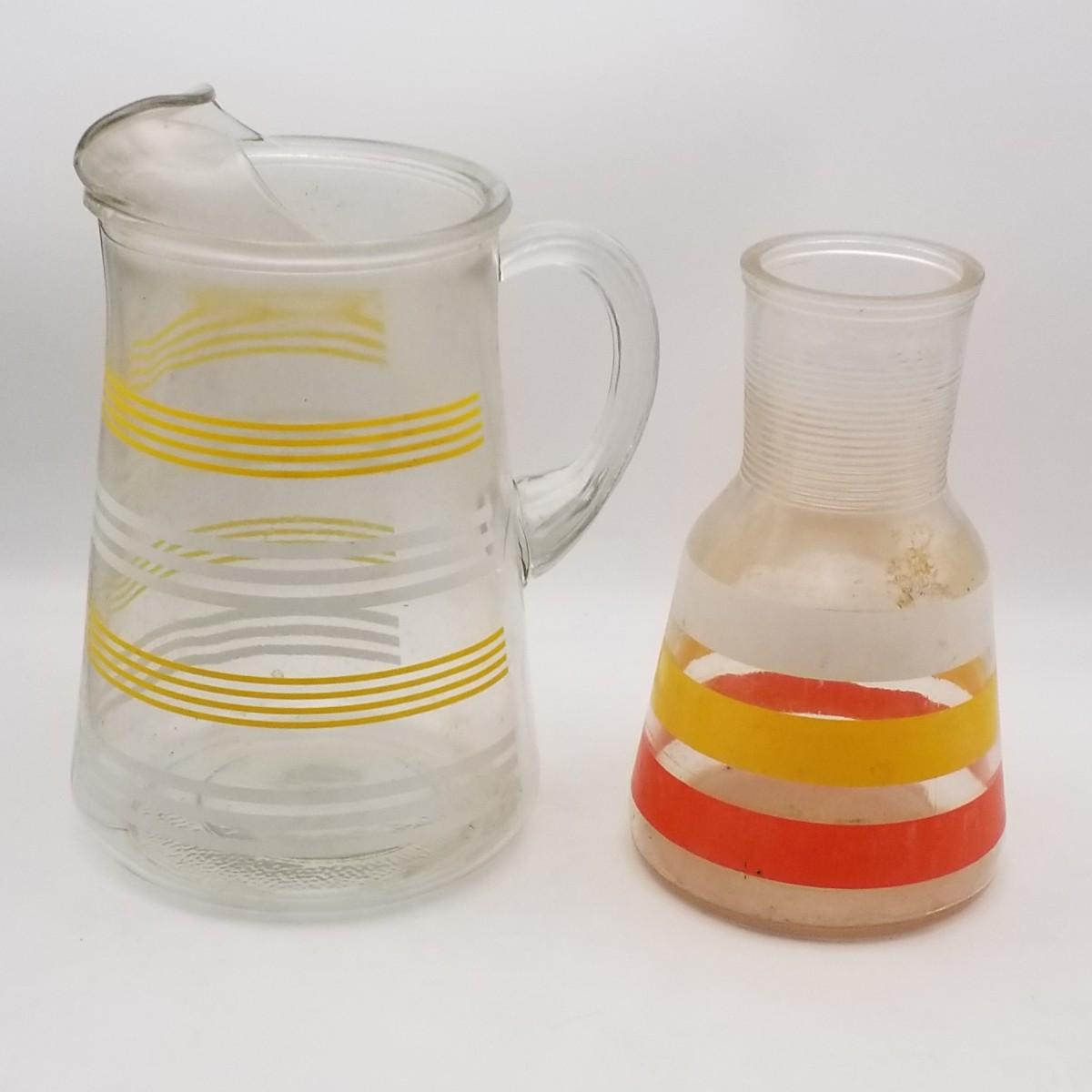Title: Lot of 2 MCM Vintage Glass Juice Pitchers Decanters: Anchor Hocking Fiesta Striped, Unknown Maker Striped Possibly Hazel Atlas (Yellow White Orange Ombre Mid Century Modern)