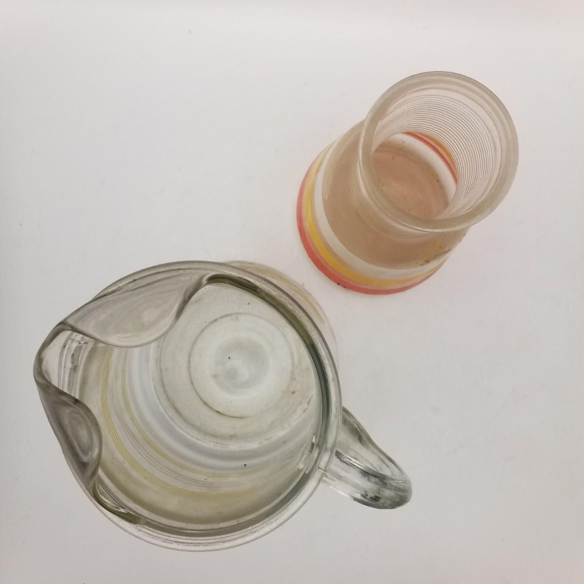 Lot of 2 MCM Vintage Glass Juice Pitchers Decanters: Anchor Hocking Fiesta Striped, Unknown Maker Striped Possibly Hazel Atlas (Yellow White Orange Ombre Mid Century Modern)