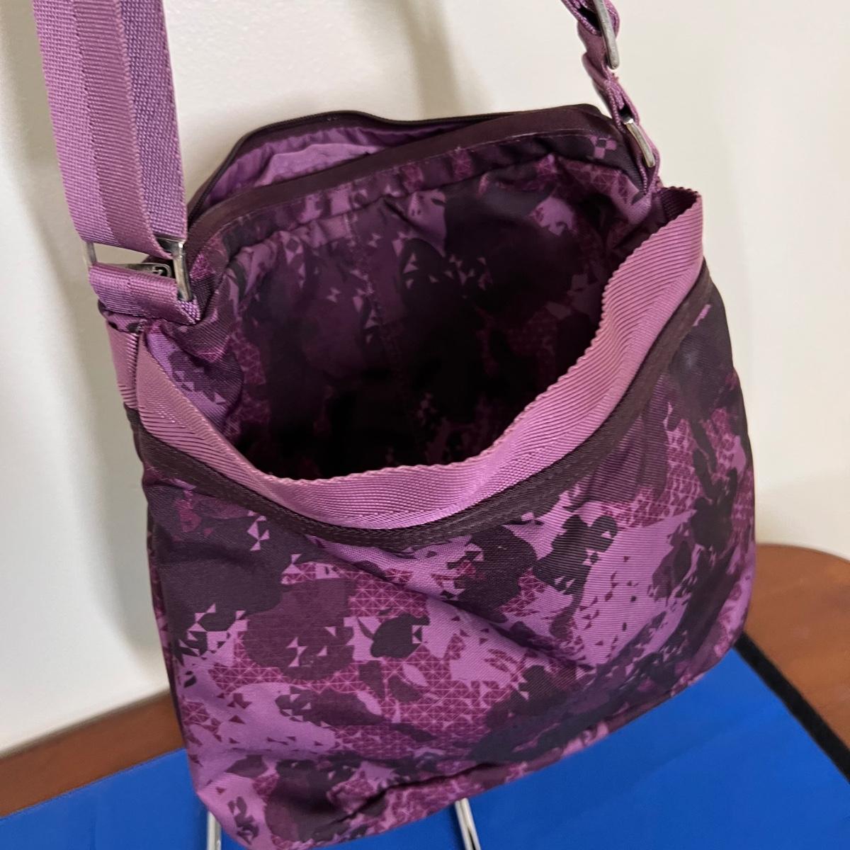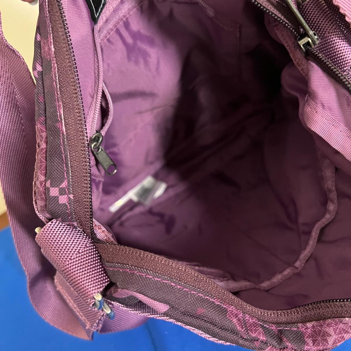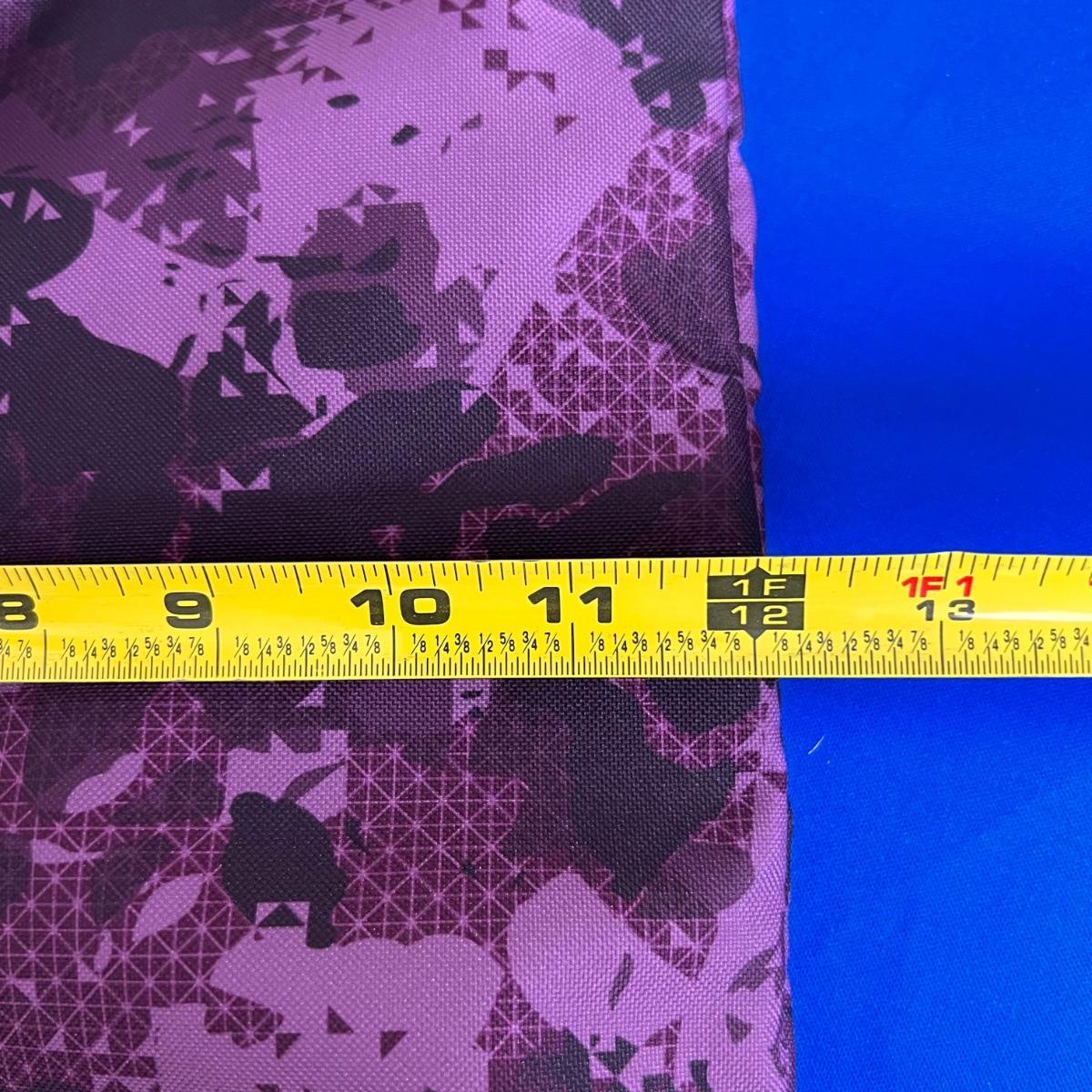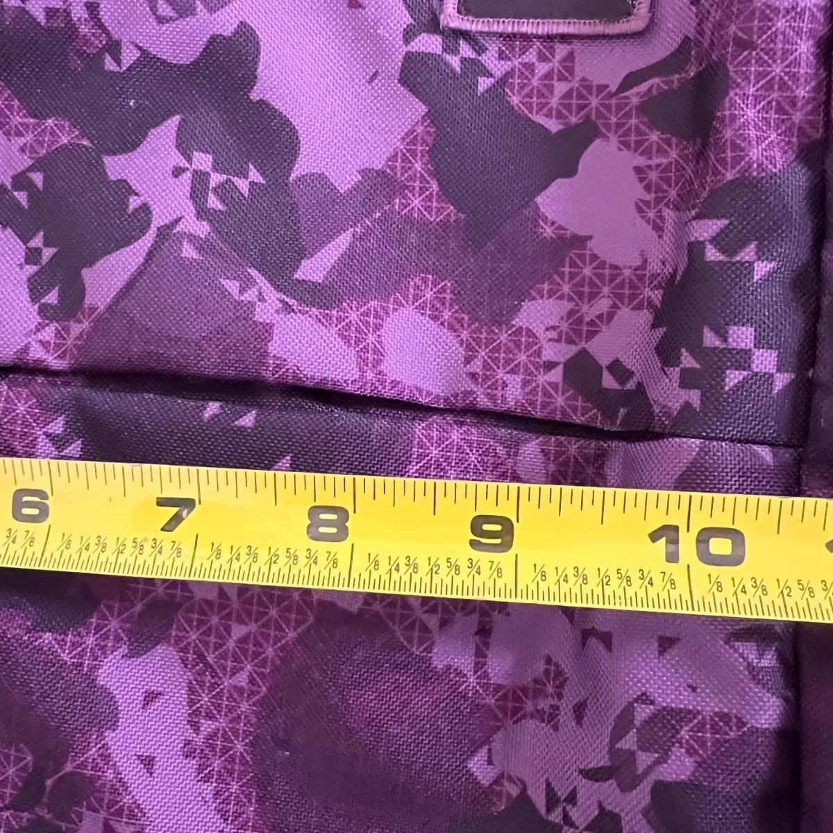 Laying flat it a Purple Camouflage zip tote bag with most of the same features. No visible flaws. Rated very good to excellent condition.