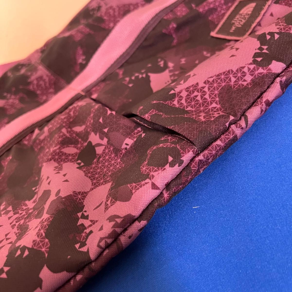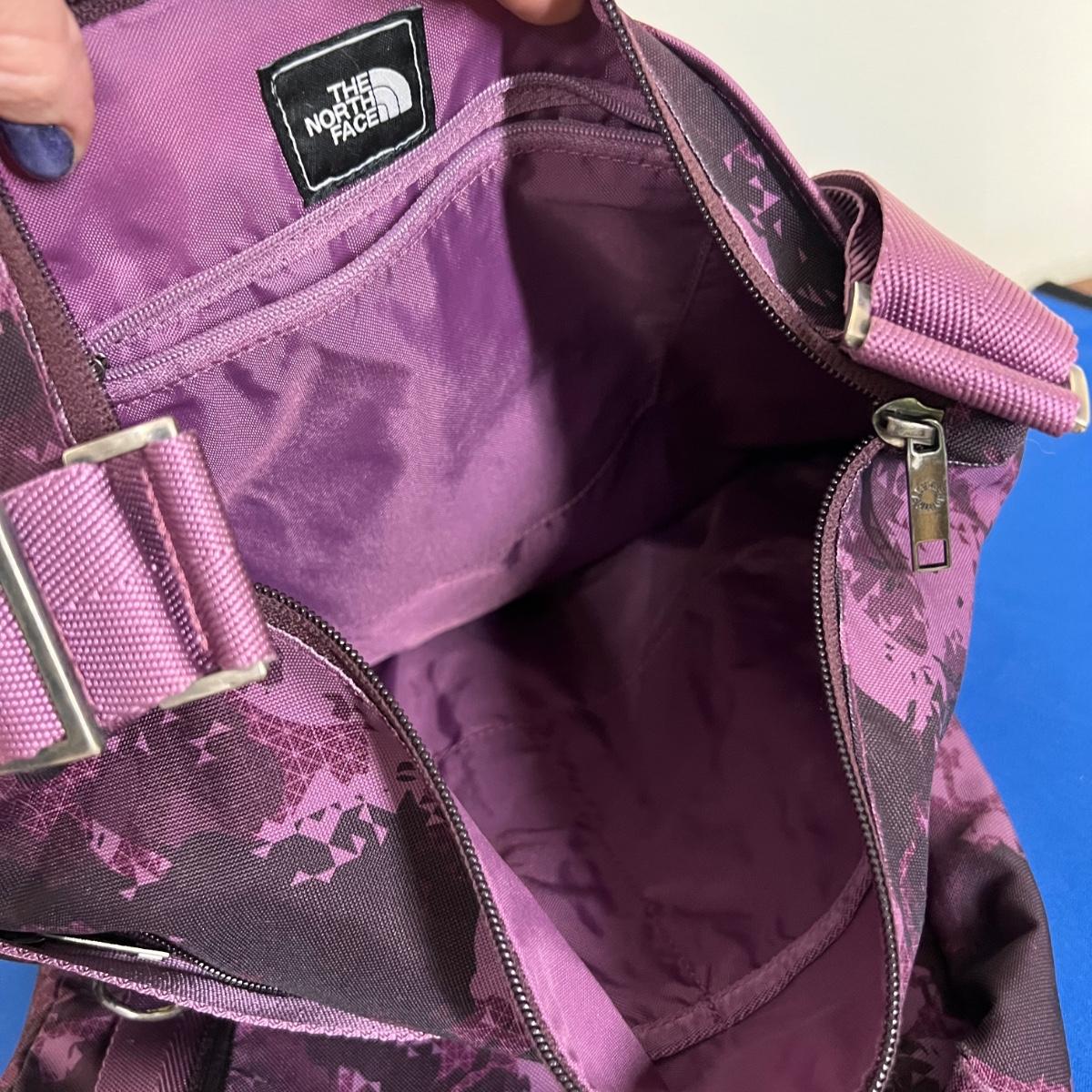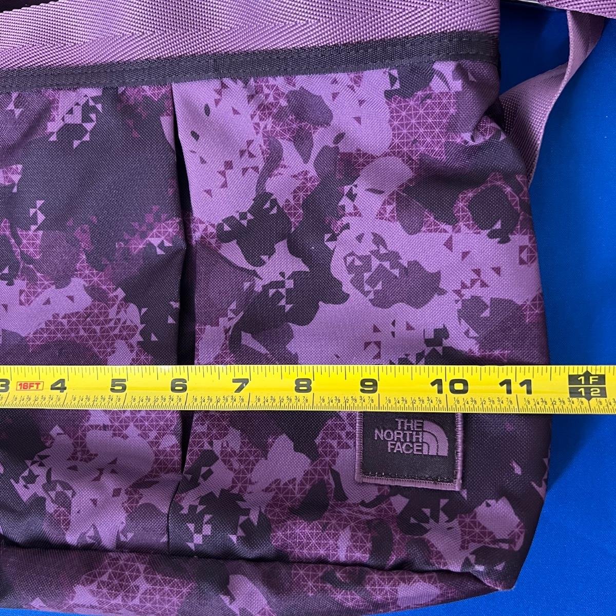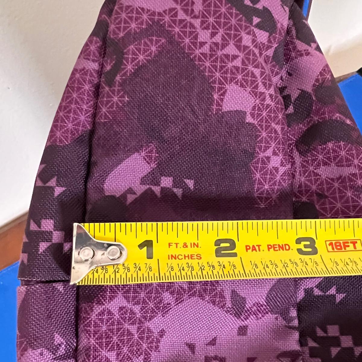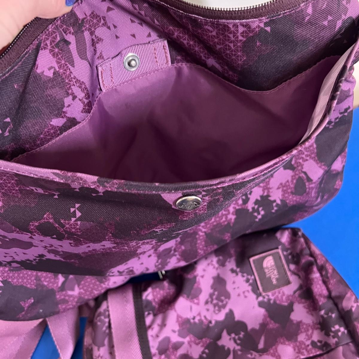 Laying flat it a Purple Camouflage zip tote bag with most of the same features. No visible flaws. Rated very good to excellent condition.
