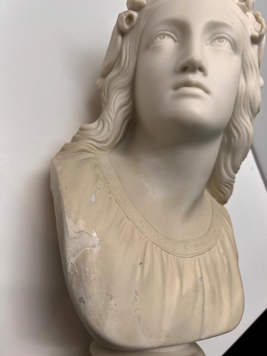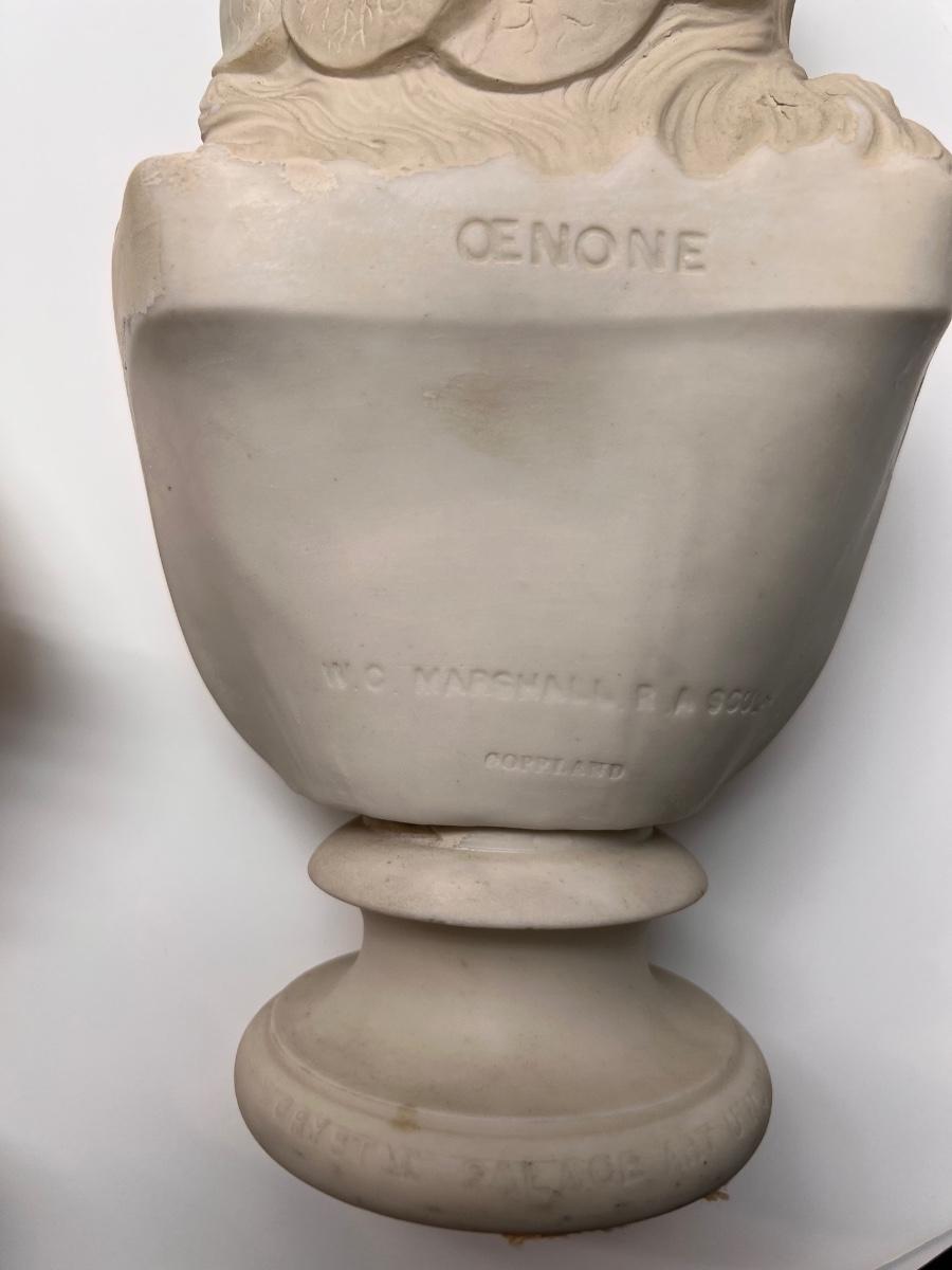 12" Parian bust on round socle, unsigned. 12" tall Parian bust of Oenone on round socle. By Copeland, by W.C. Marshall, R.A. sculptor. Titled and stamped on back.