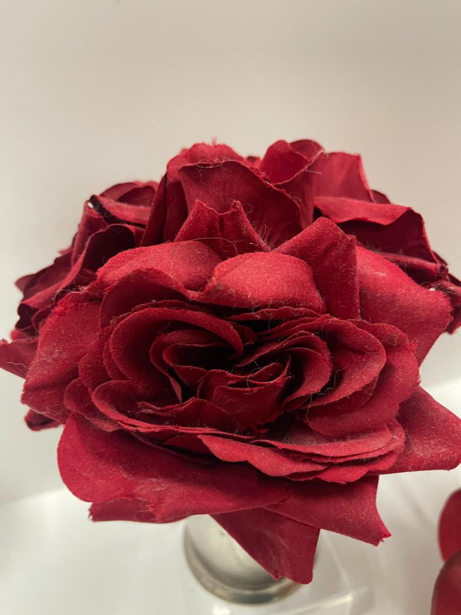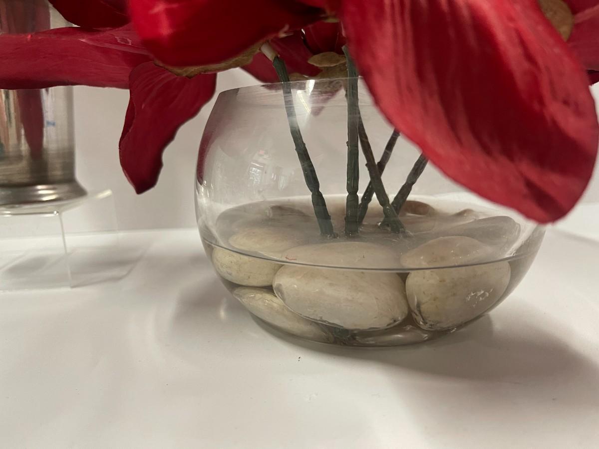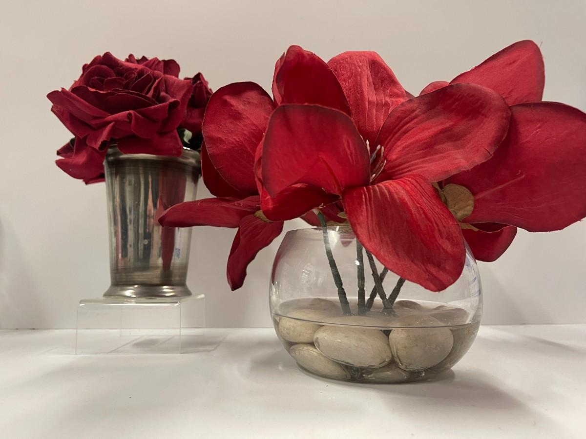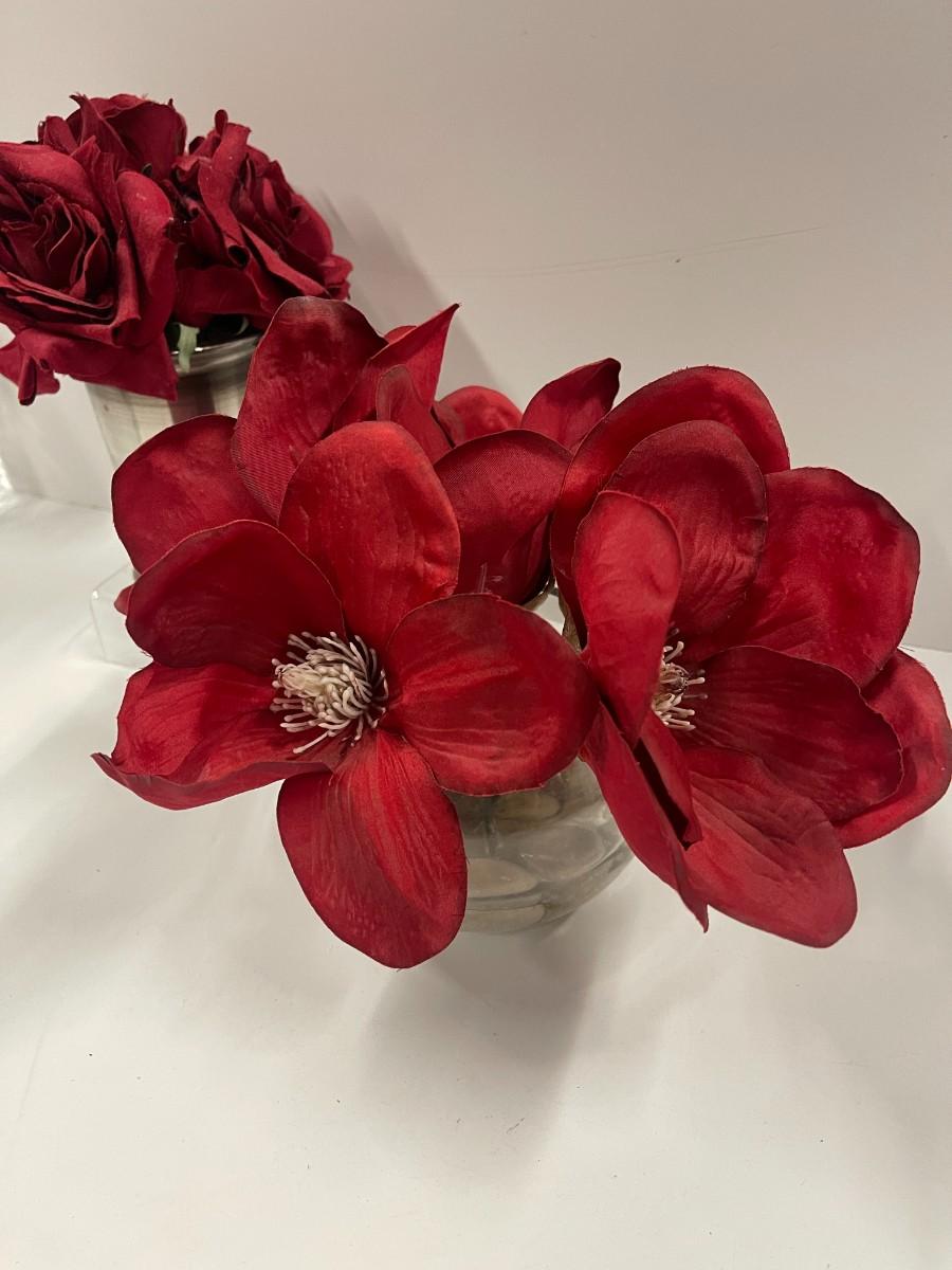 Lot of 2 artificial flowers in vases, red roses and what looks like magnolia flowers. Very good condition. Roses are approx 8" high and magnolia assortment approx 8".