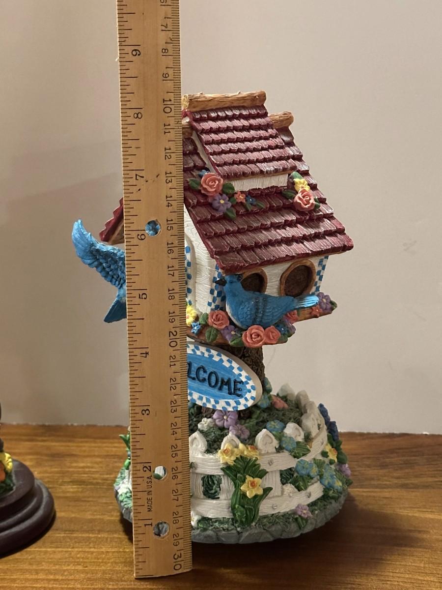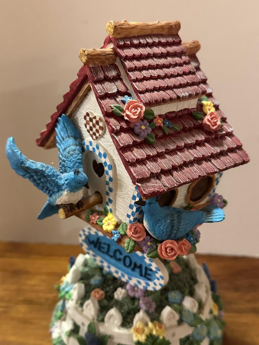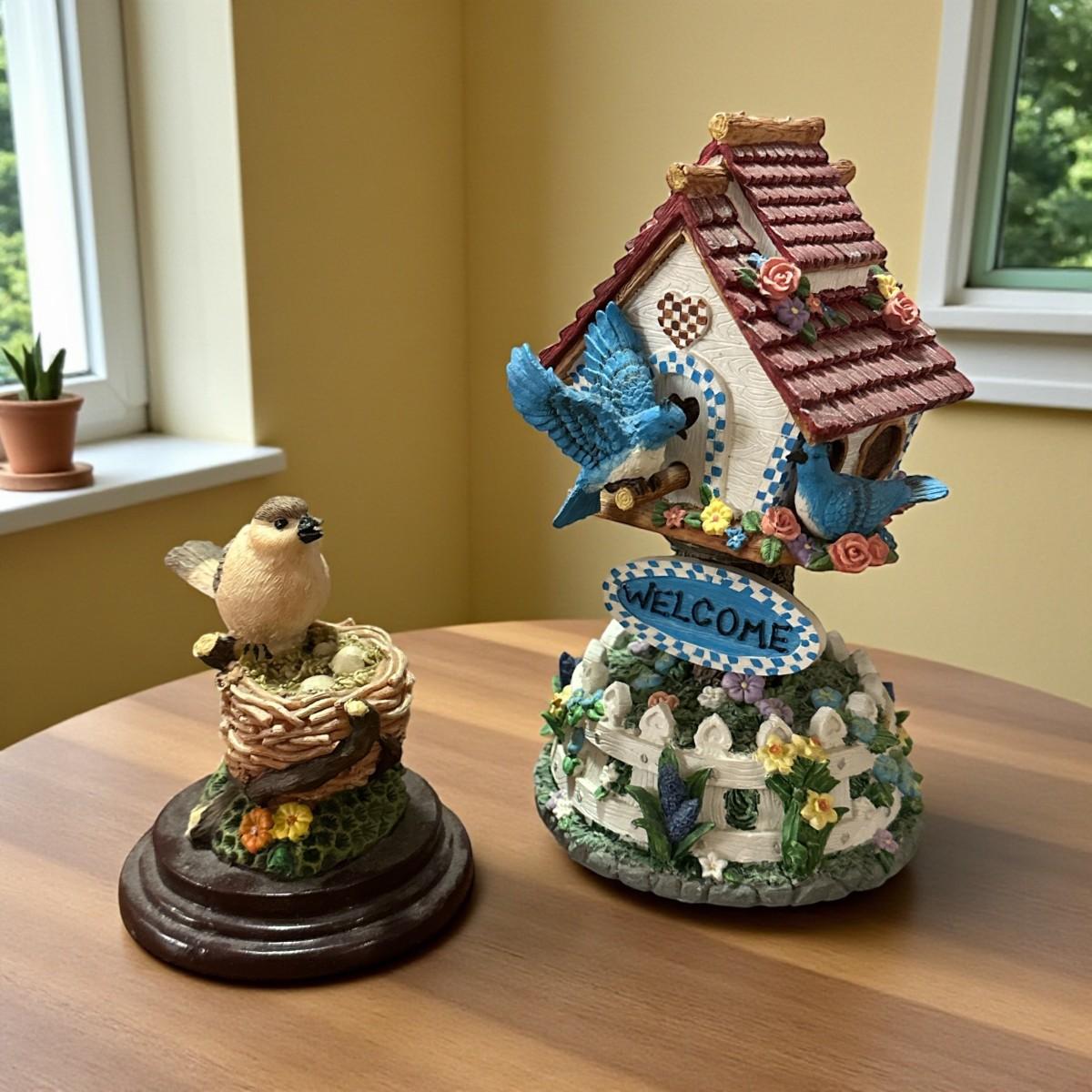 Lot of 2 Resin BIrd Items- Music Box Birdhouse "Welcome" and Figurine, no chips detected