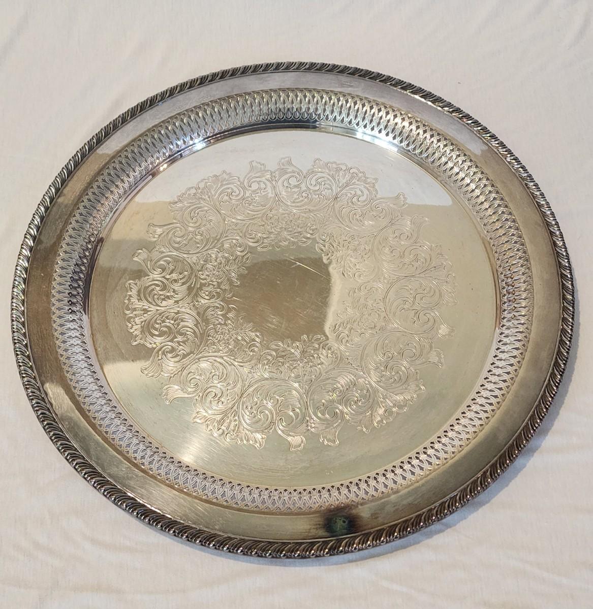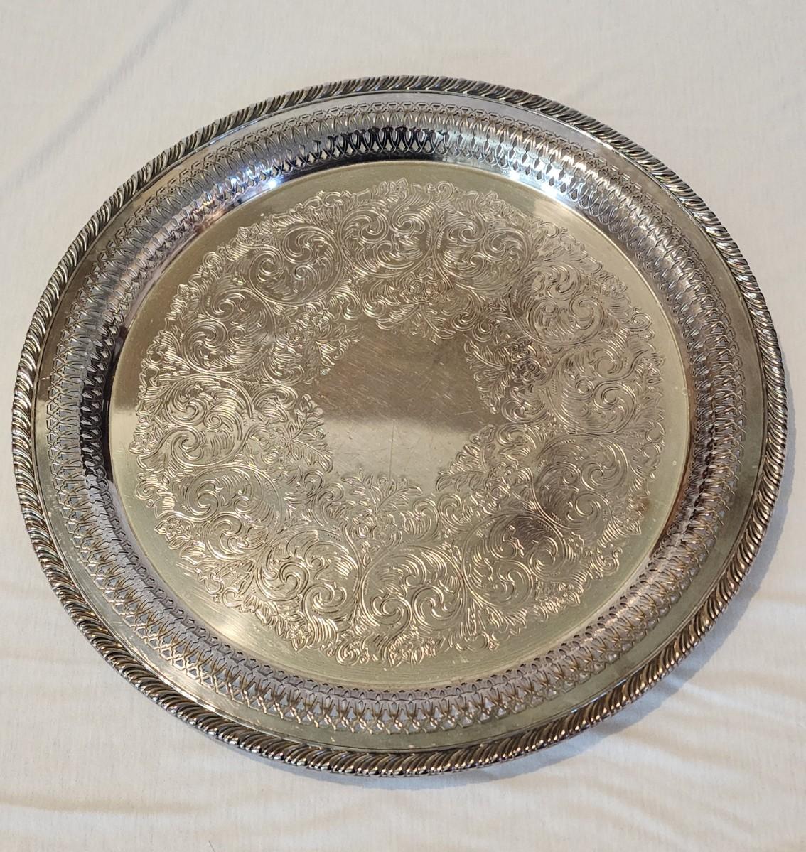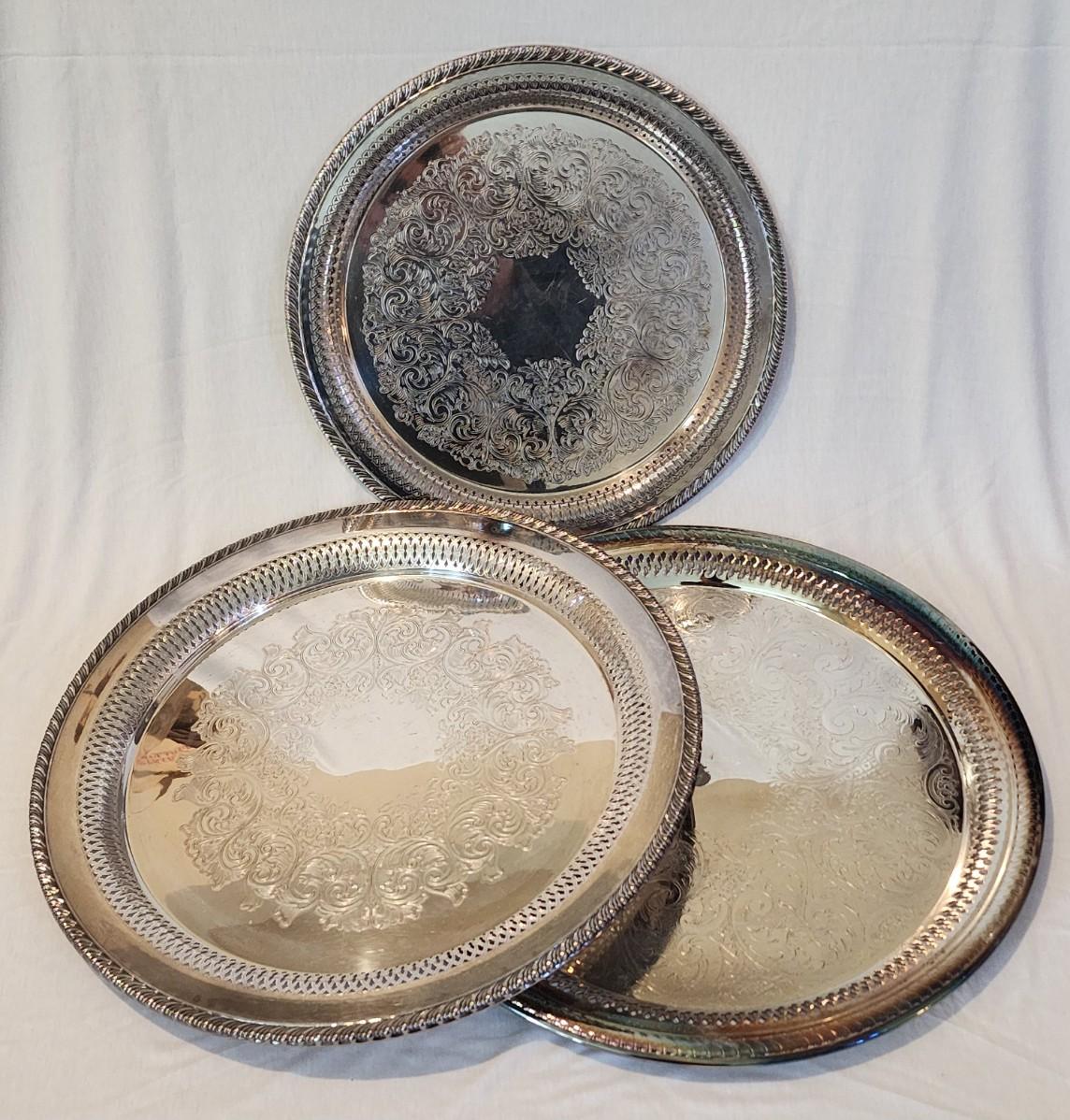 Three good condition ornately designed serving platters with light wear and utensil use.scratches. Small amount of tarnish but no pitting. One large tray has sticker residue in the center top.